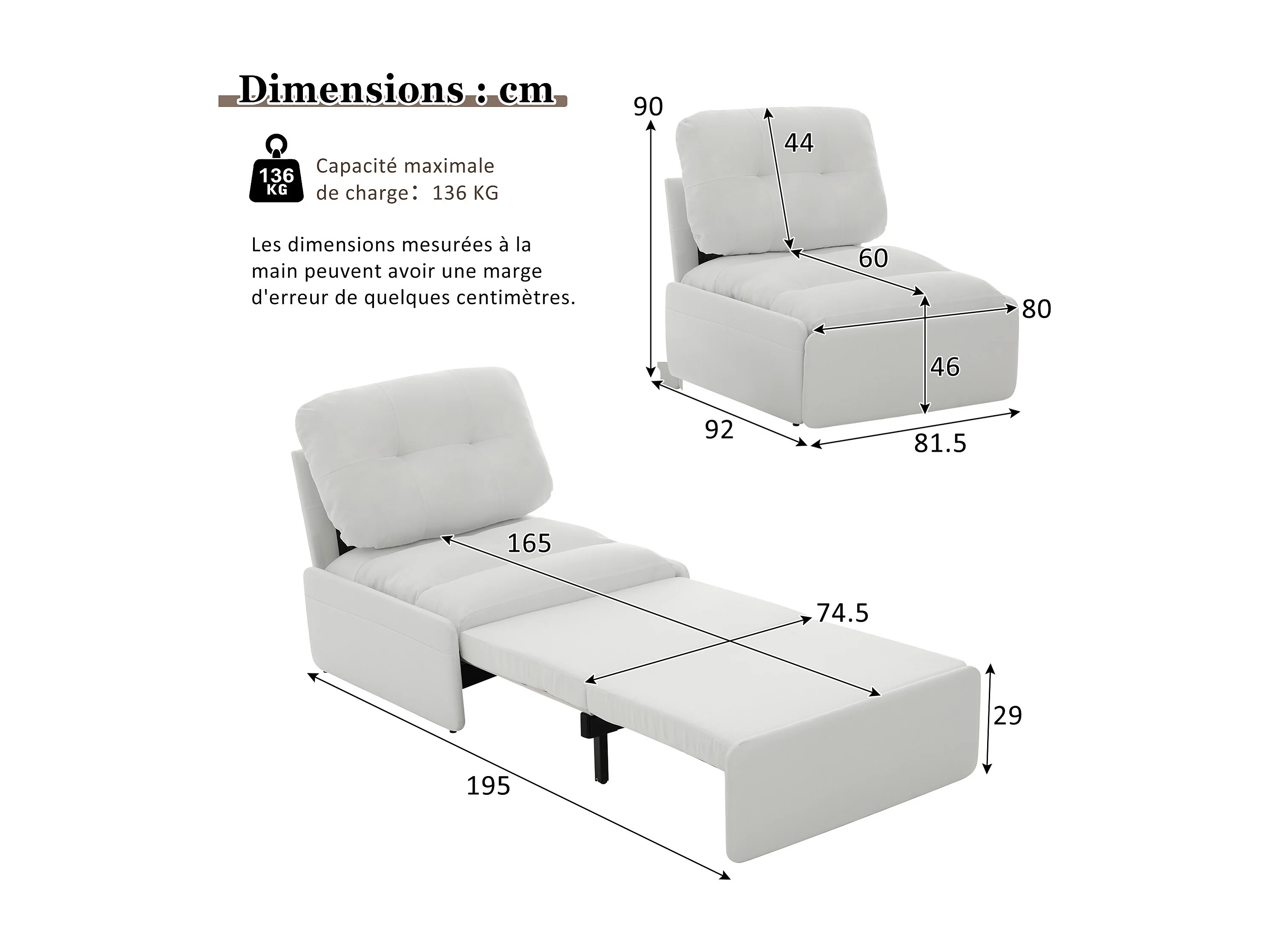 Canapé convertible moderne 2 en 1 - 195 x 81.5 x 90 cm - canapé-lit gigogne avec coussin - lin - blanc