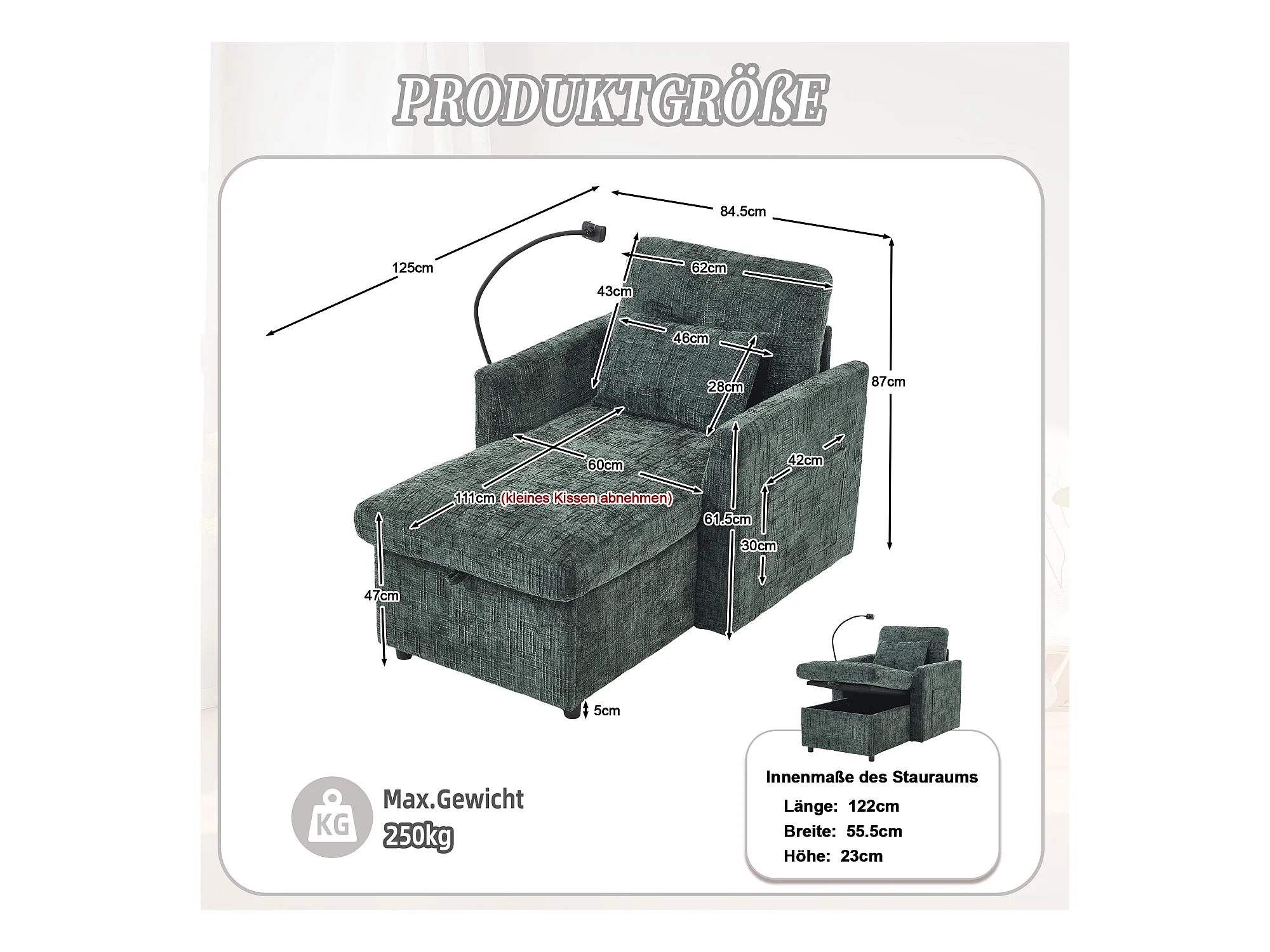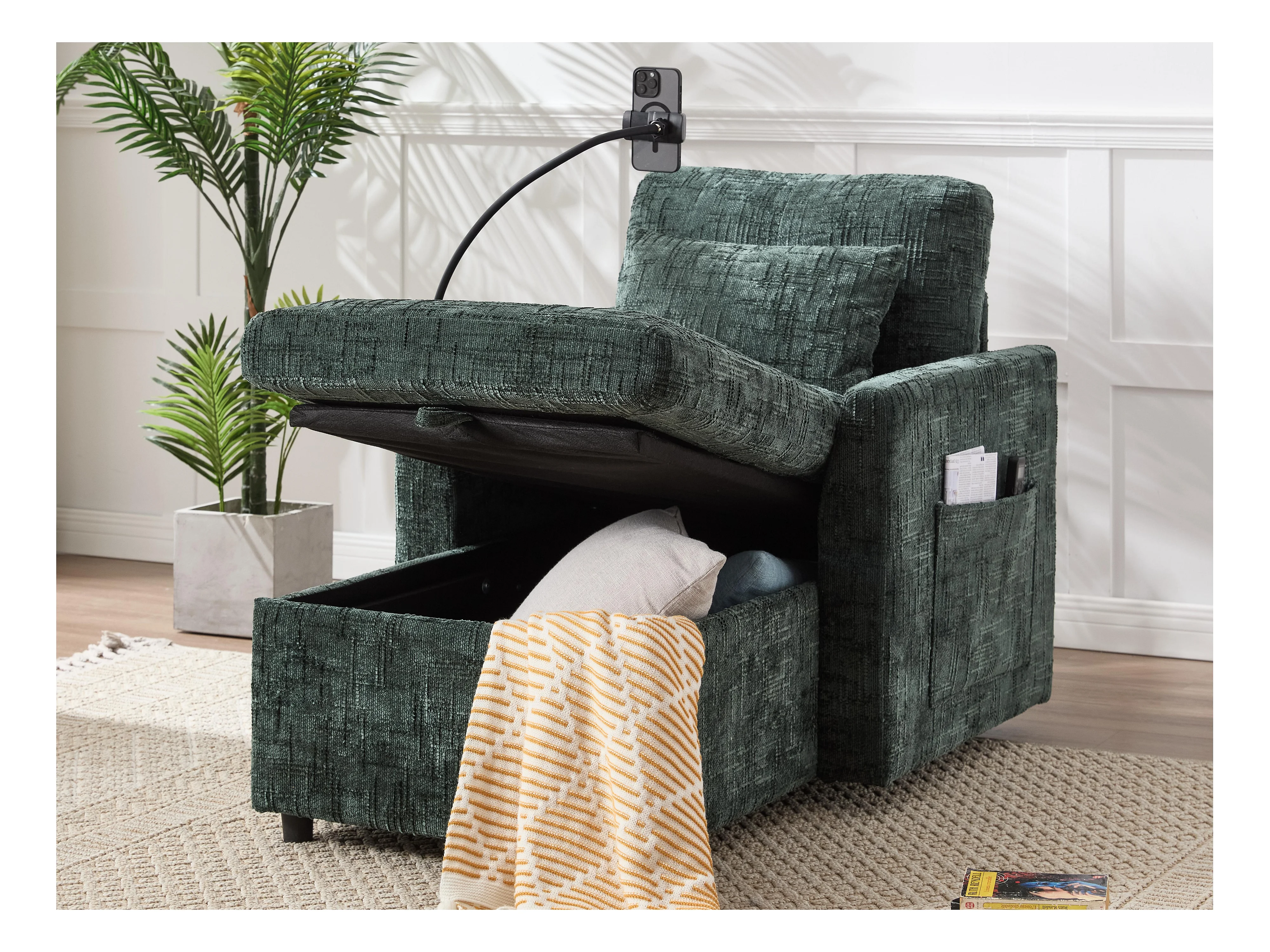 Canapé convertible noir en tissu chenille - avec support pour téléphone et rangement intégré - Idéal pour salon, bureau ou chambre