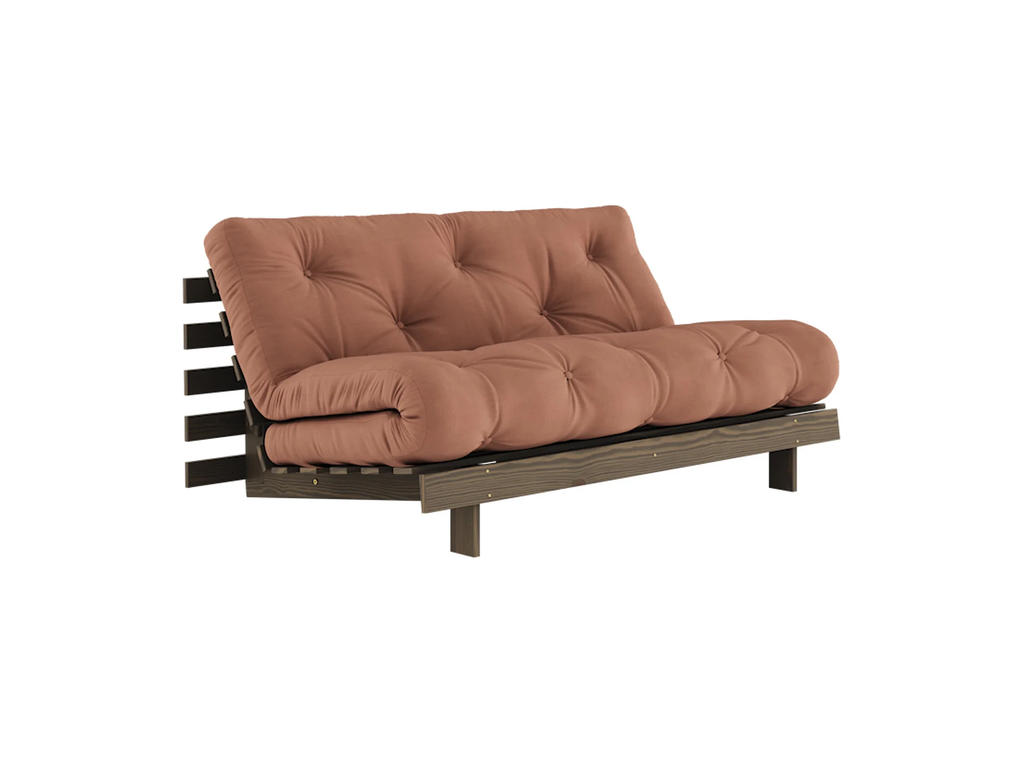 Canapé convertible ROOTS en pin massif foncé et matelas futon marron noisette 160x200
