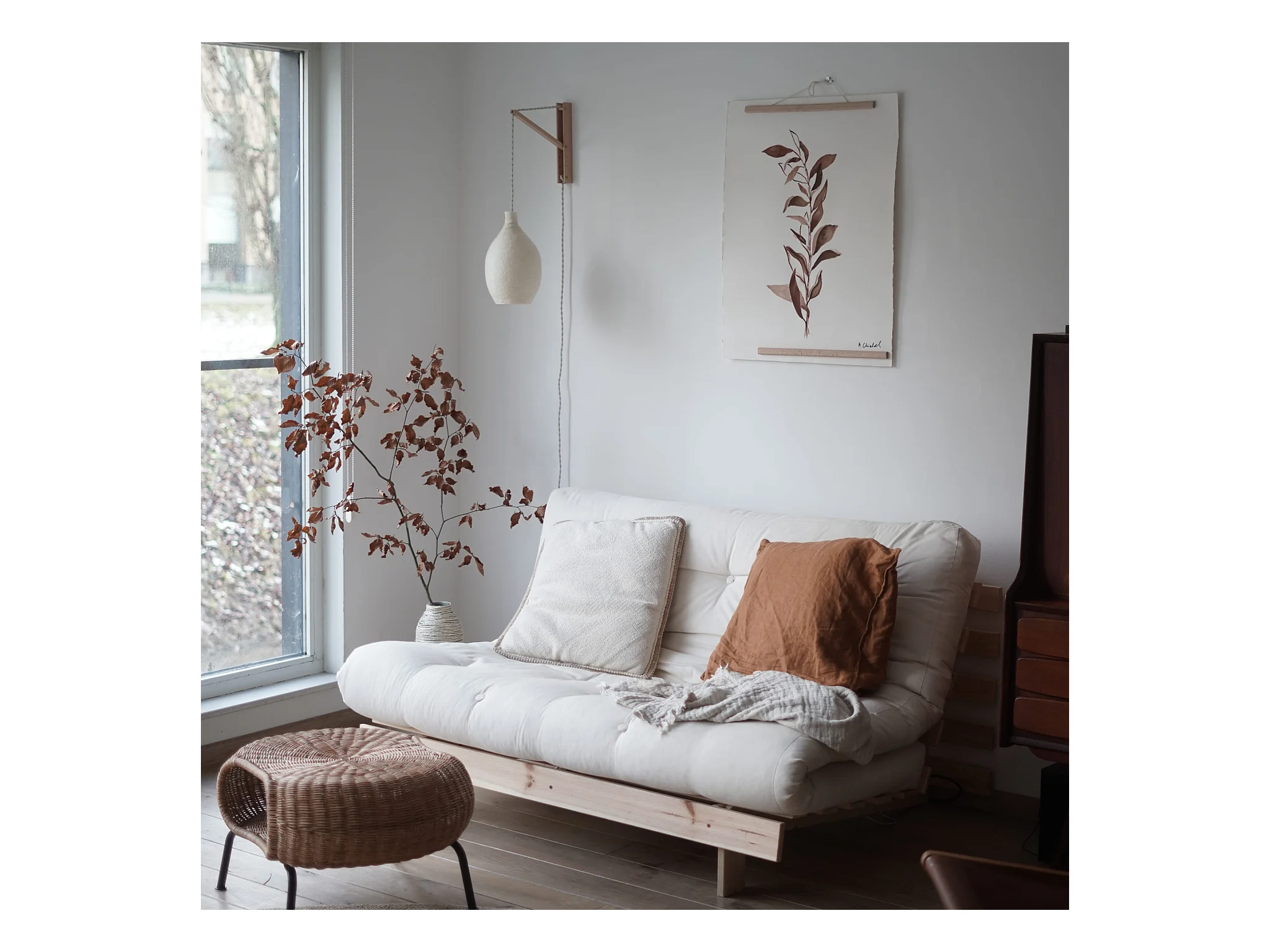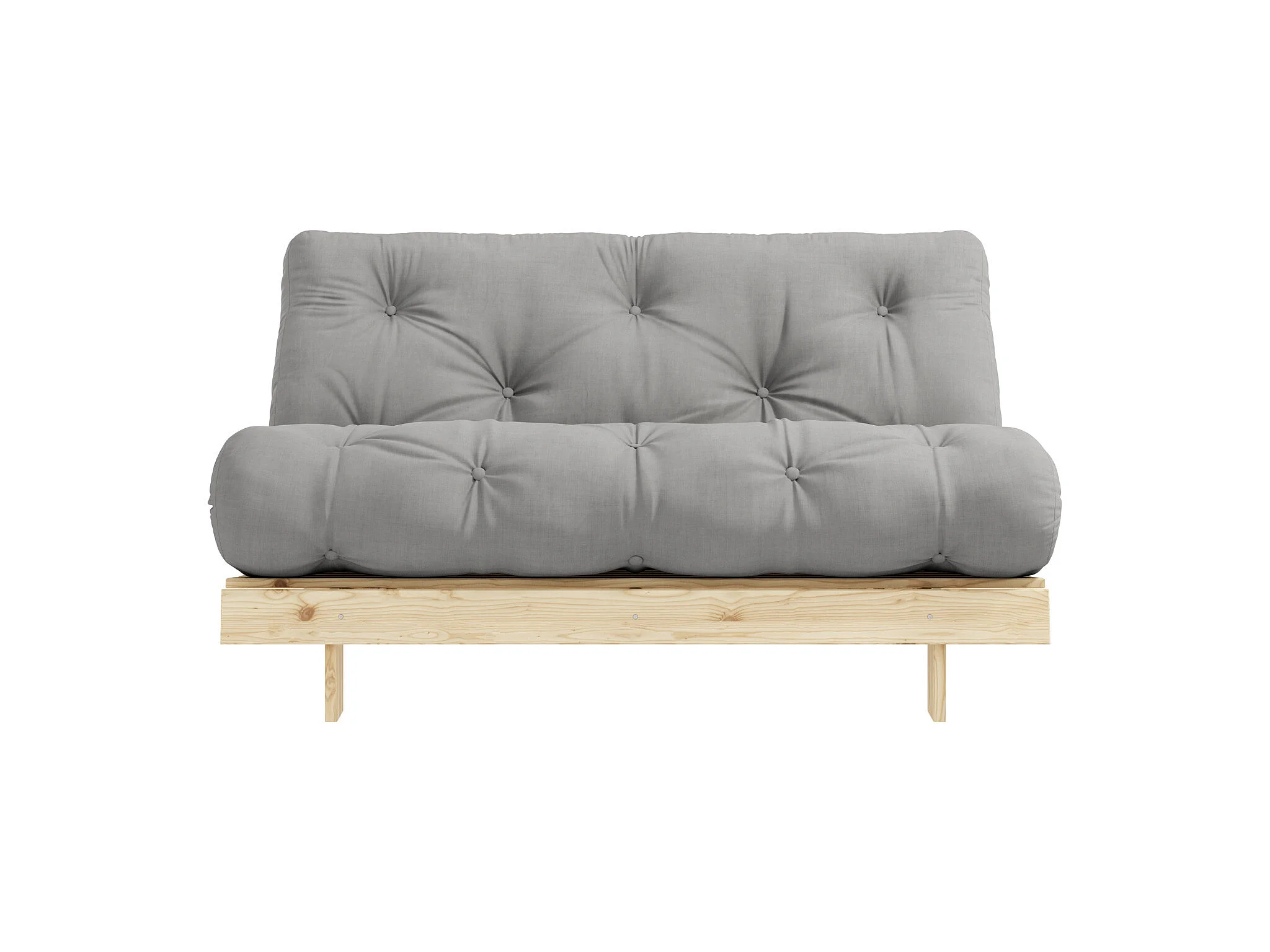 Canapé convertible ROOTS en pin massif naturel avec matelas futon gris 140x200