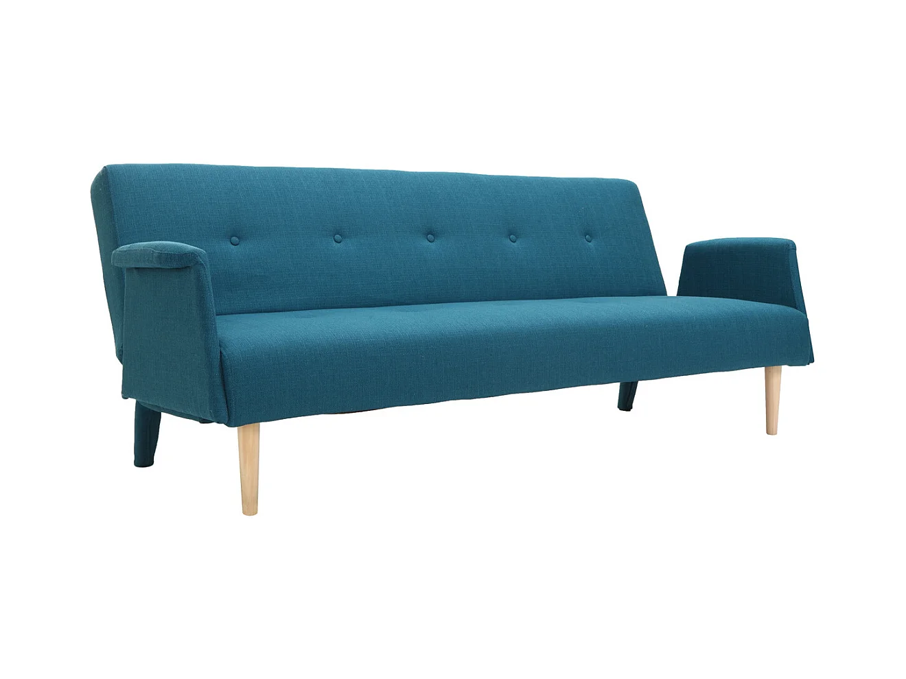 Canapé convertible scandinave 3 places en tissu bleu canard et bois clair OSCAR