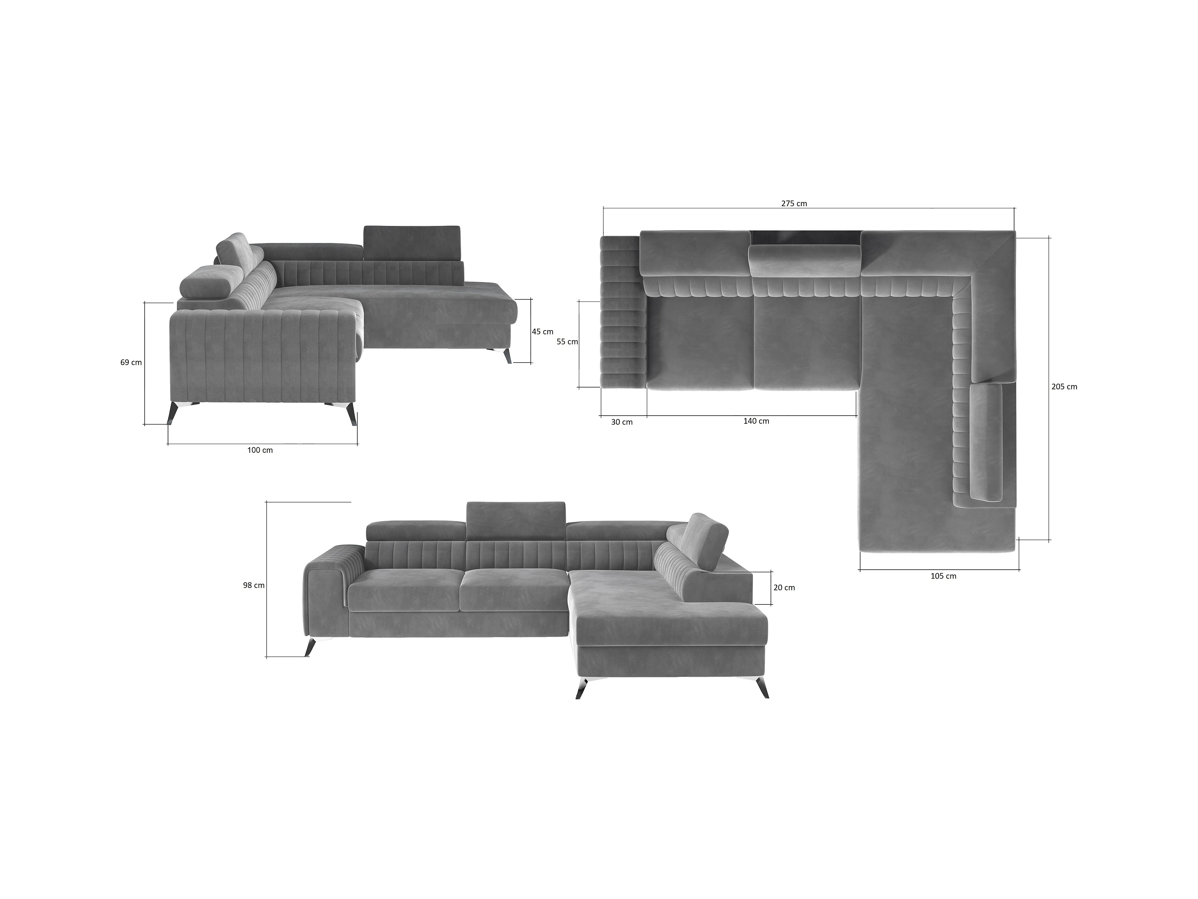 Canapé angle gauche convertible avec appuis-tête réglables velours gris foncé Lozan 275cm
