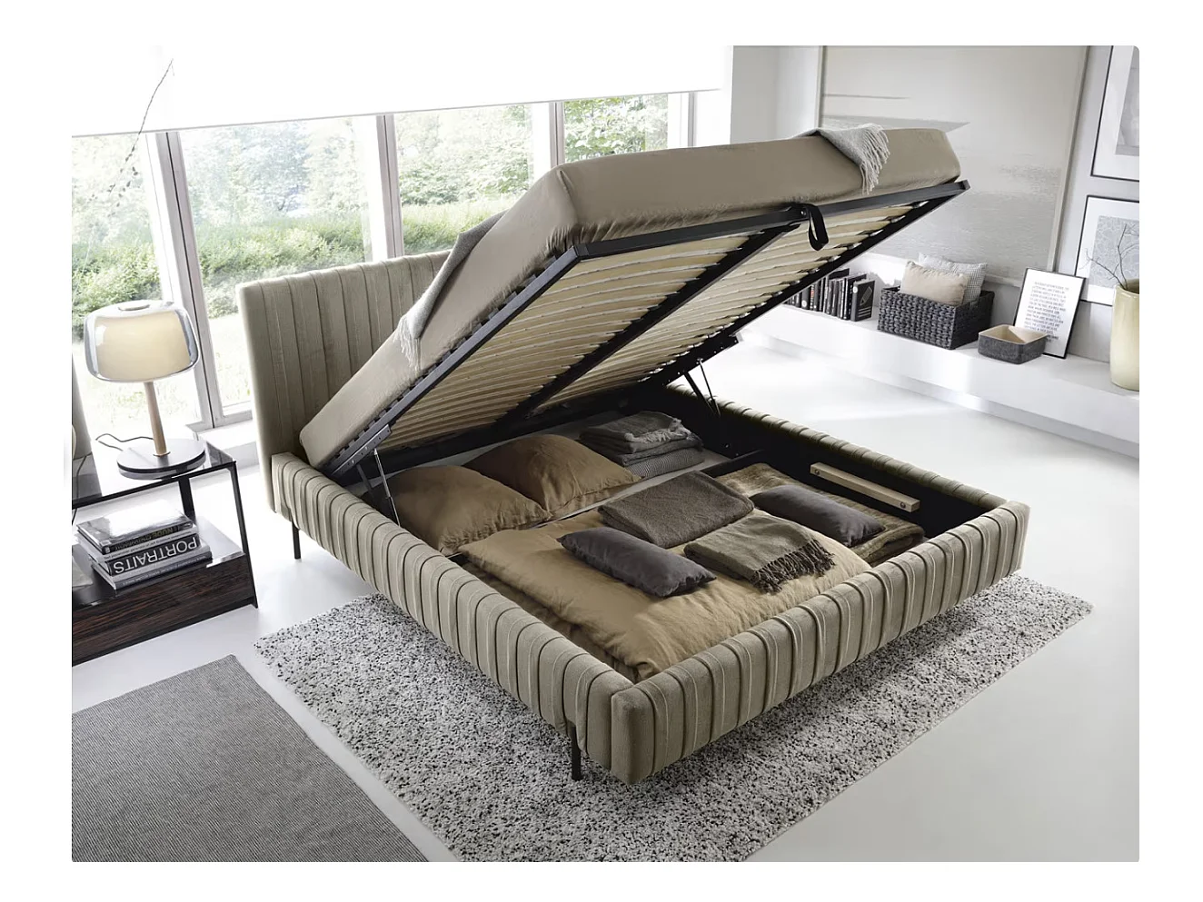 Lit coffre Plika prestige – Design et tissu pour un confort absolu-Couleur Marron clair-160x200