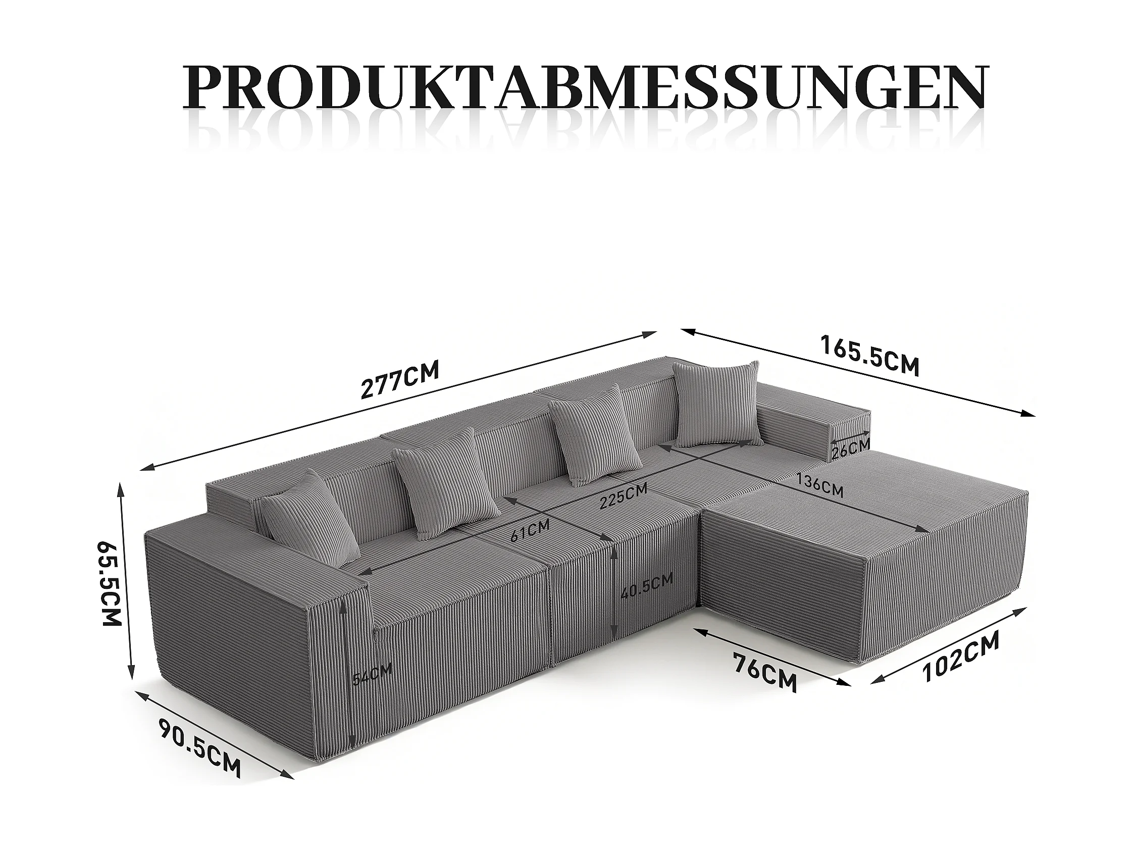 Canapé d’angle 3 places en tissu velours côtelé gris avec pouf - Sans montage