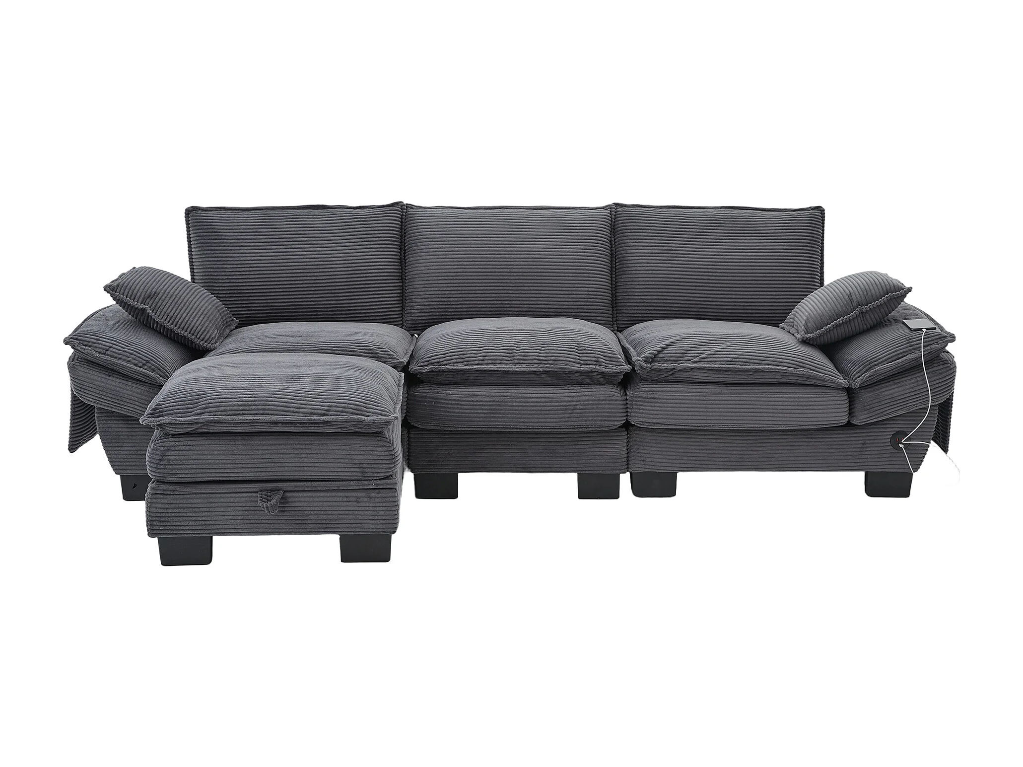 Canapé d'angle 3 places modulable avec pouf, USB-C et poches latérales - Velours côtelé gris foncé