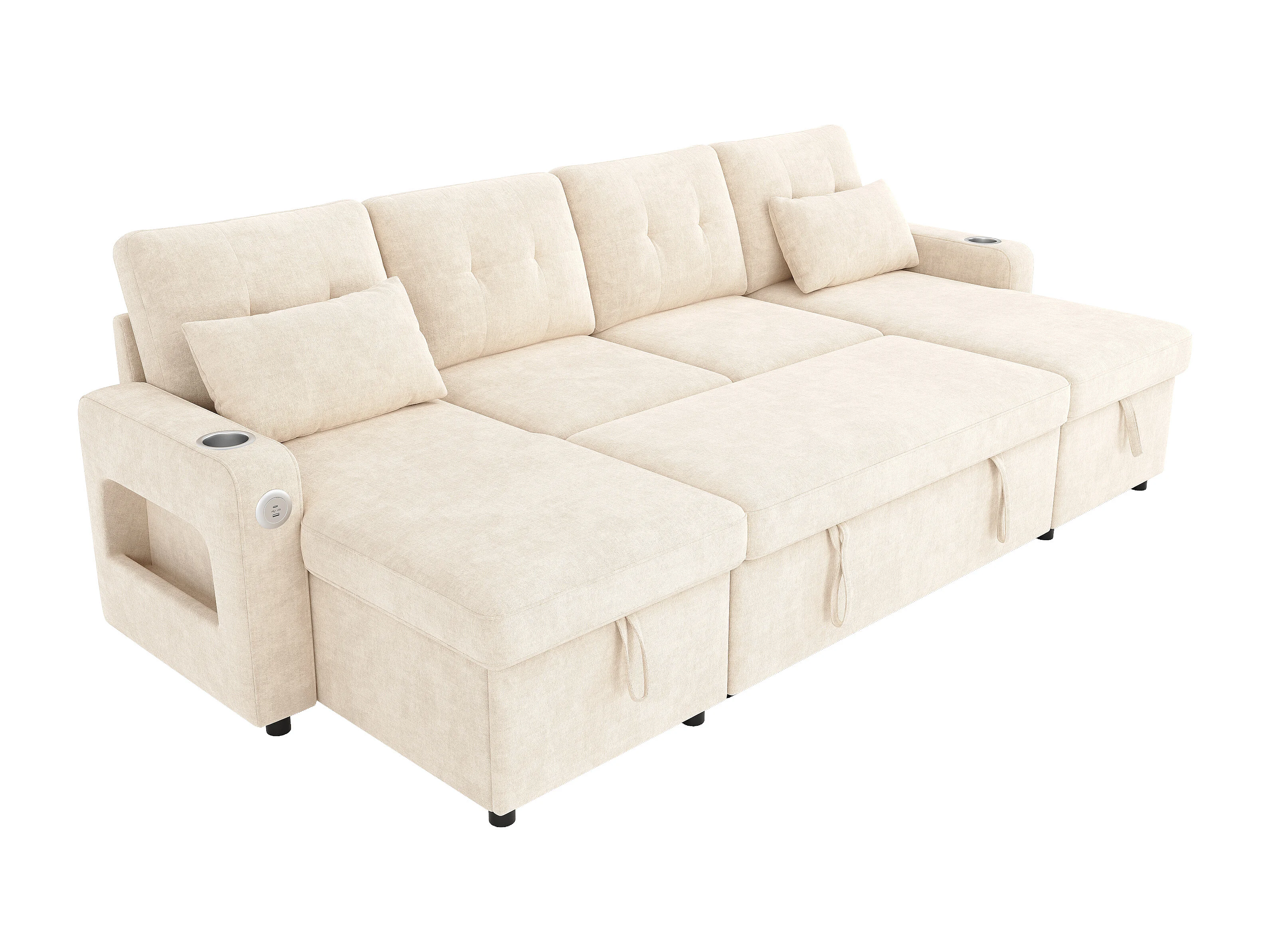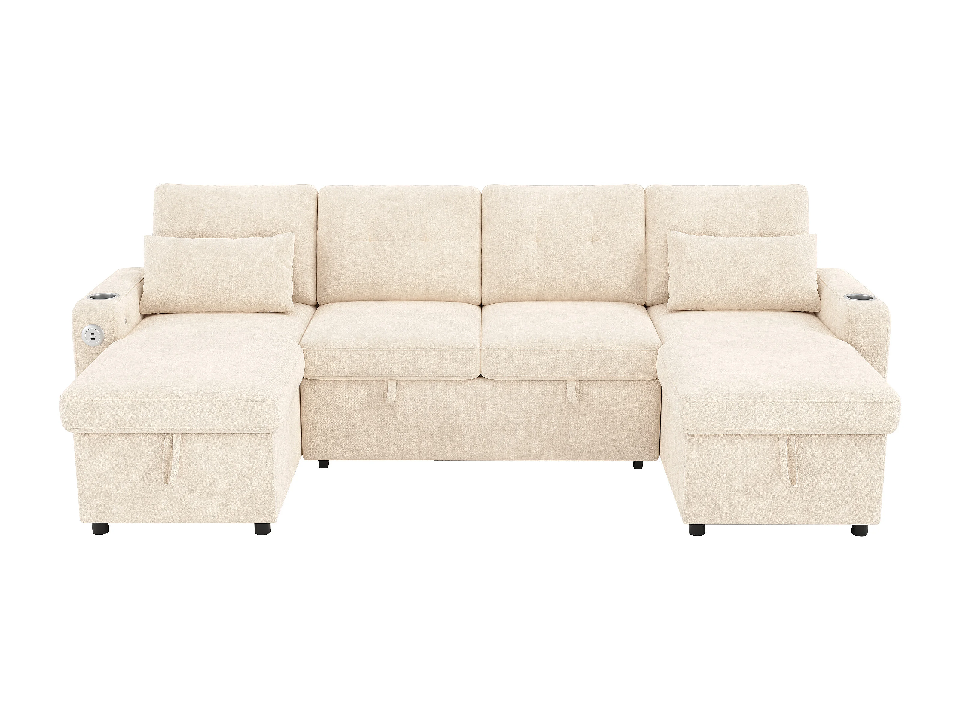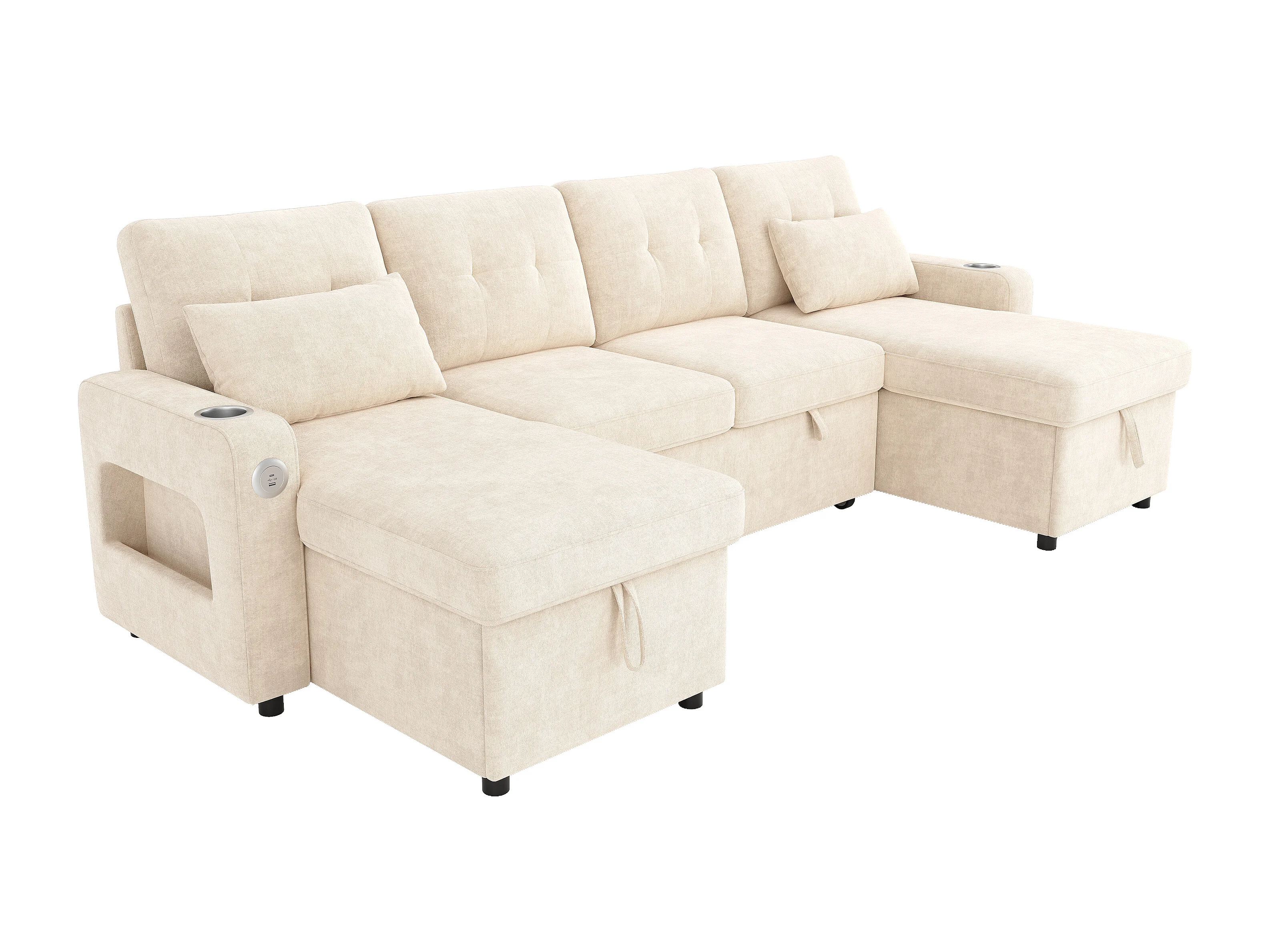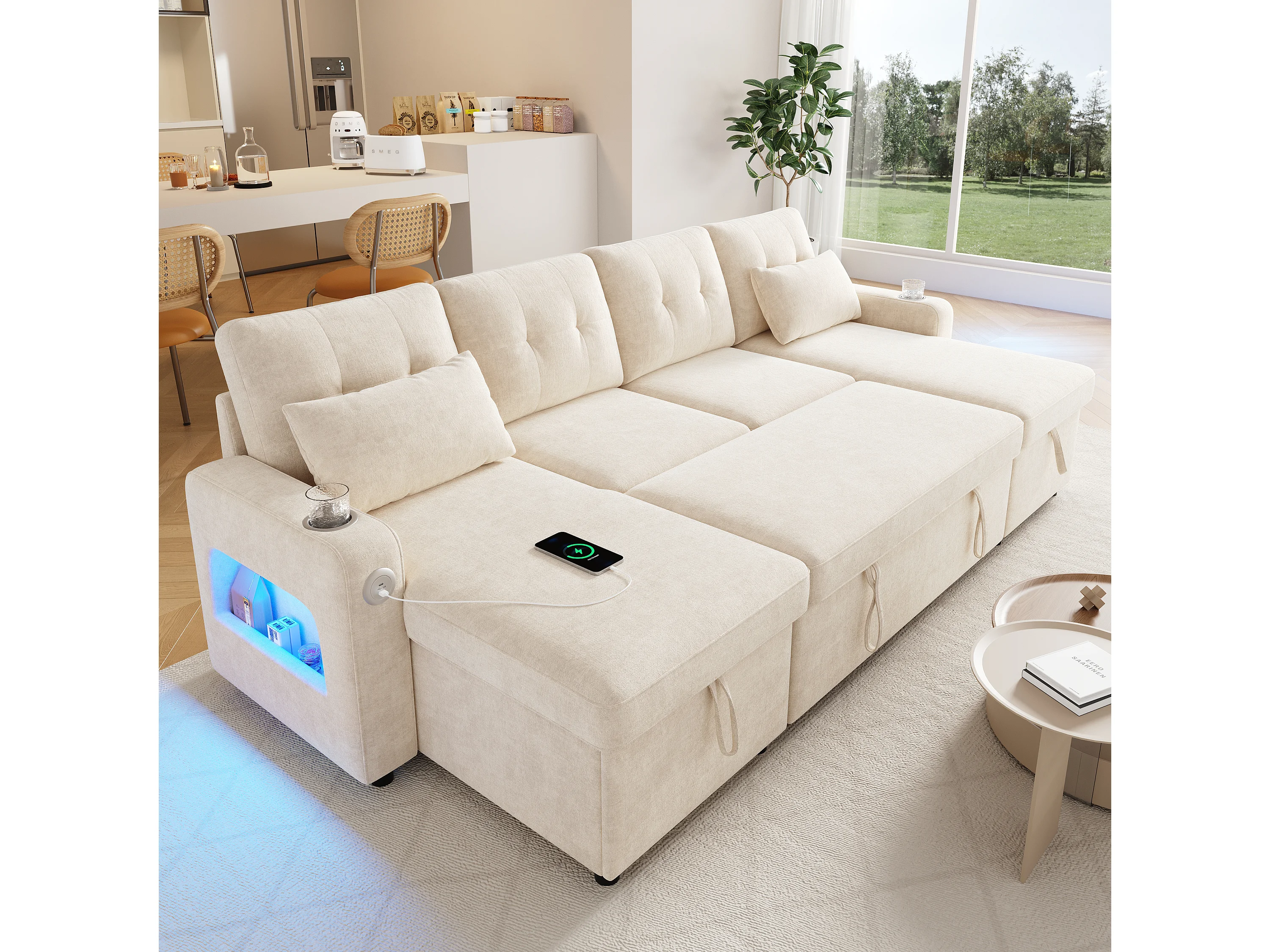 Canapé d'angle 4 places - avec rangement - avec porte-gobelet - avec port USB - avec éclairage LED - beige