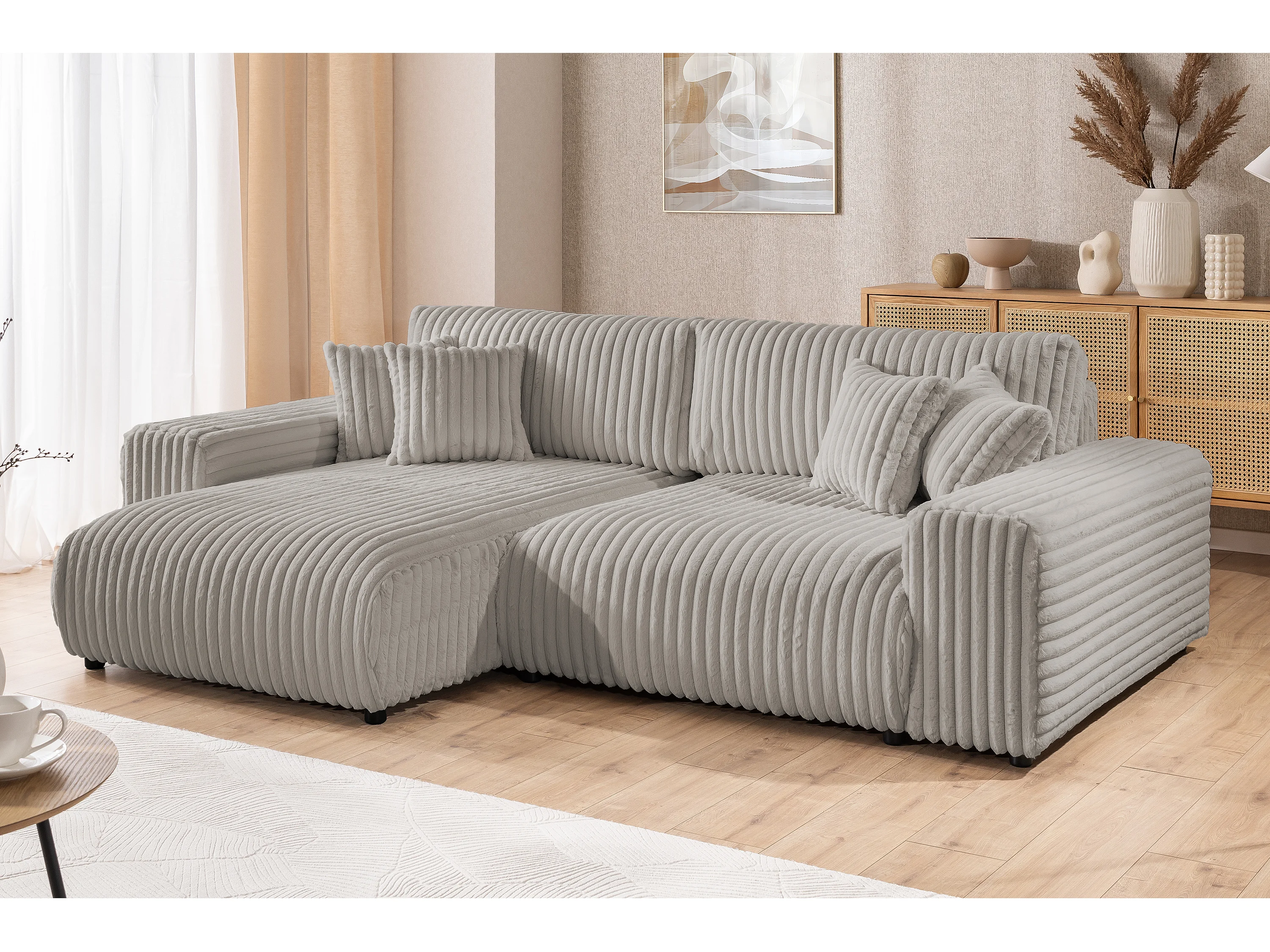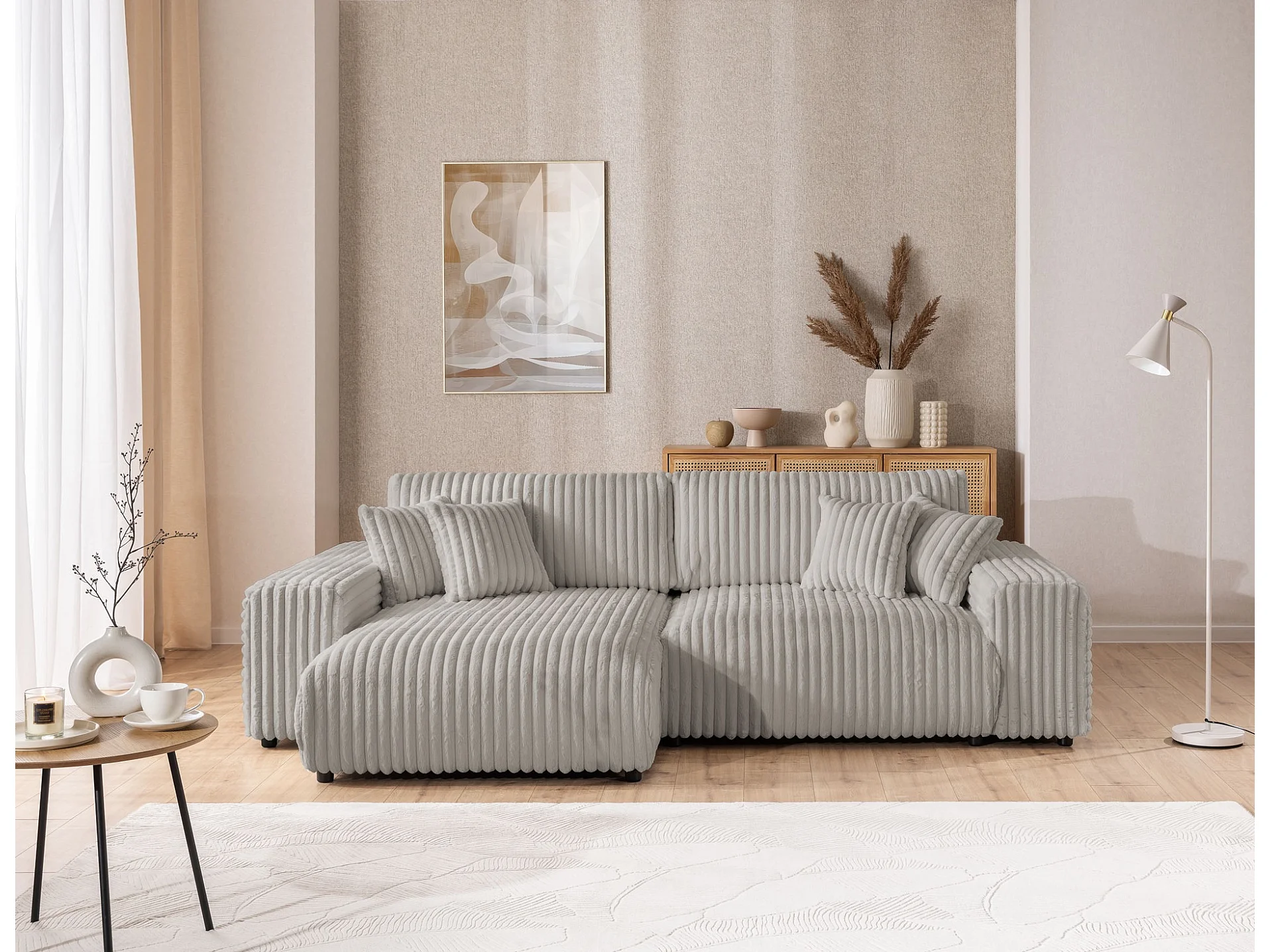 Canapé d’angle avec fonction couchage et coffre de rangement en velours côtelé pelucheux gris clair MOLLIS