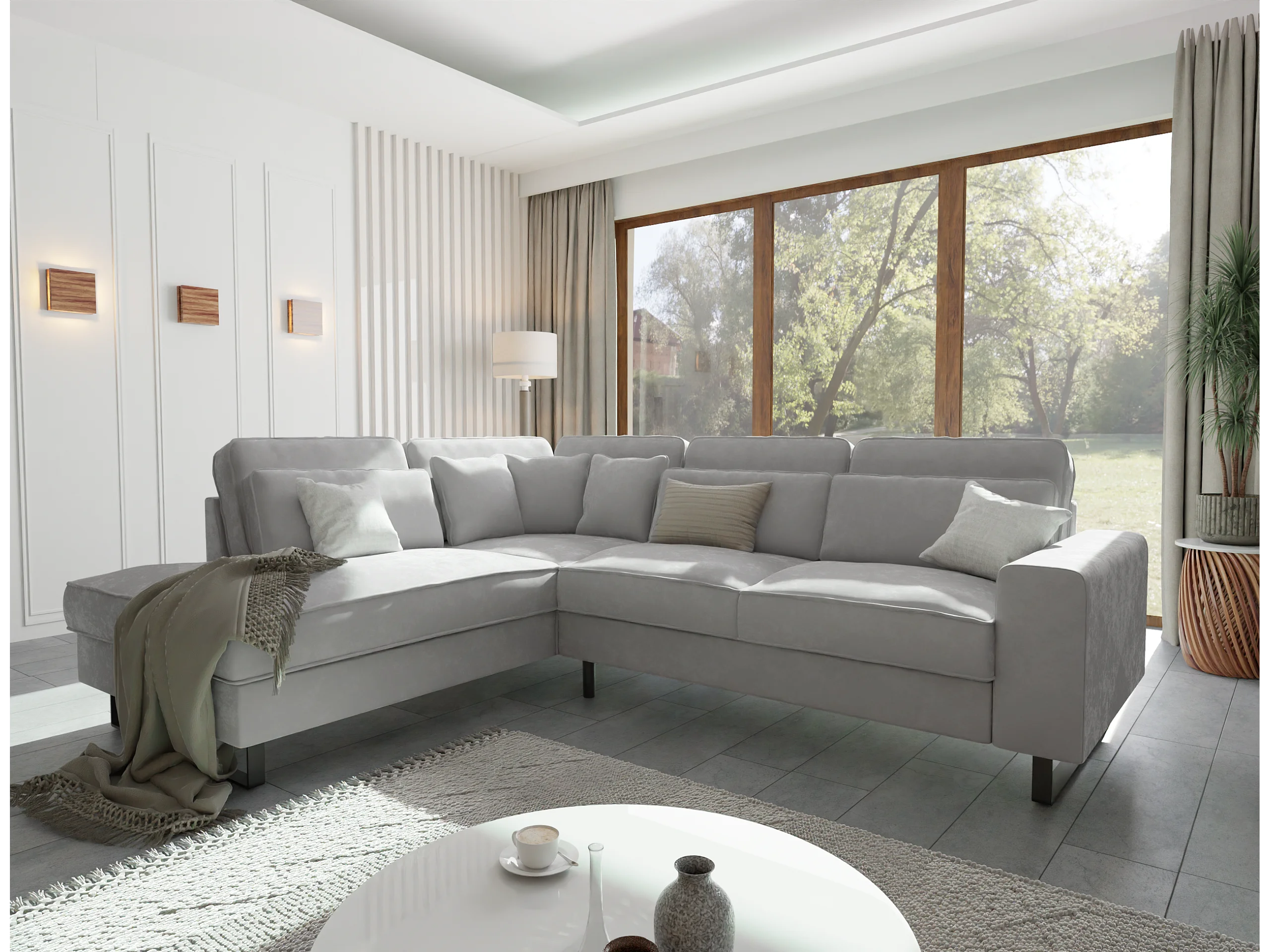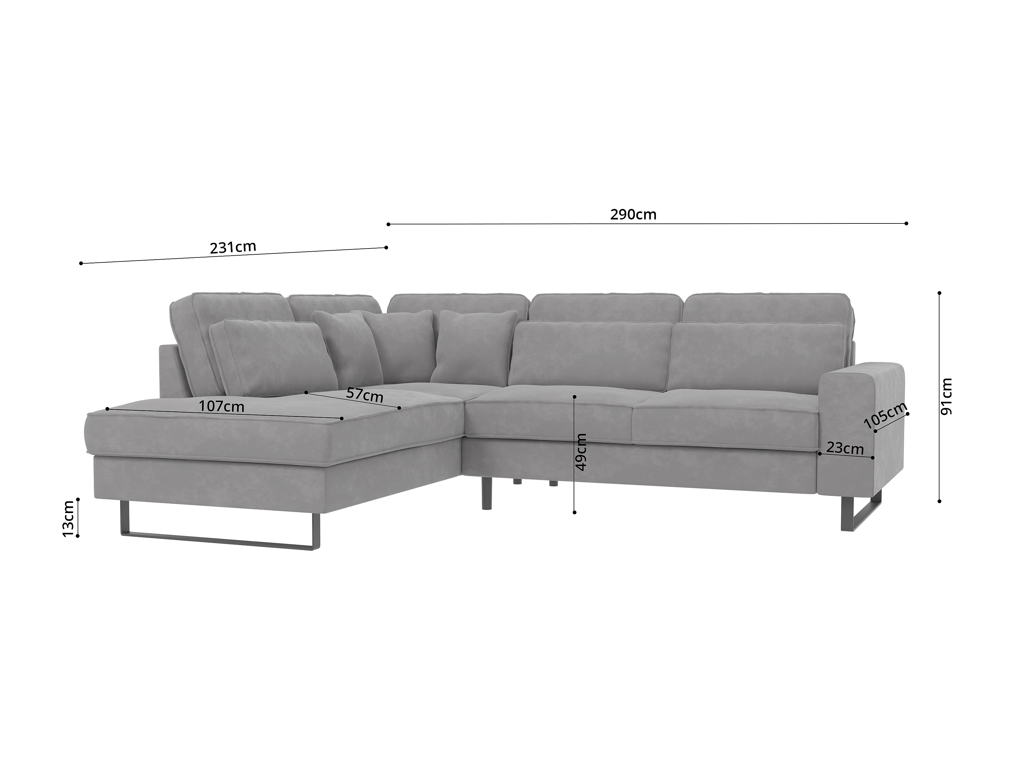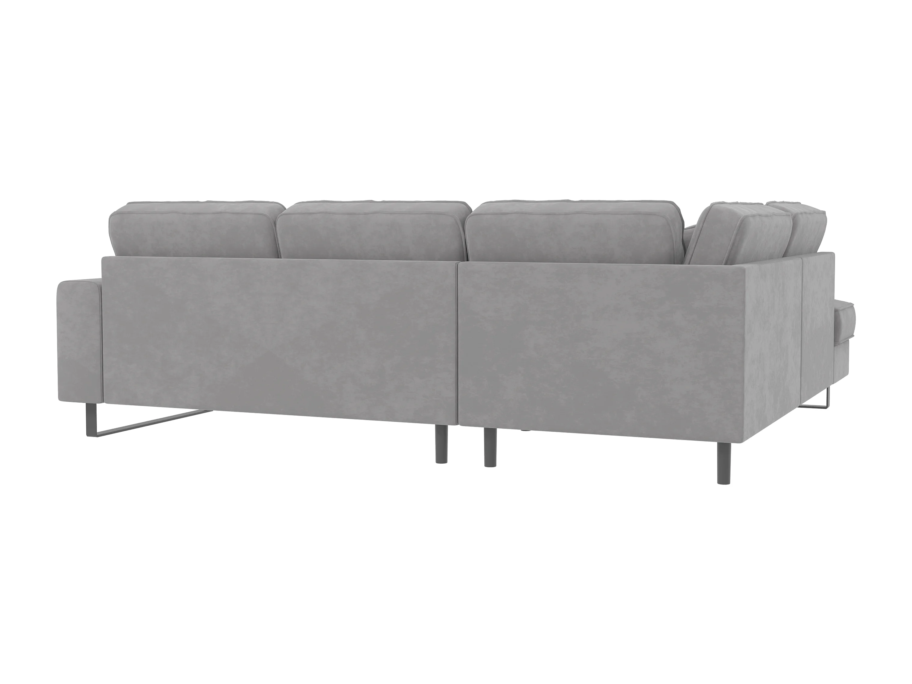 Canapé d’angle avec ottomane et pieds en métal noir, en tissu velours gris clair ROGUE