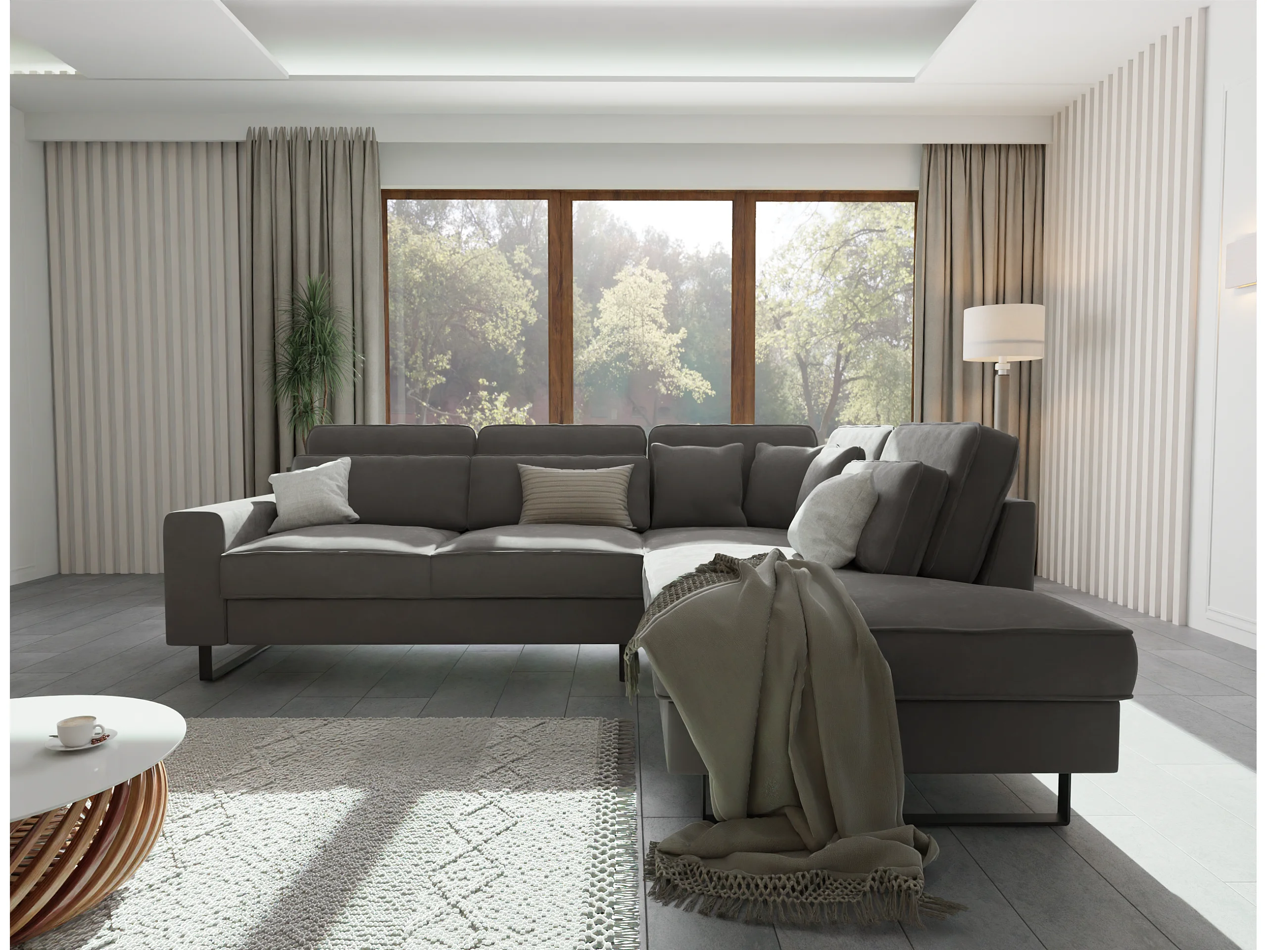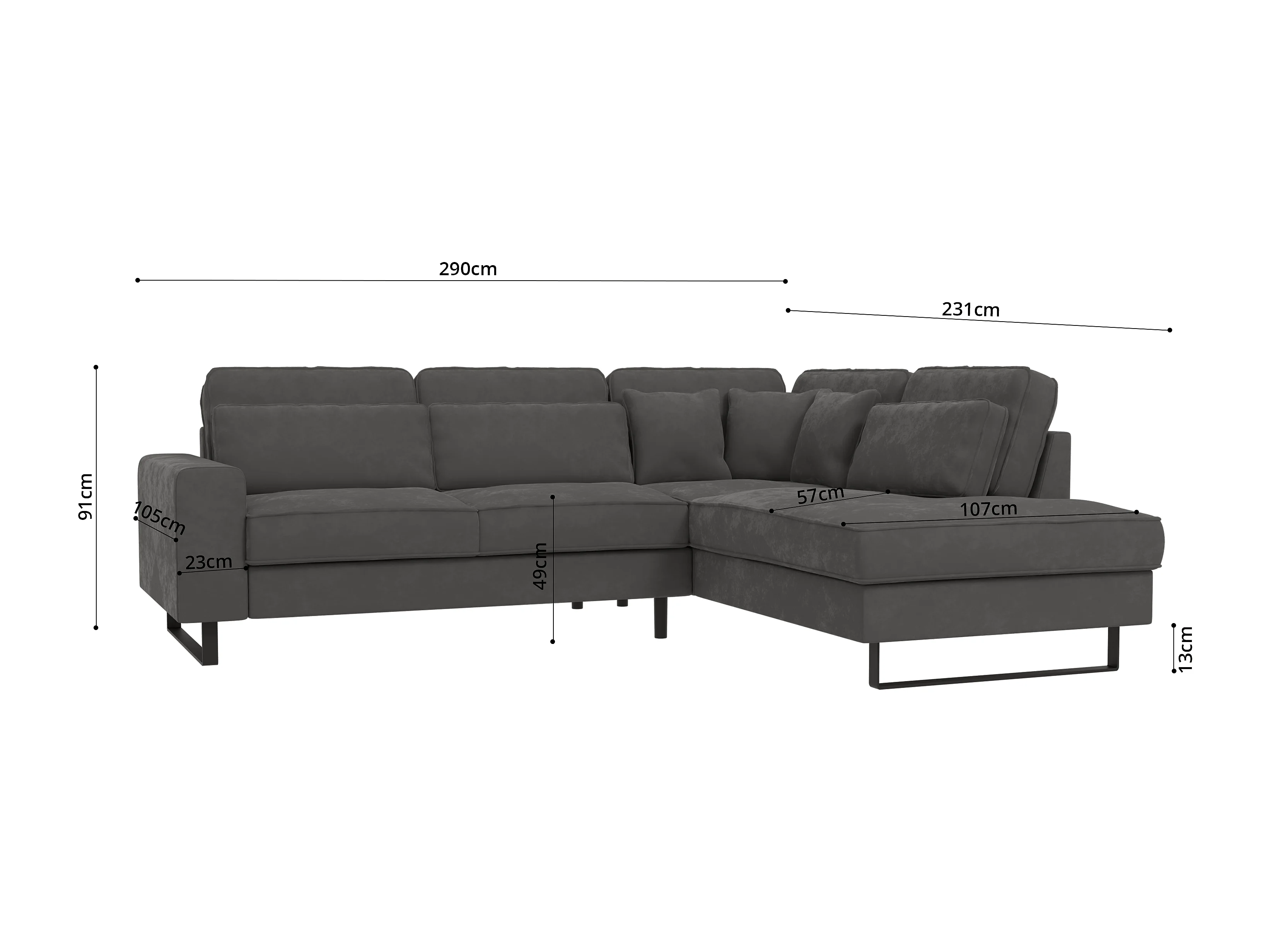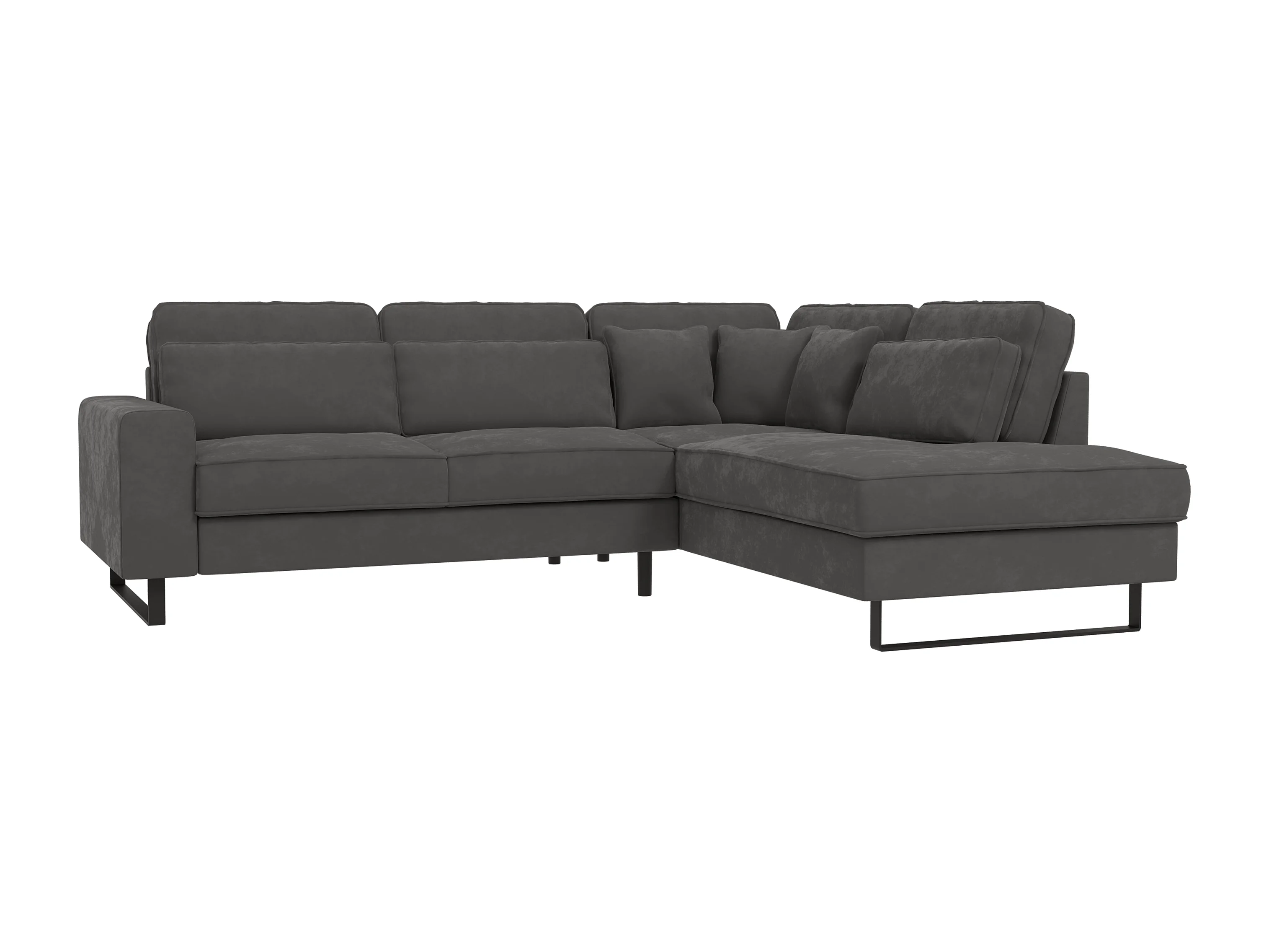 Canapé d’angle avec ottomane et pieds en métal noir, en tissu velours gris ROGUE