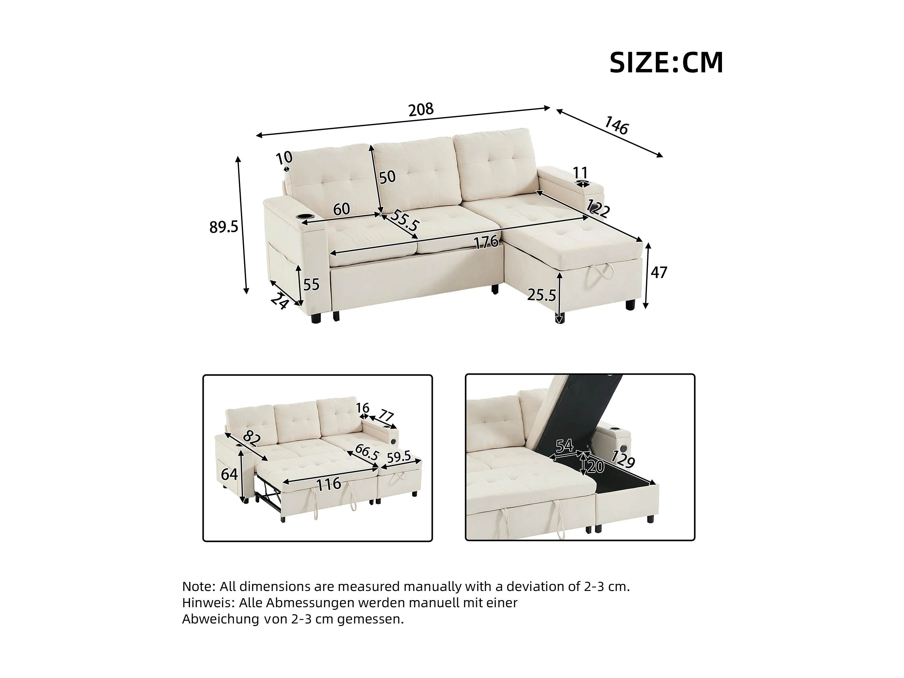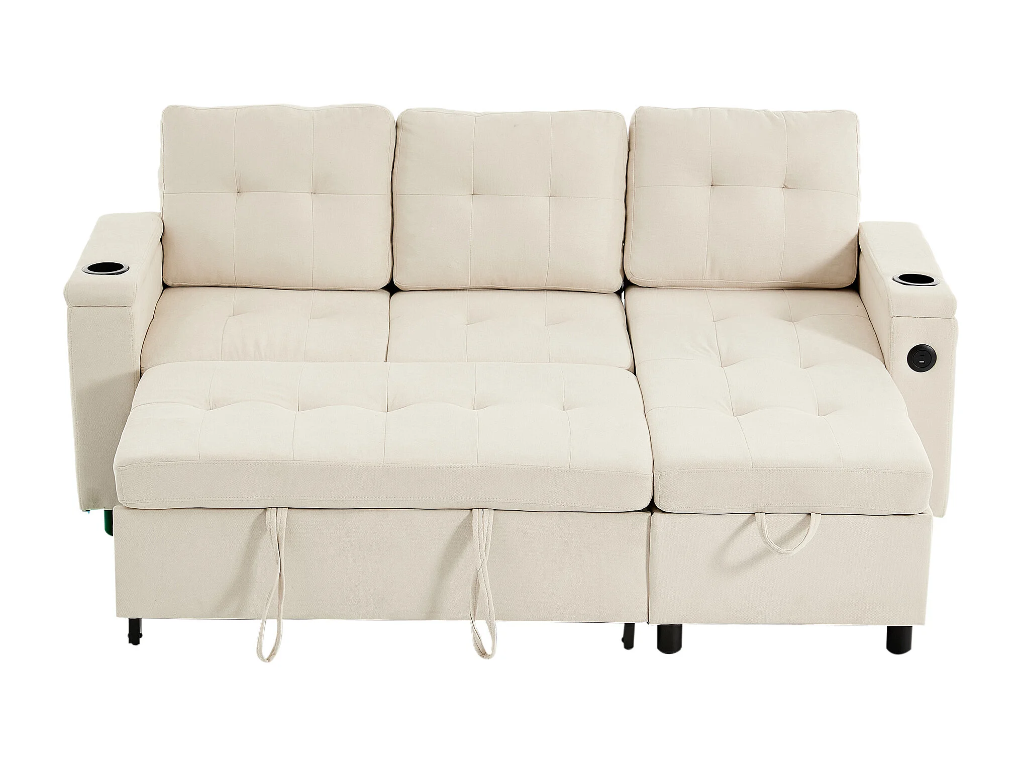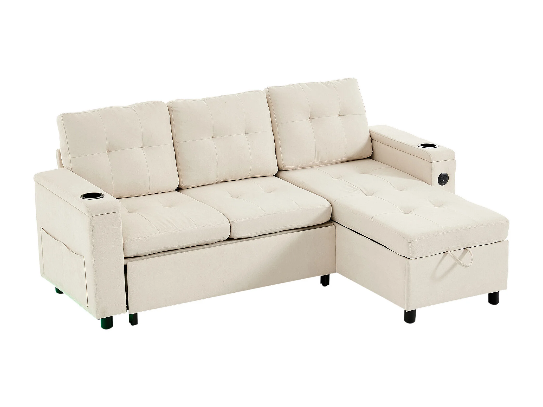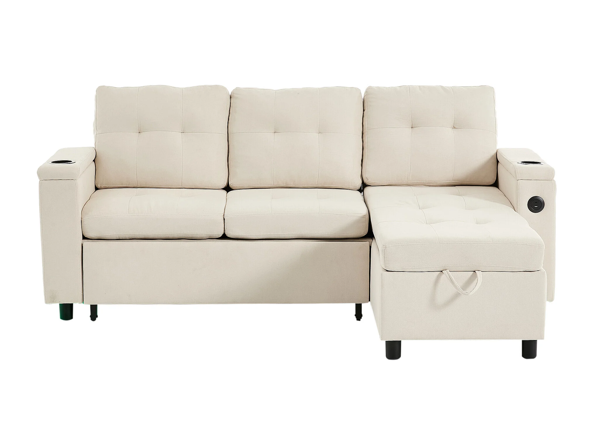 Canapé d'angle convertible 3 places avec LED, rangement, ports USB - Tissu beige