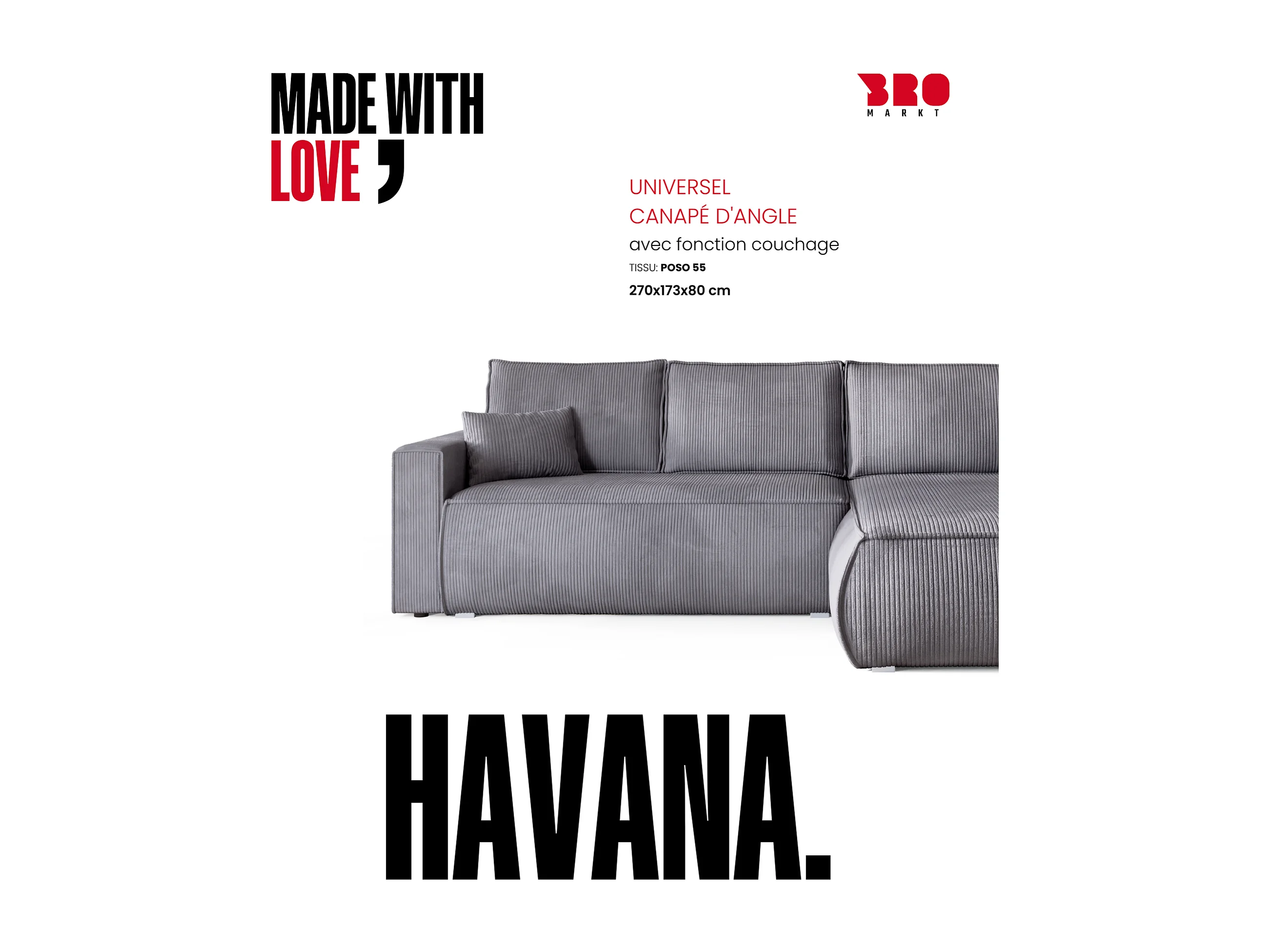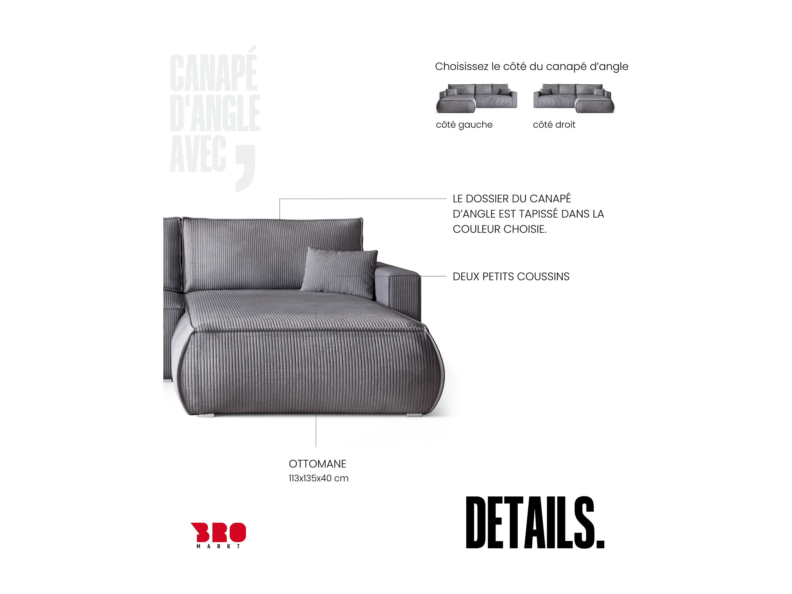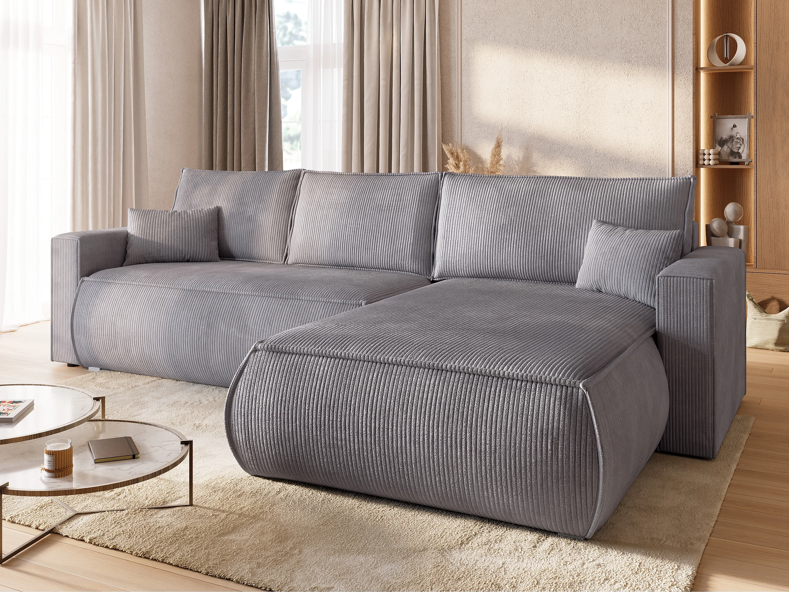 Canapé d'angle convertible, en velours côtelé HAVANA Gris Clair