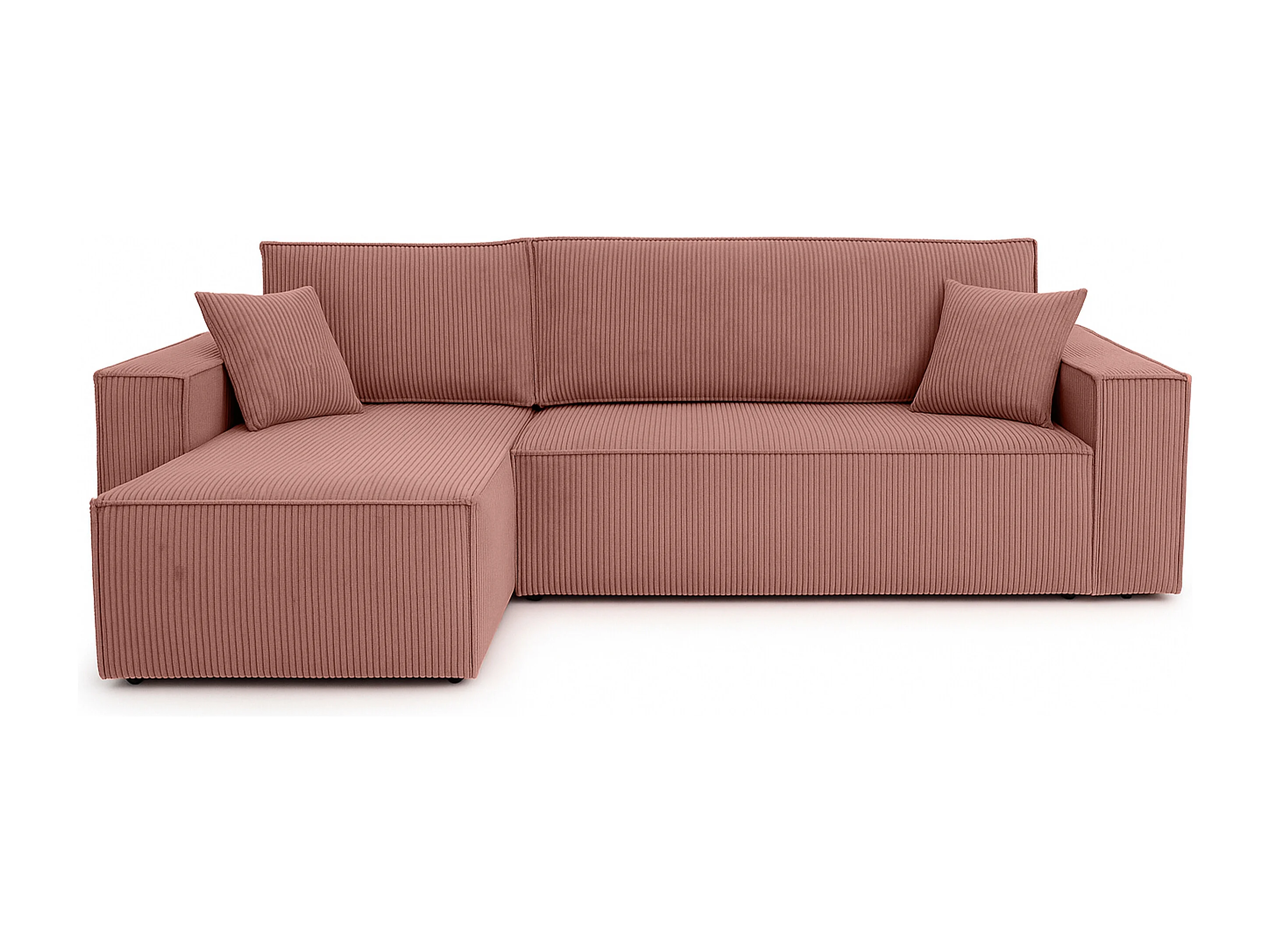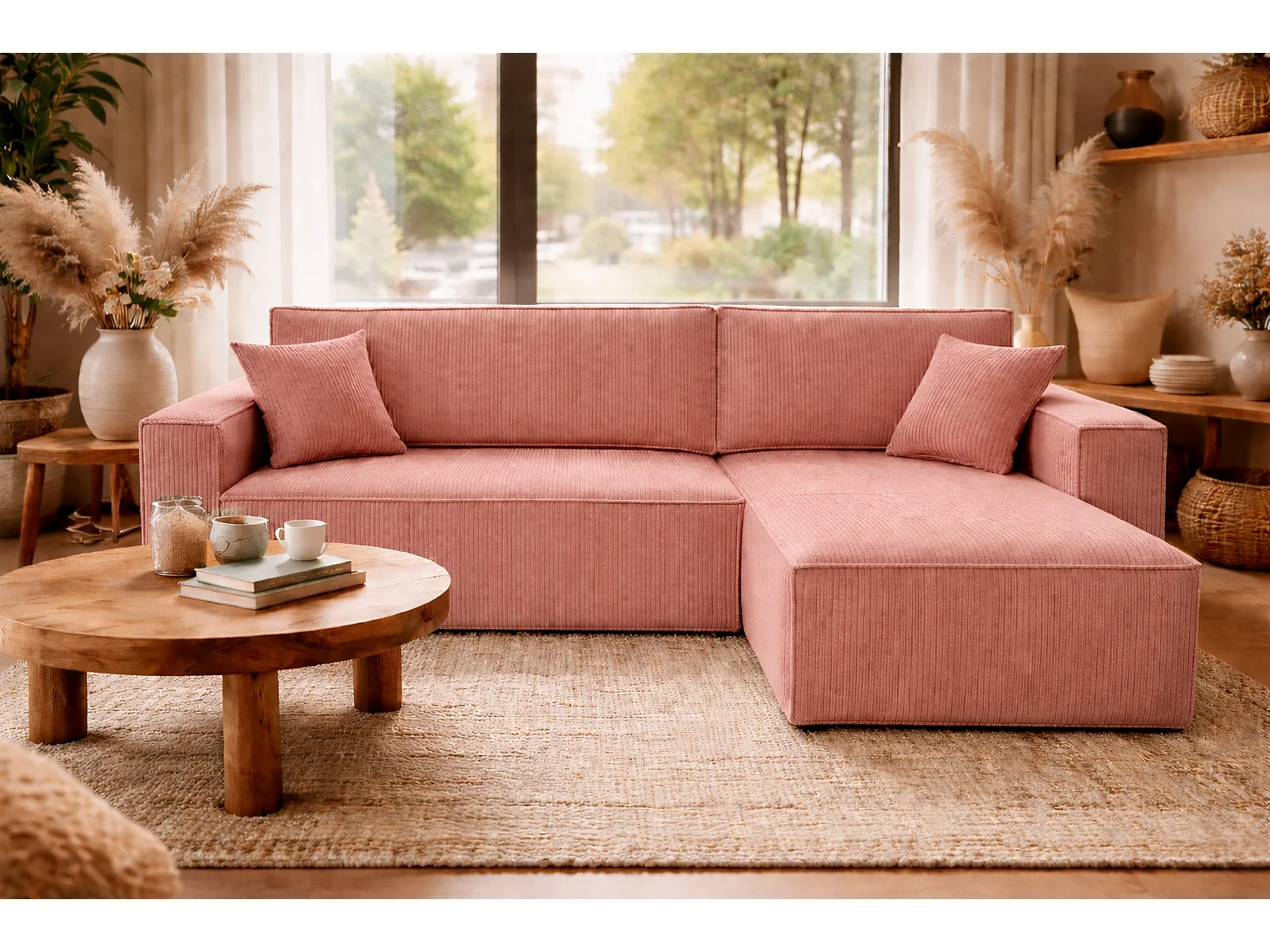 Canapé d’angle convertible réversible, velours côtelé beige, grand coffre de rangement, fonction couchage, montage universel gauche/droite CARLOS L - VINOTTI