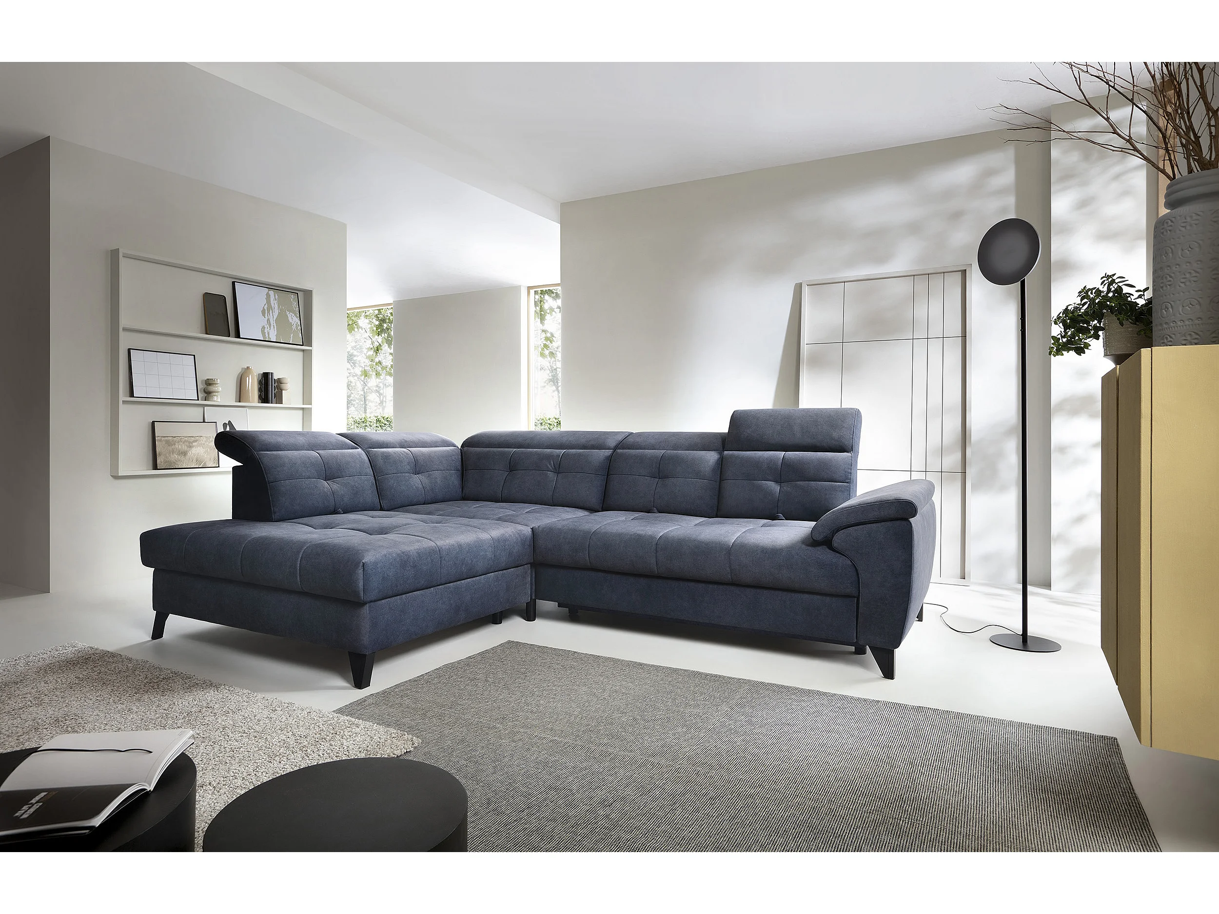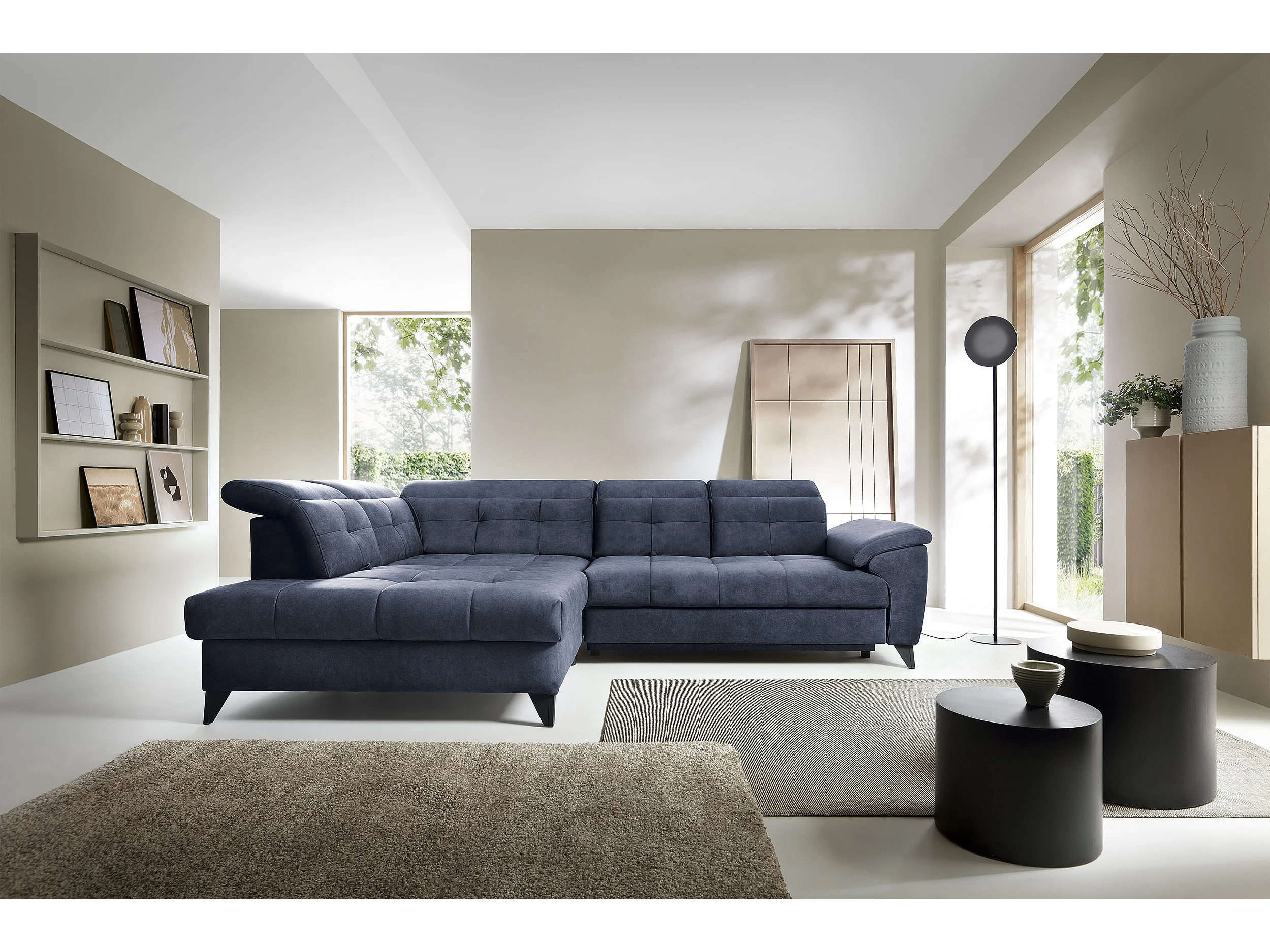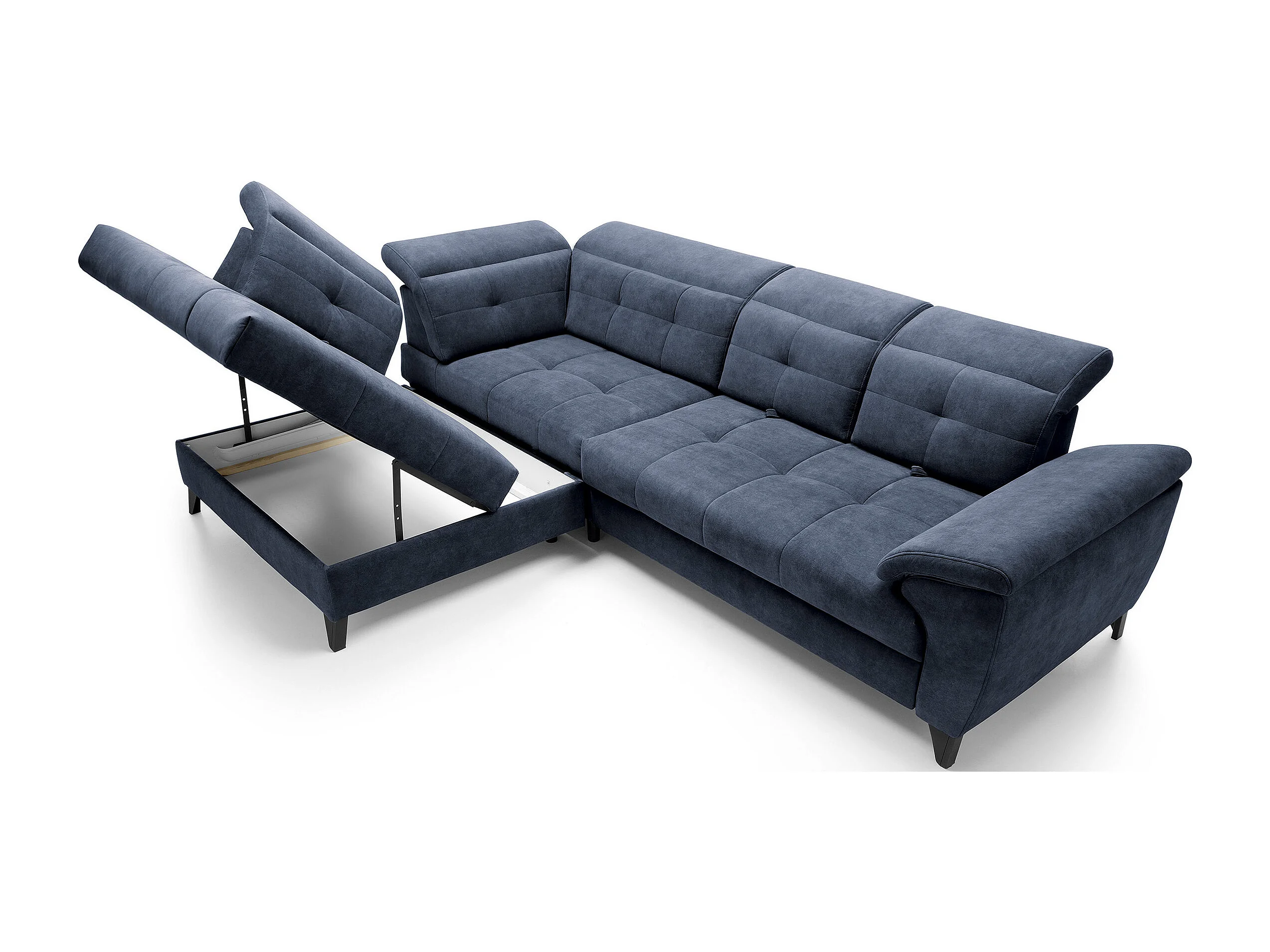 Canapé d'angle convertible tissu velouté KARIN - Coffre et appui-tête réglable-Bleu marine-angle gauche