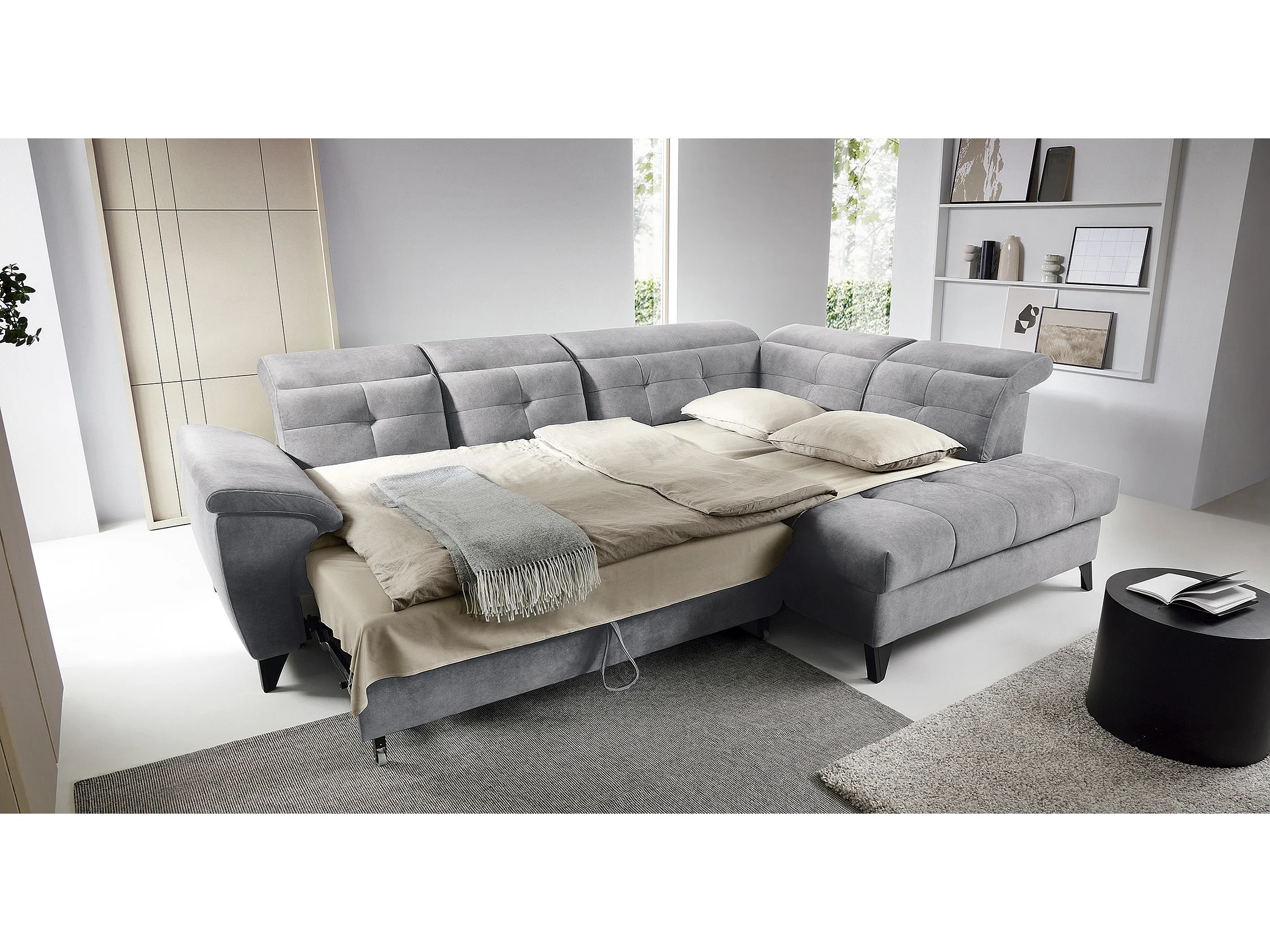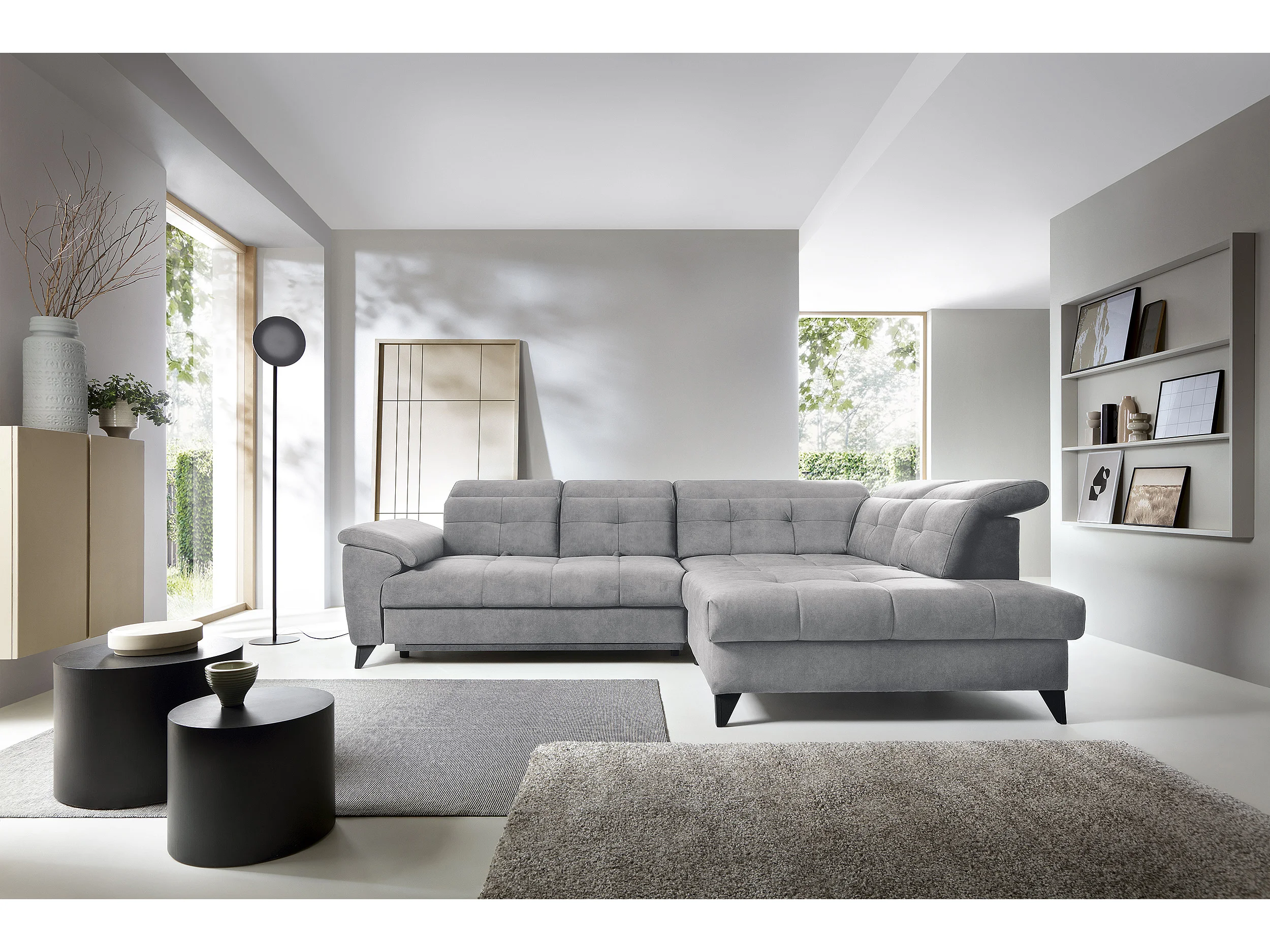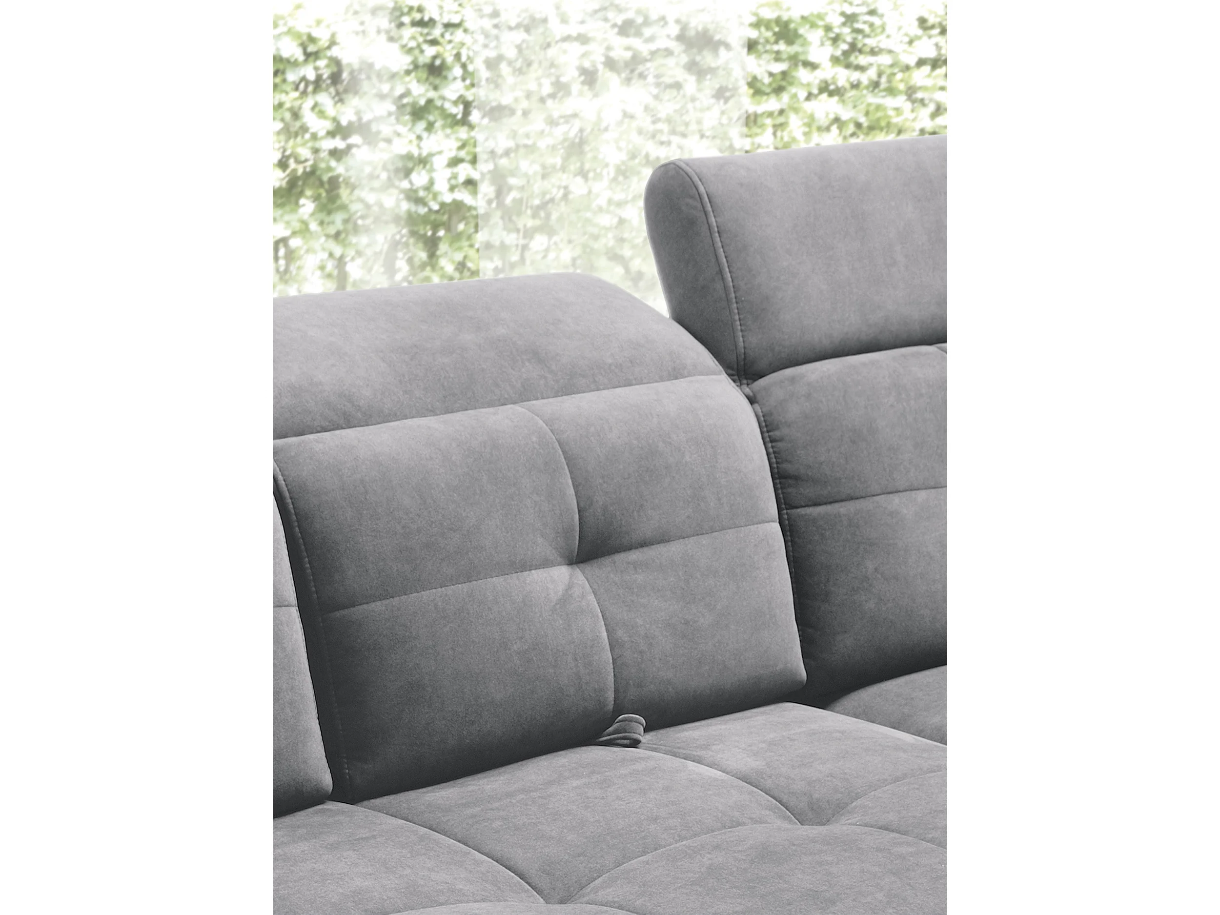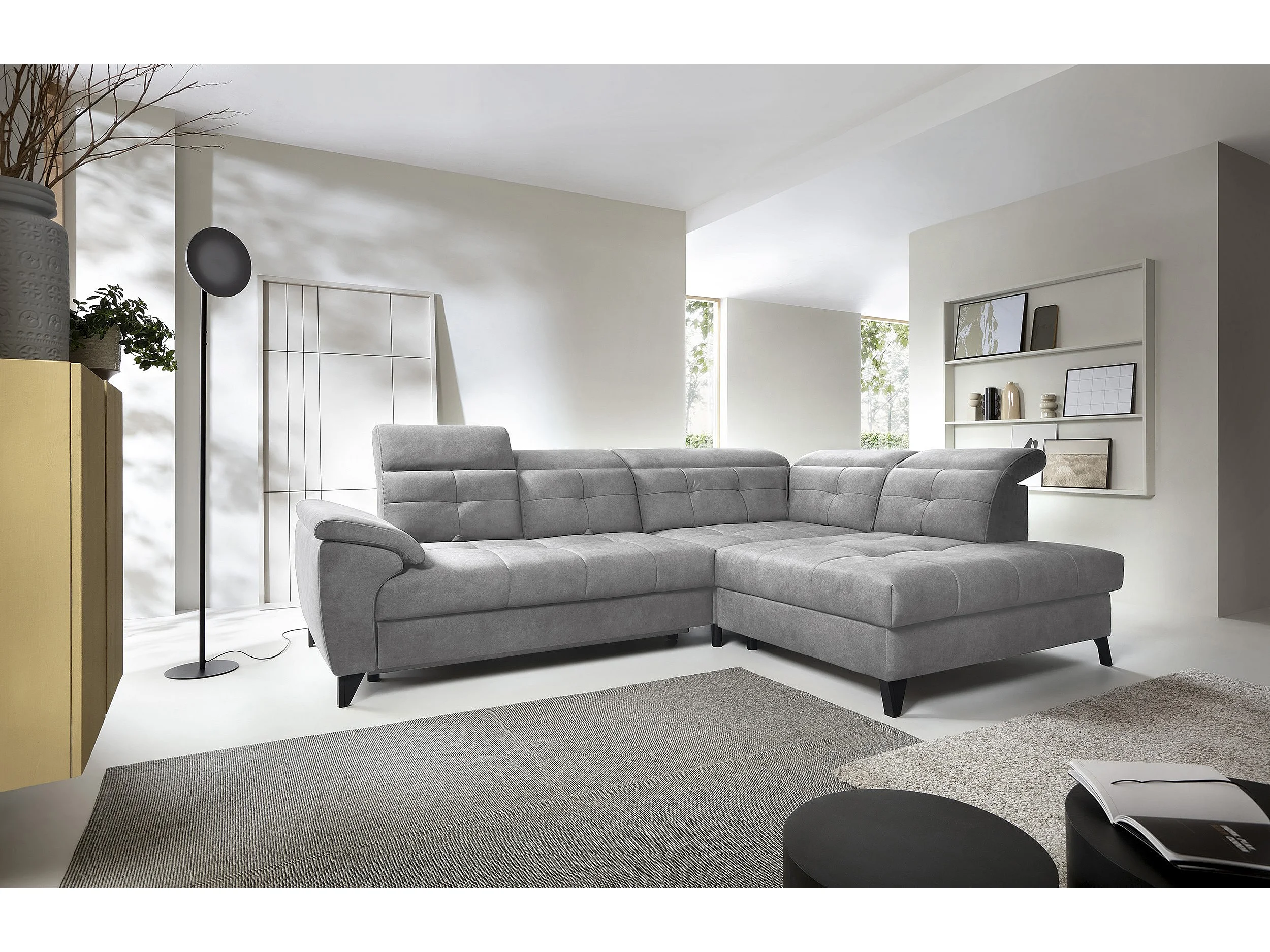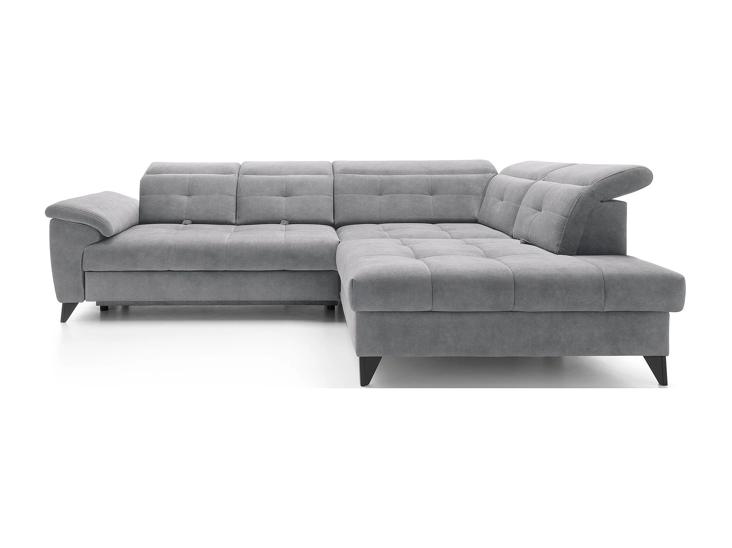 Canapé d'angle convertible tissu velouté KARIN - Coffre et appui-tête réglable-Gris-angle droit