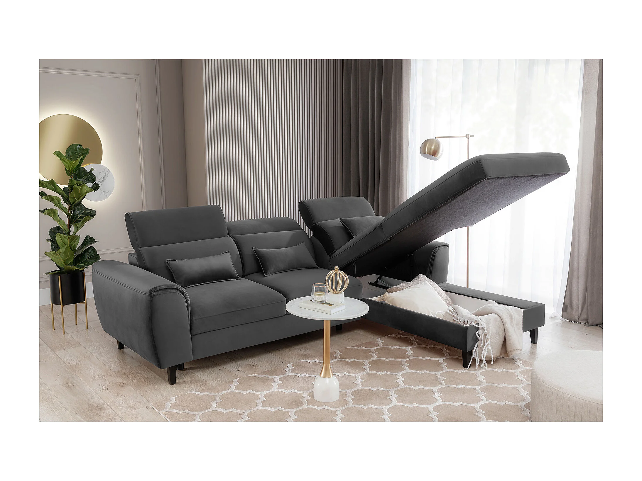 Canapé d'angle convertible velours appuis-tête réglables ASTORIA - Coffre et pieds bois noir-Gris foncé-angle droit