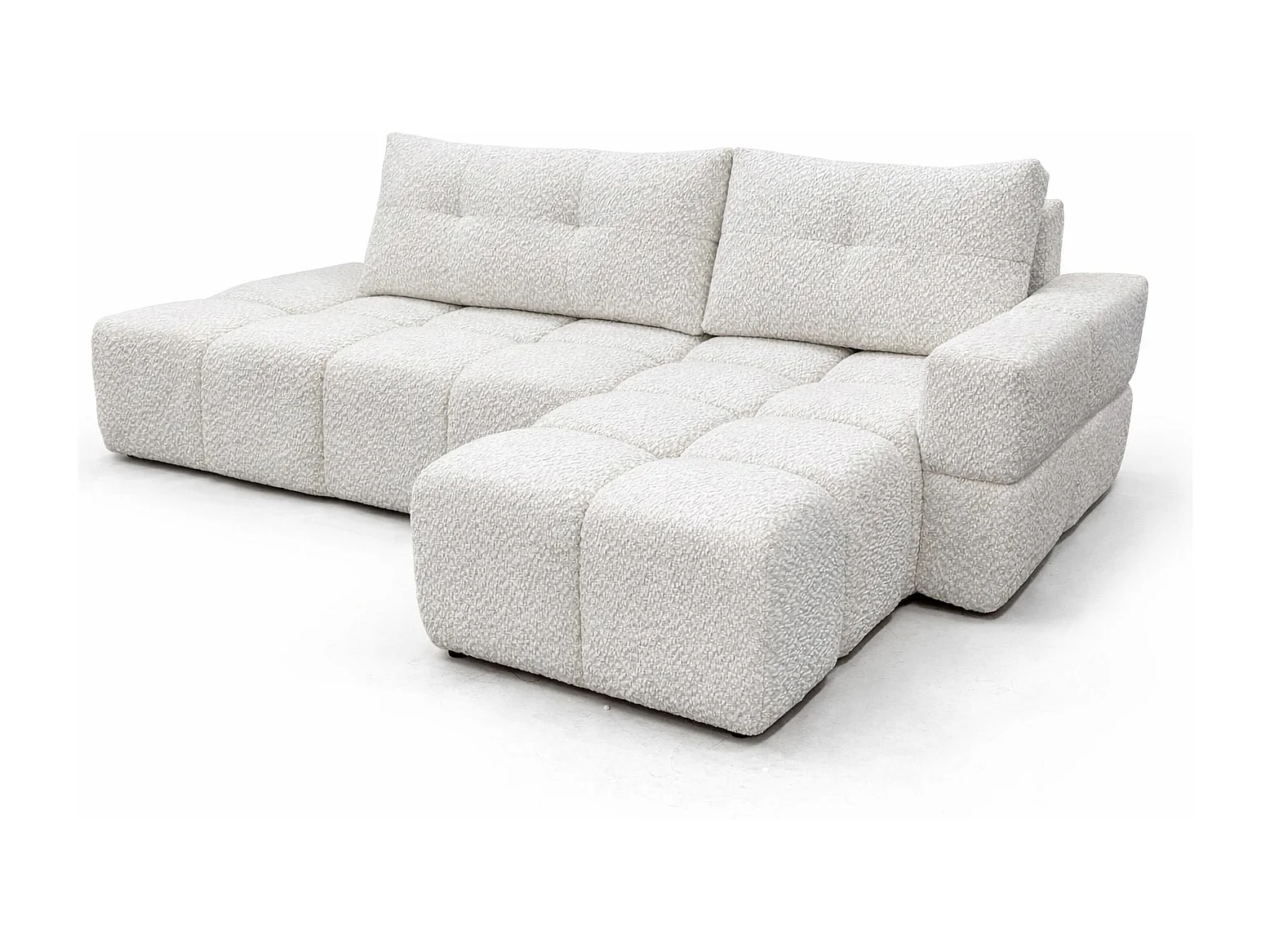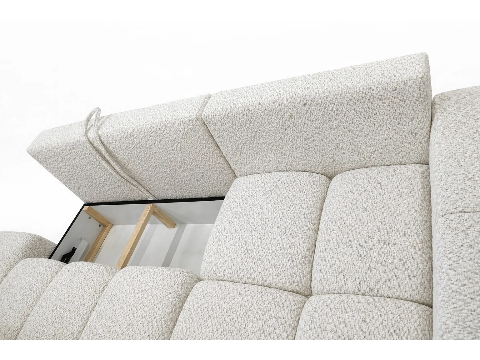 Canapé d’angle droit BUSSO en bouclé vert bouteille – ouverture rapide, fonction couchage type BUBLE, coffre de rangement