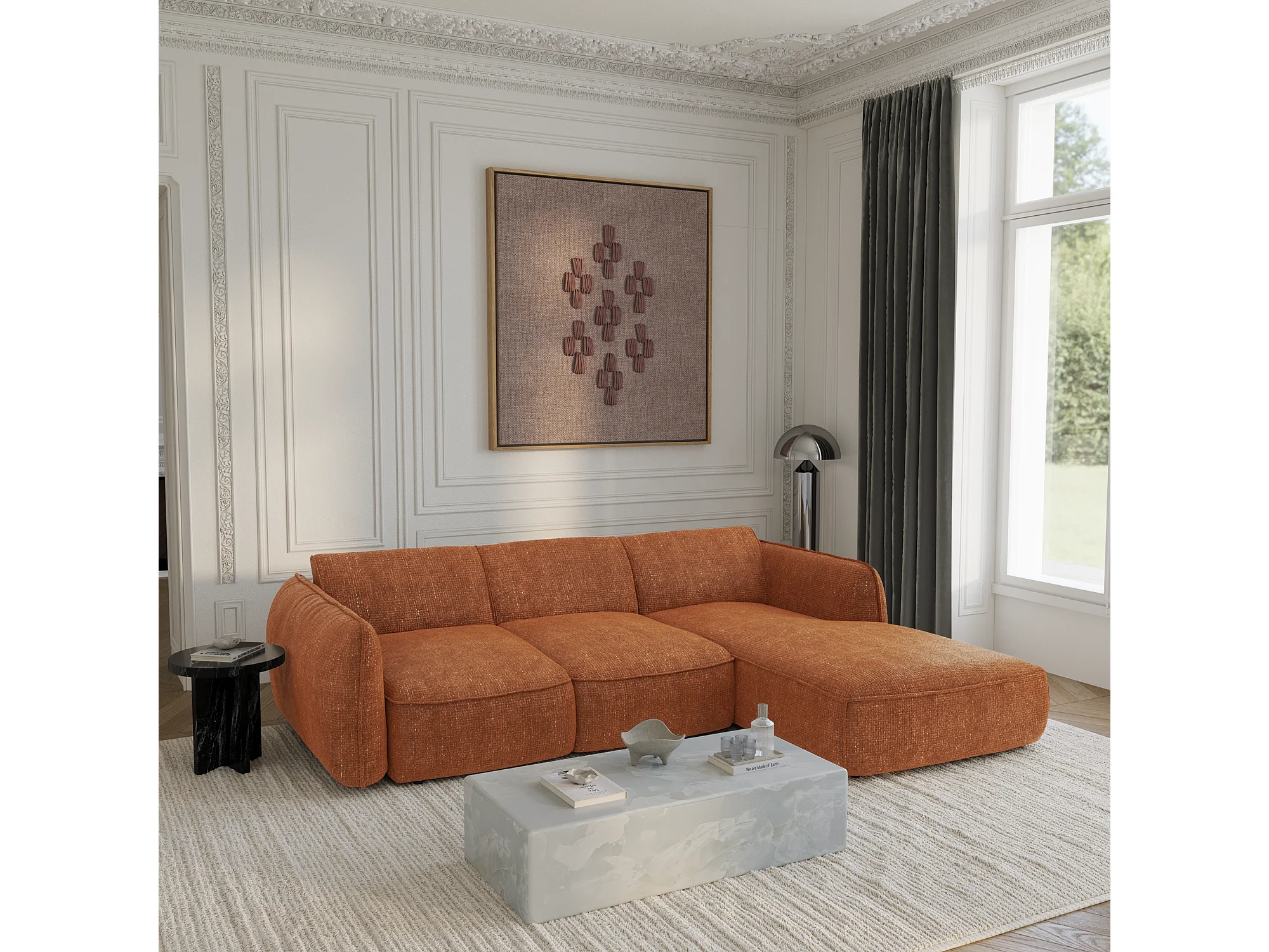 Canapé d'angle droit convertible 4 places velours tramé terracotta LIVIA
