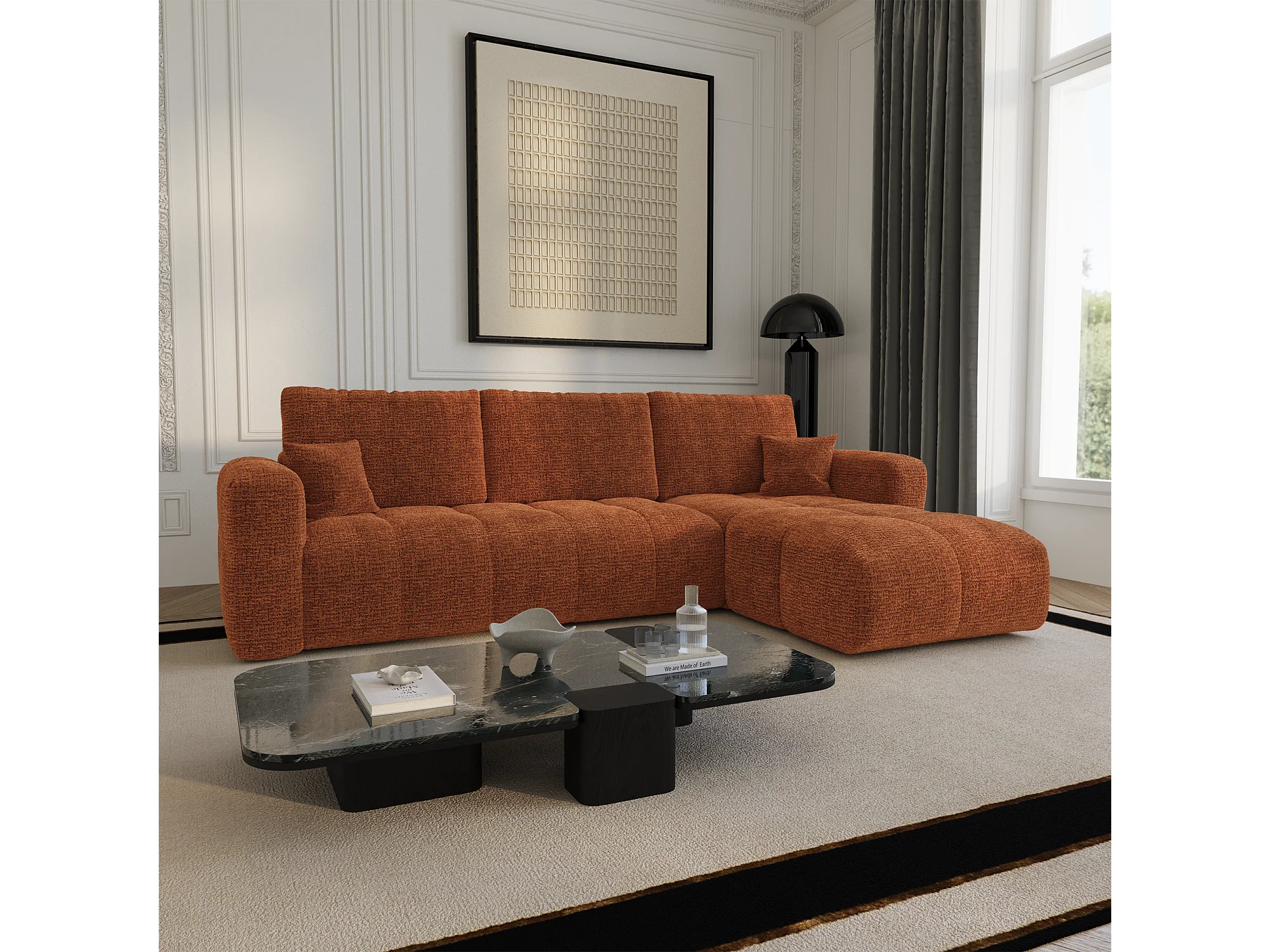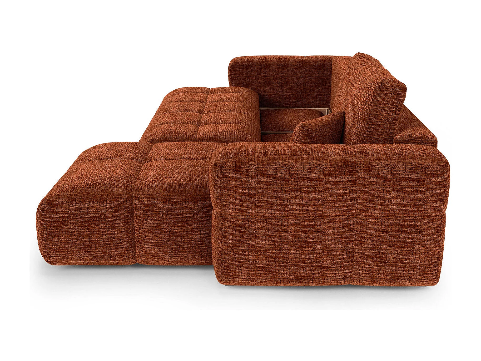 Canapé d'angle droit convertible avec coffre VIBE en Tissu tramé toucher doux