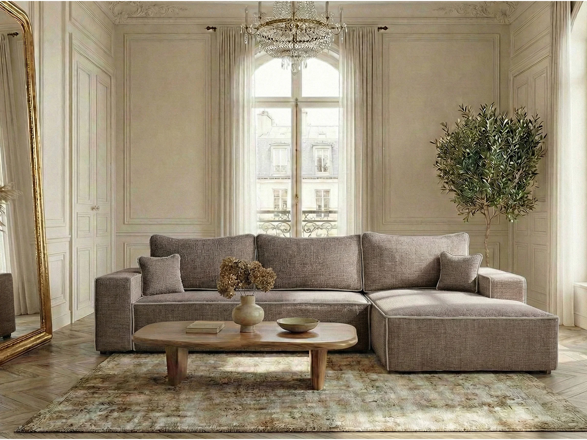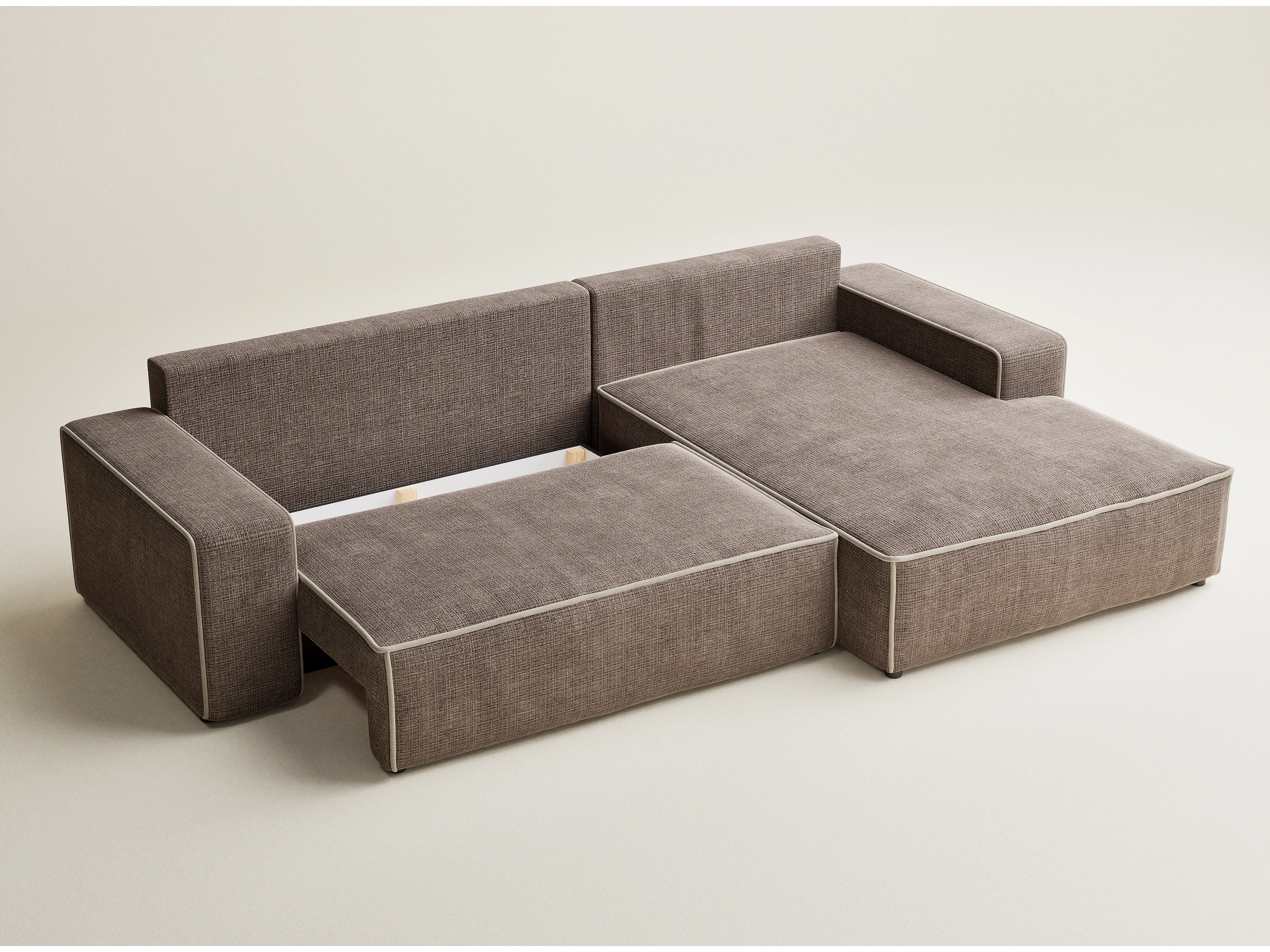 Canapé d'angle droit convertible en tissu chenille brun-beige MODO