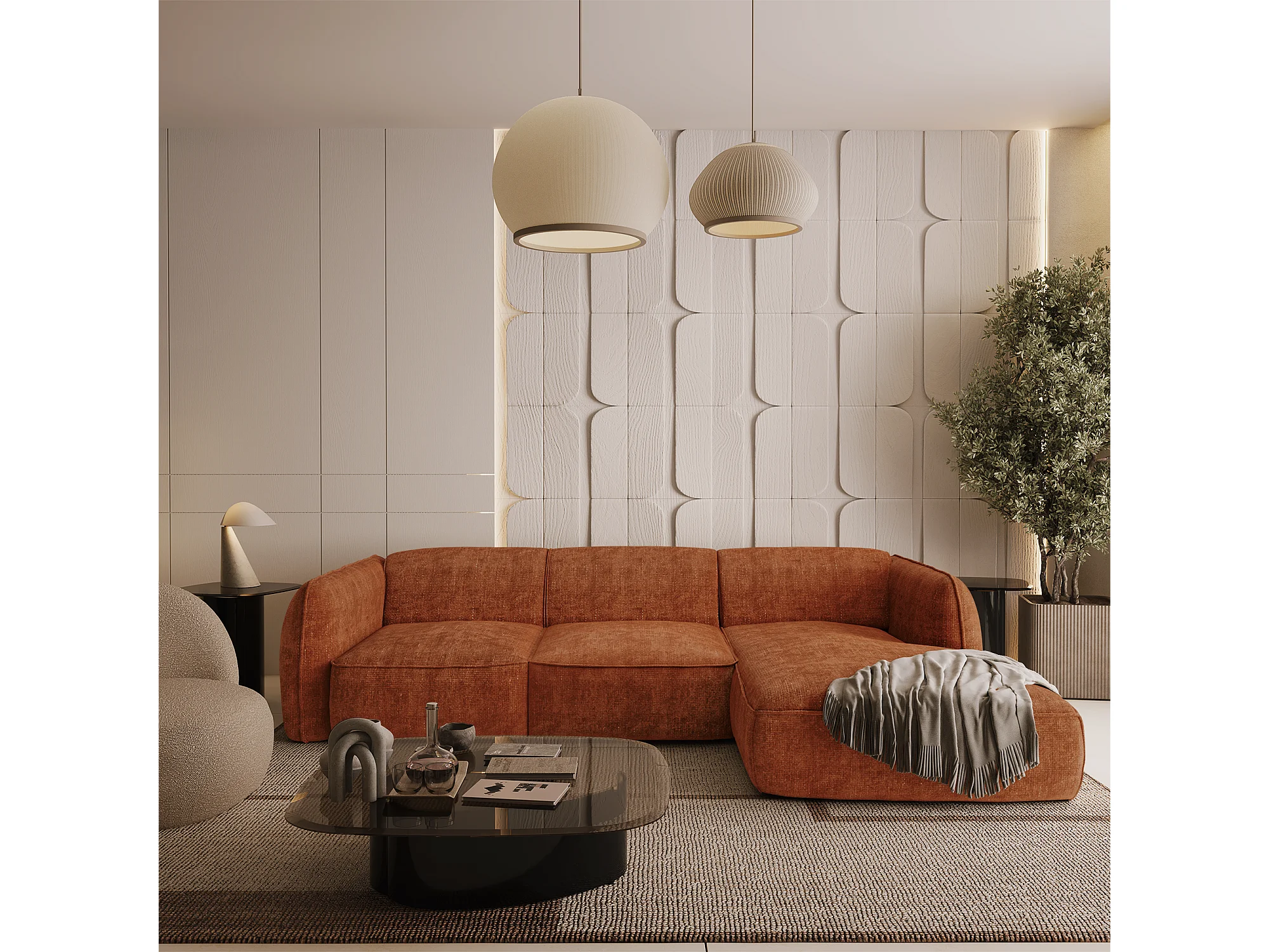 Canapé d'angle droit velours tramé terracotta LIVIA