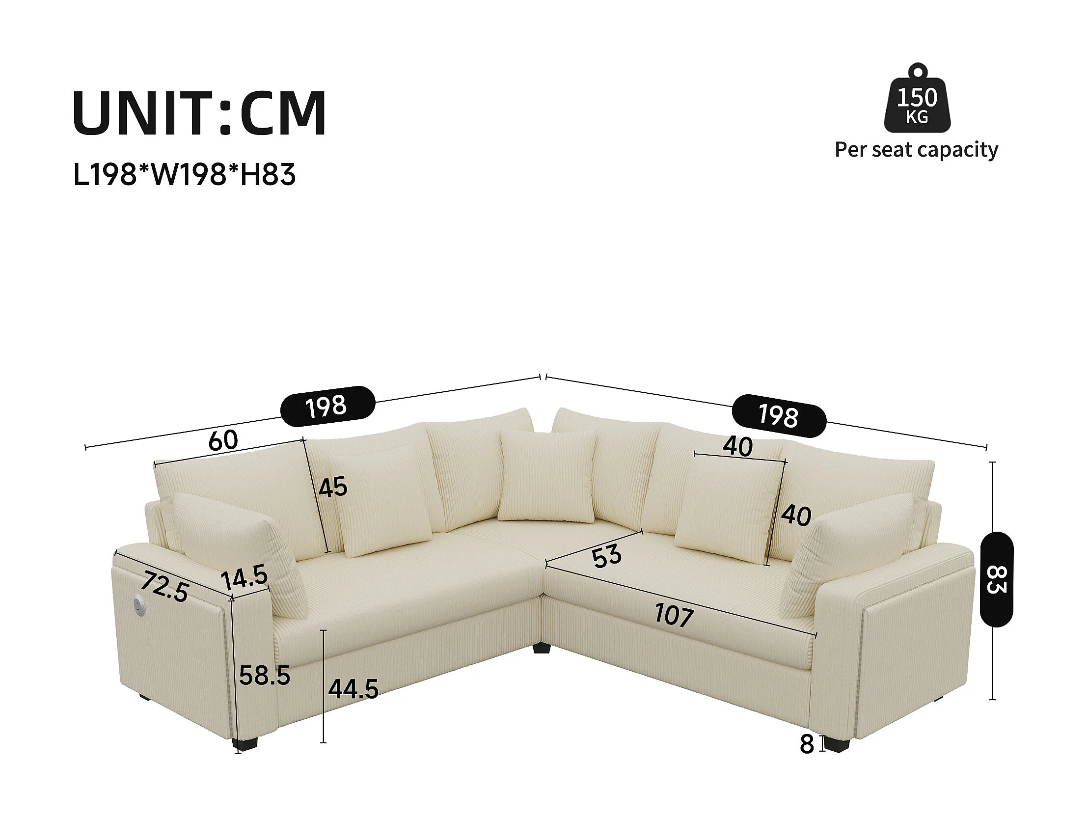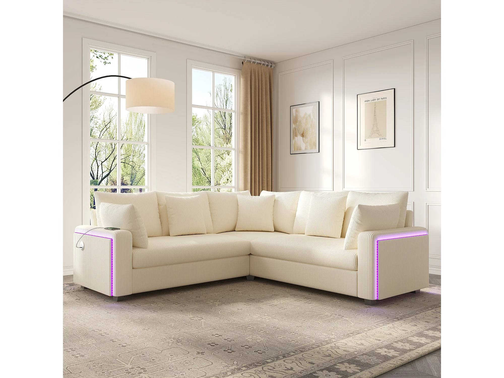 Canapé d'angle en L - 4 places - avec éclairage LED - port de chargement USB - velours côtelé- beige