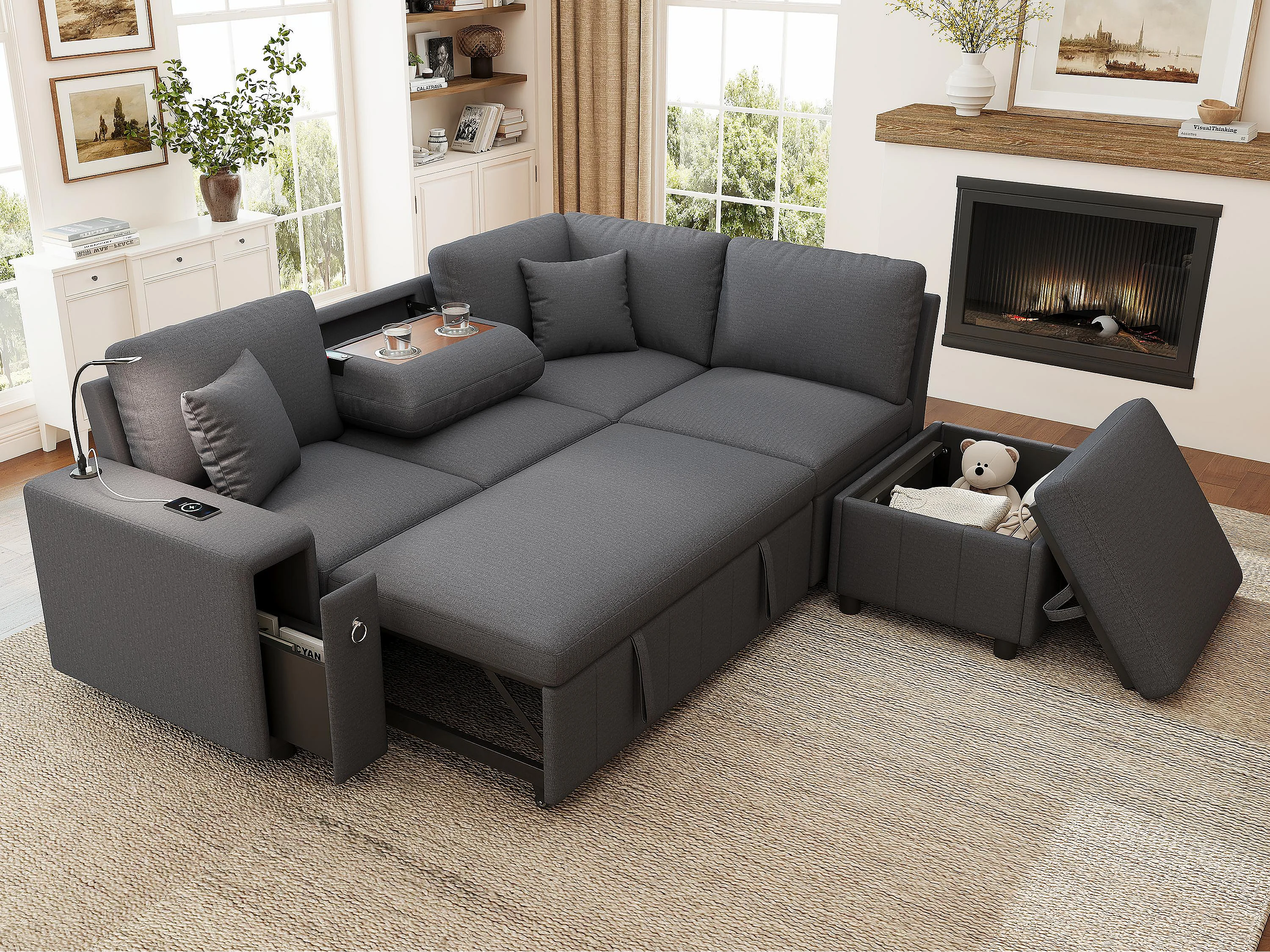 Canapé d'angle en L - 5 places - avec pouf de rangement - avec table basse pliante - avec ports USB et Type-C - avec liseuse - avec 2 coussins - gris