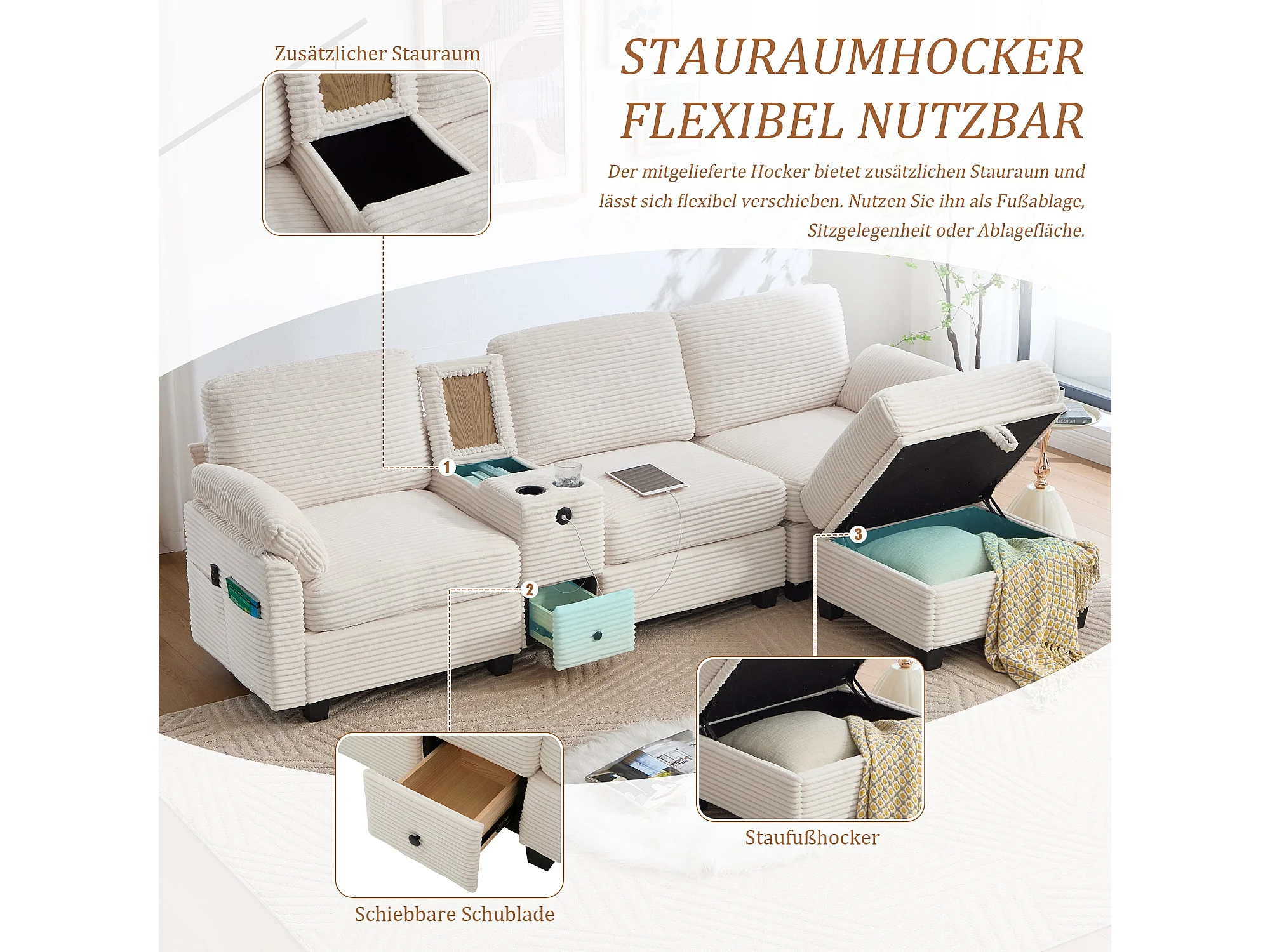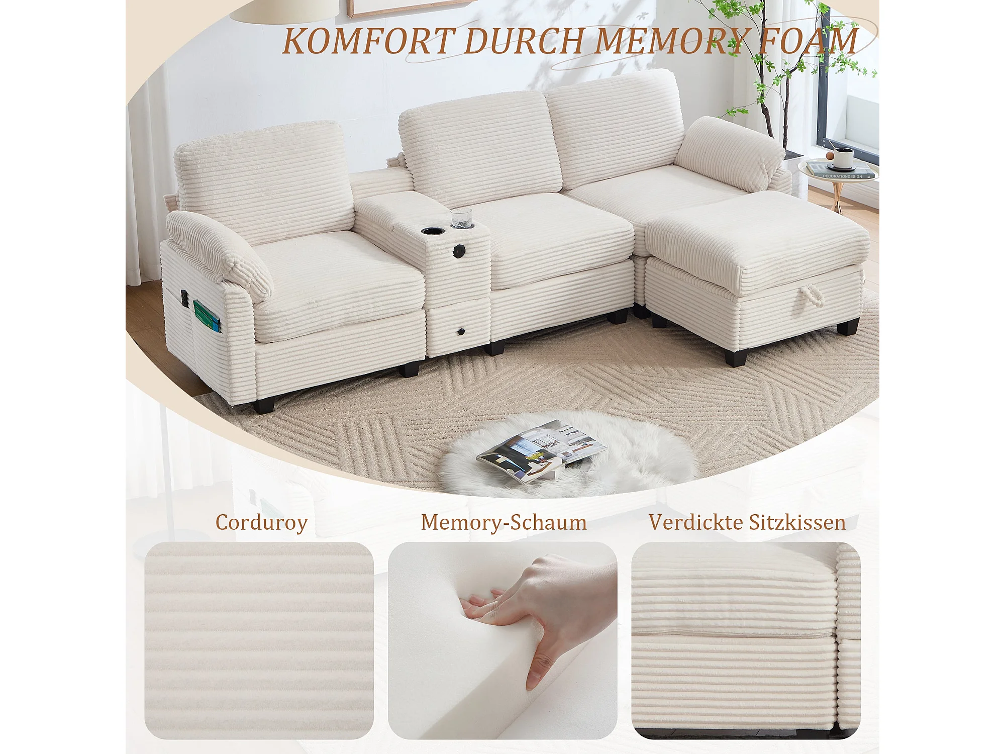 Canapé d’Angle en Velours Côtelé avec Pouf Coffre, Mousse Mémoire de Forme, Console Coulissante avec Porte-Gobelets, USB-C, Poches Latérales