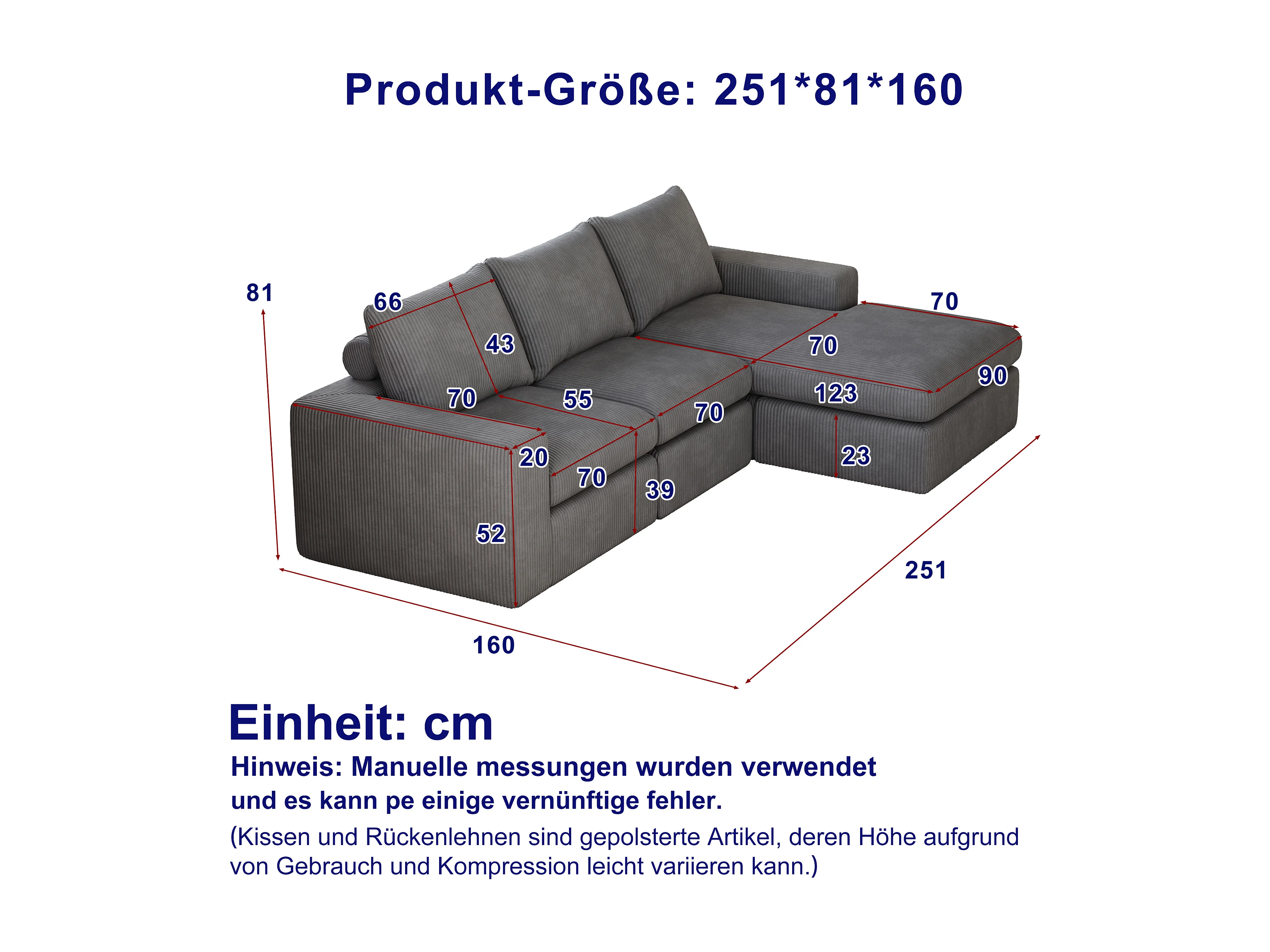 Canapé d'angle modulable, réversible gauche droite, sans montage, 4 modules, 3 coussins, velours côtelé gris foncé