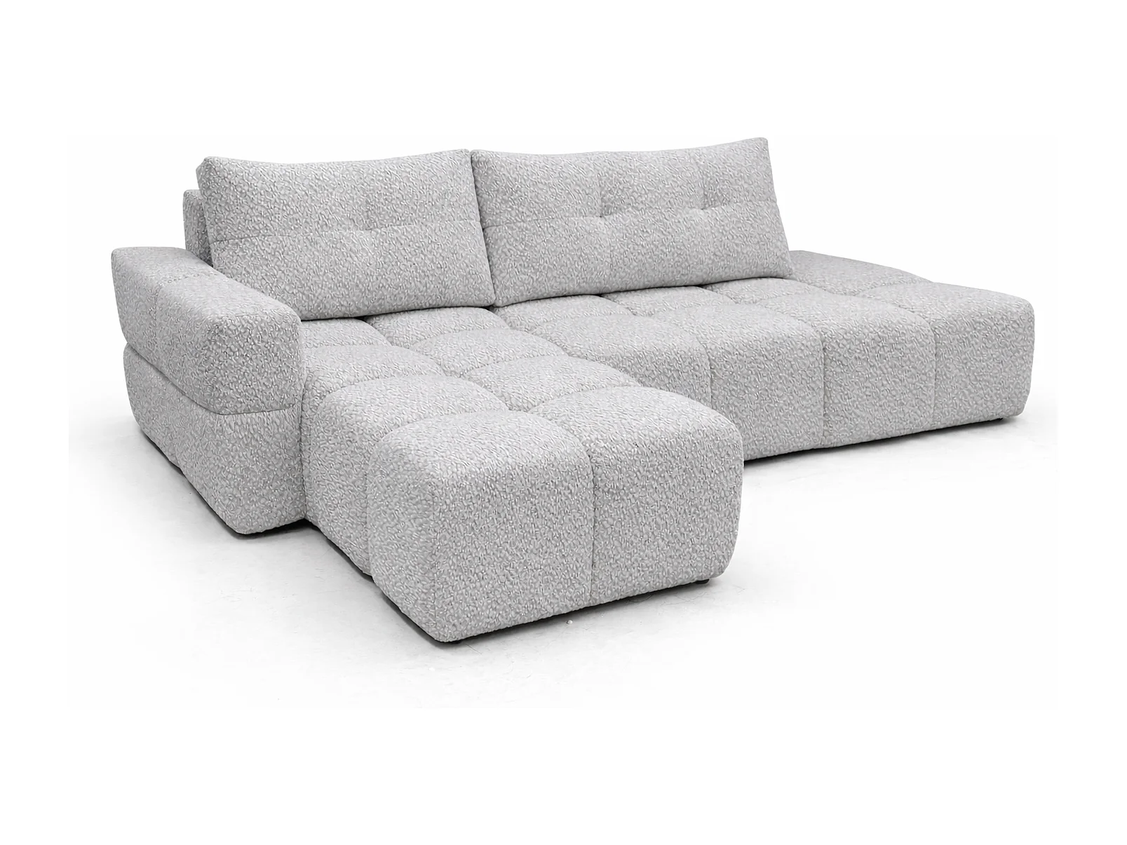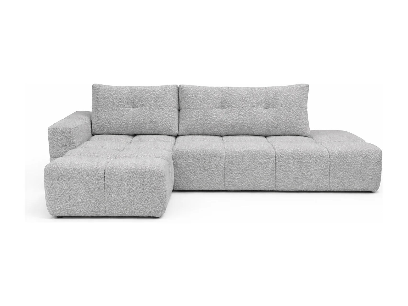 Canapé d’angle gauche BUSSO en bouclé blanc – ouverture rapide, fonction couchage type BUBLE, coffre de rangement