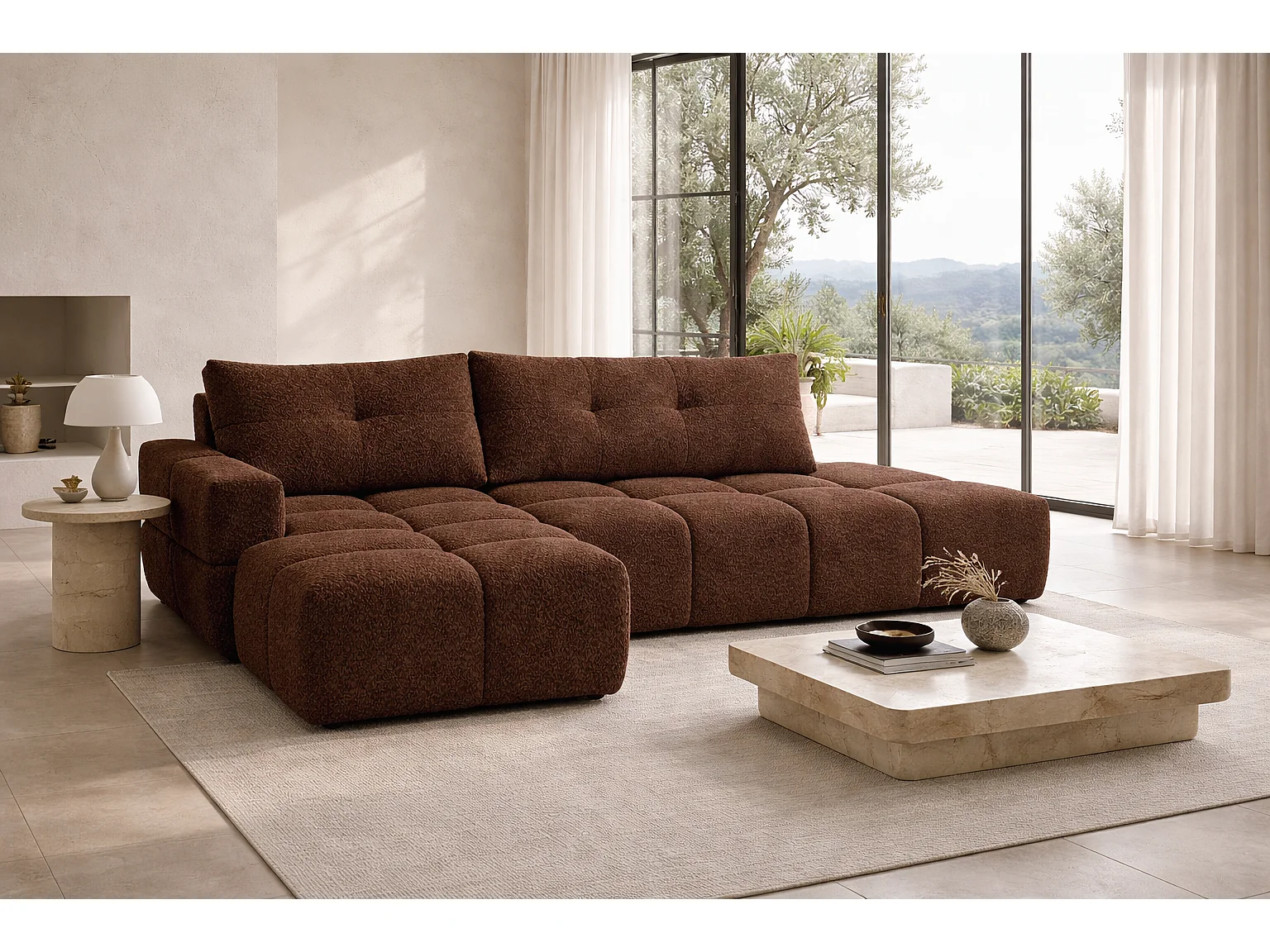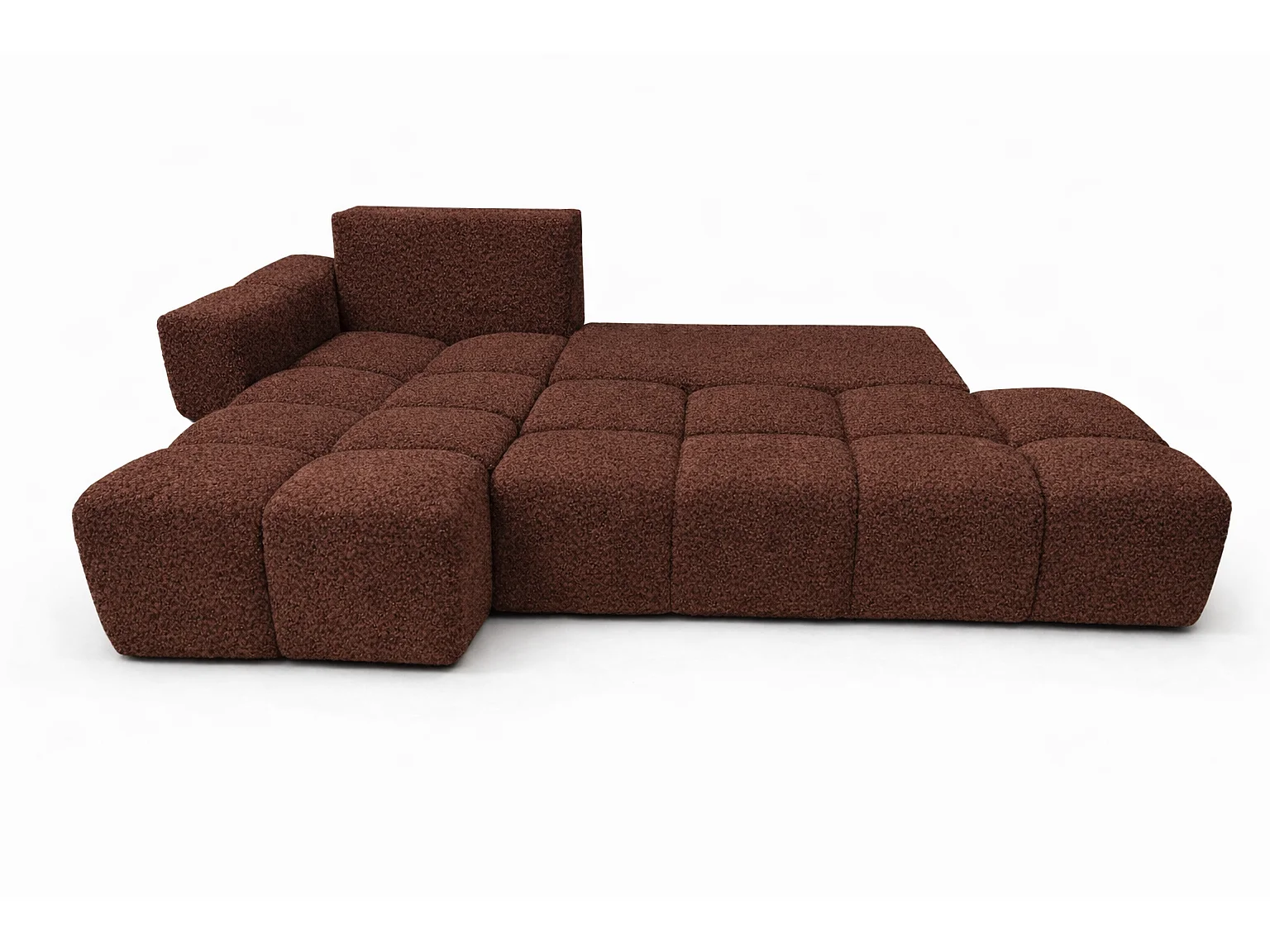 Canapé d’angle gauche BUSSO en bouclé brun chocolat – ouverture rapide, fonction couchage type BUBLE, coffre de rangement