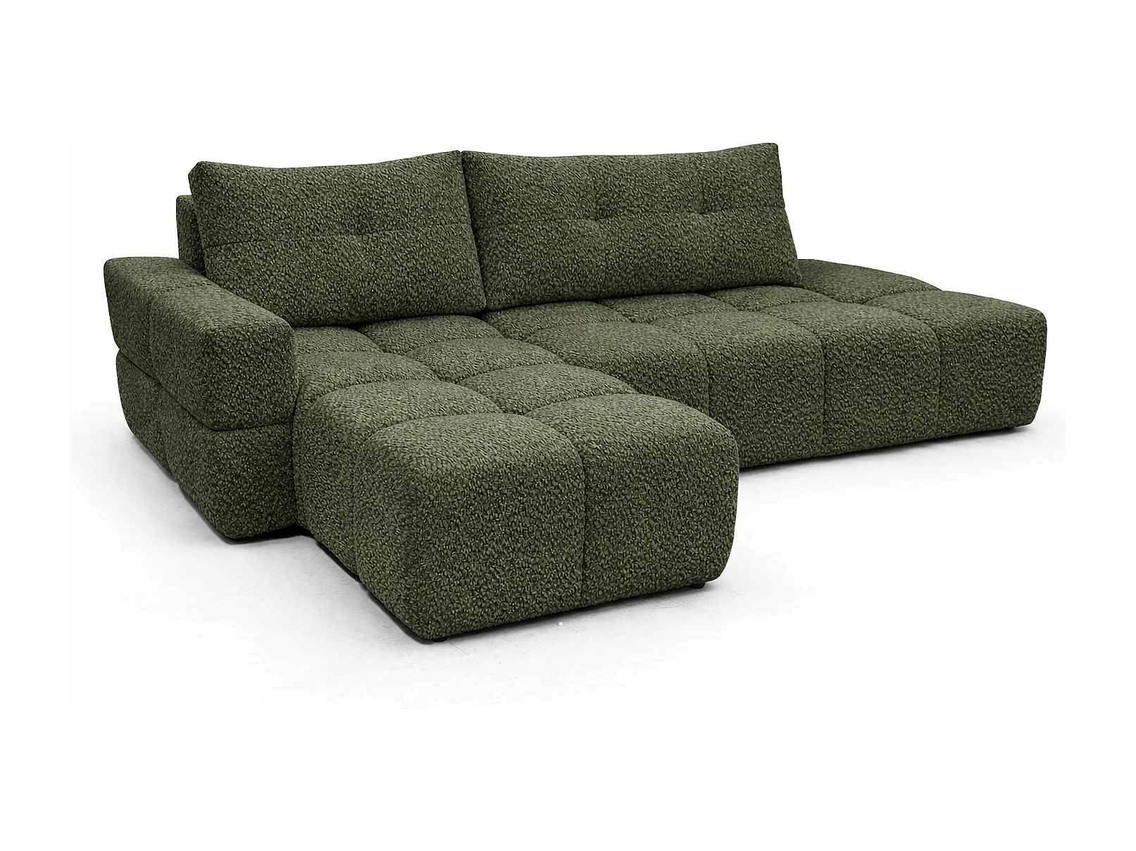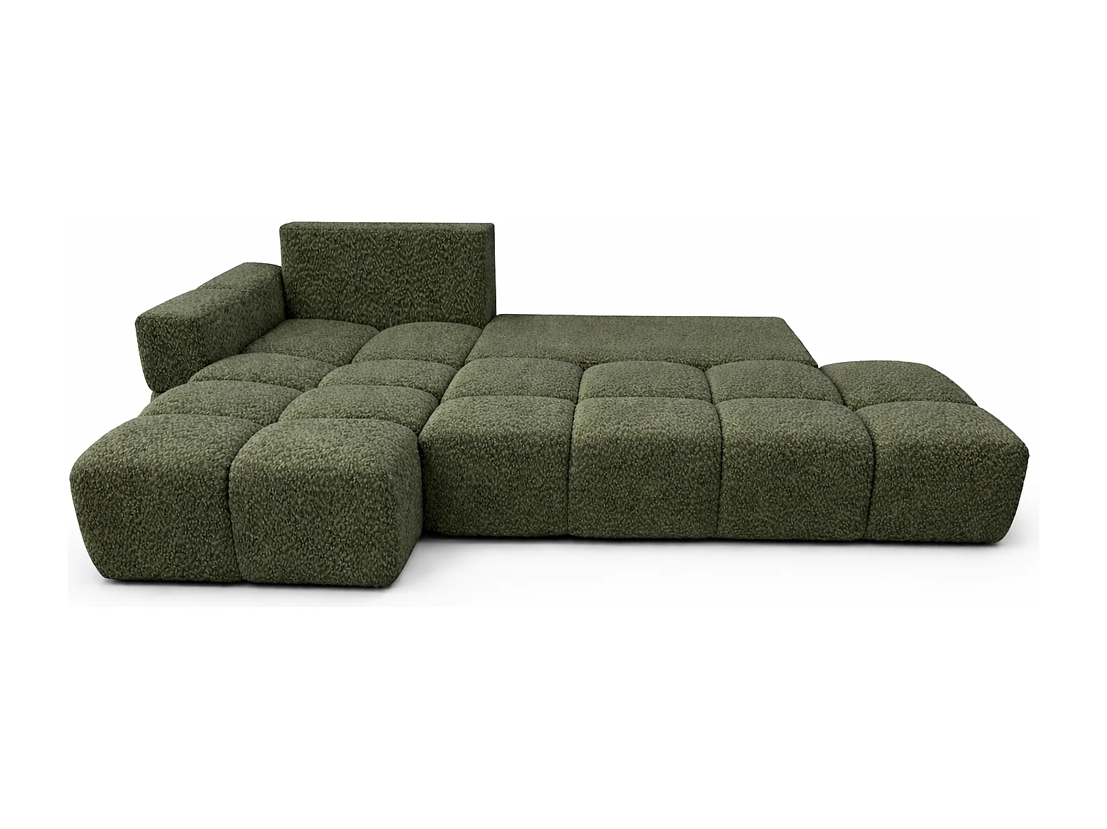 Canapé d’angle gauche BUSSO en bouclé vert bouteille – ouverture rapide, fonction couchage type BUBLE, coffre de rangement
