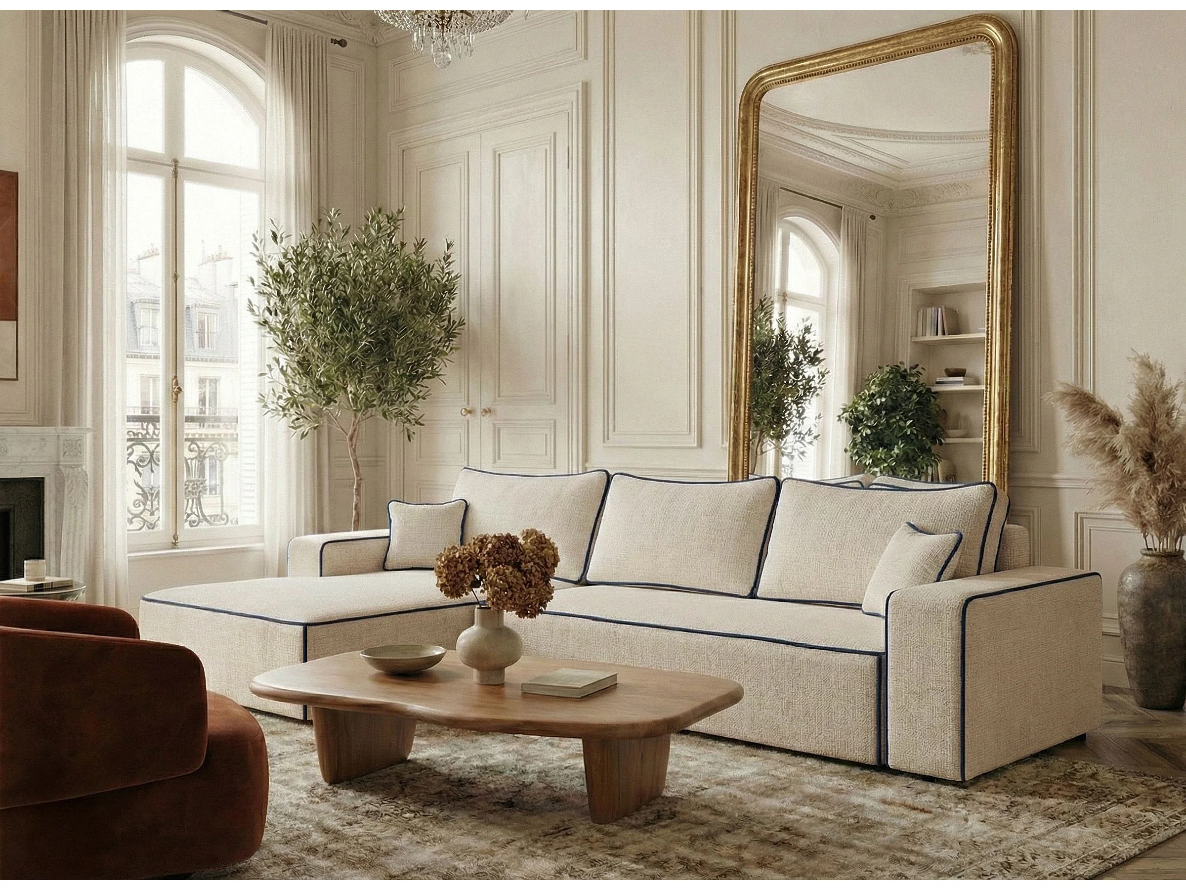 Canapé d'angle gauche convertible en tissu chenille creme-bleu foncé MODO