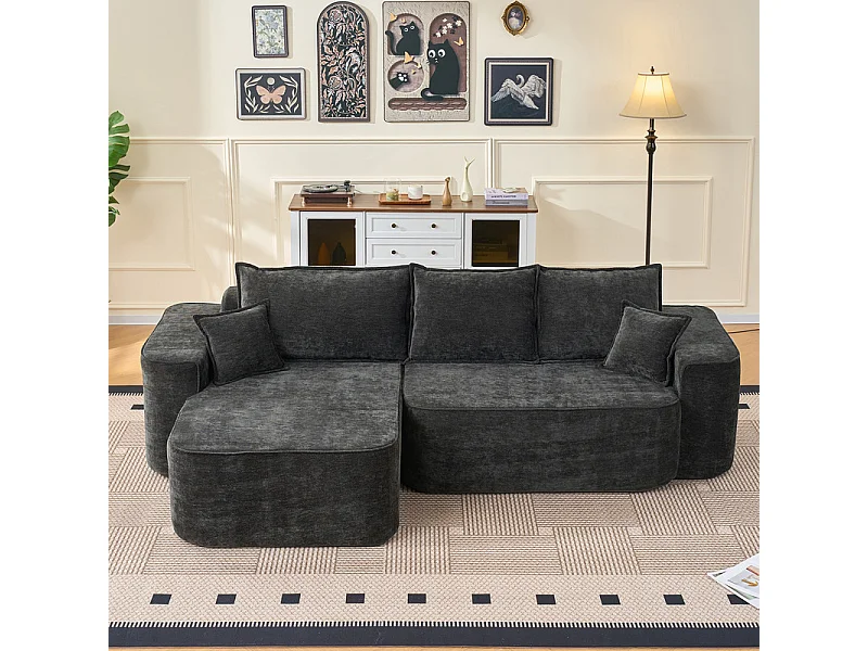 Canapé d'angle gauche modulable - en Chenille Noir - avec 3 coussins et 2 oreillers - 262x144x65cm