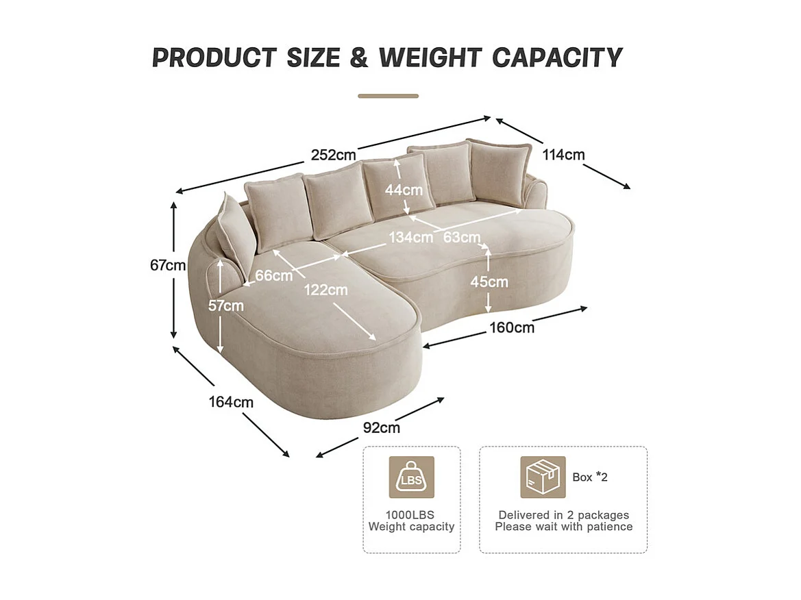 Canapé d'angle gauche modulable en tissu chenille, avec méridienne et coussins, 252x164x67cm, Beige