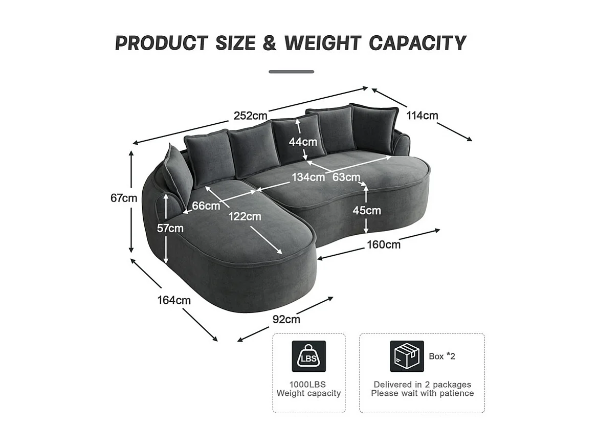 Canapé d'angle gauche modulable en tissu chenille, avec méridienne et coussins, 252x164x67cm, Gris