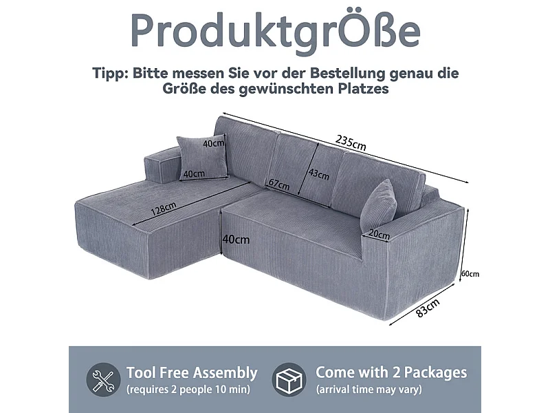 Canapé d'angle gauche modulable, en Velours côtelé, avec 2 oreillers et 128cm méridienne, Gris