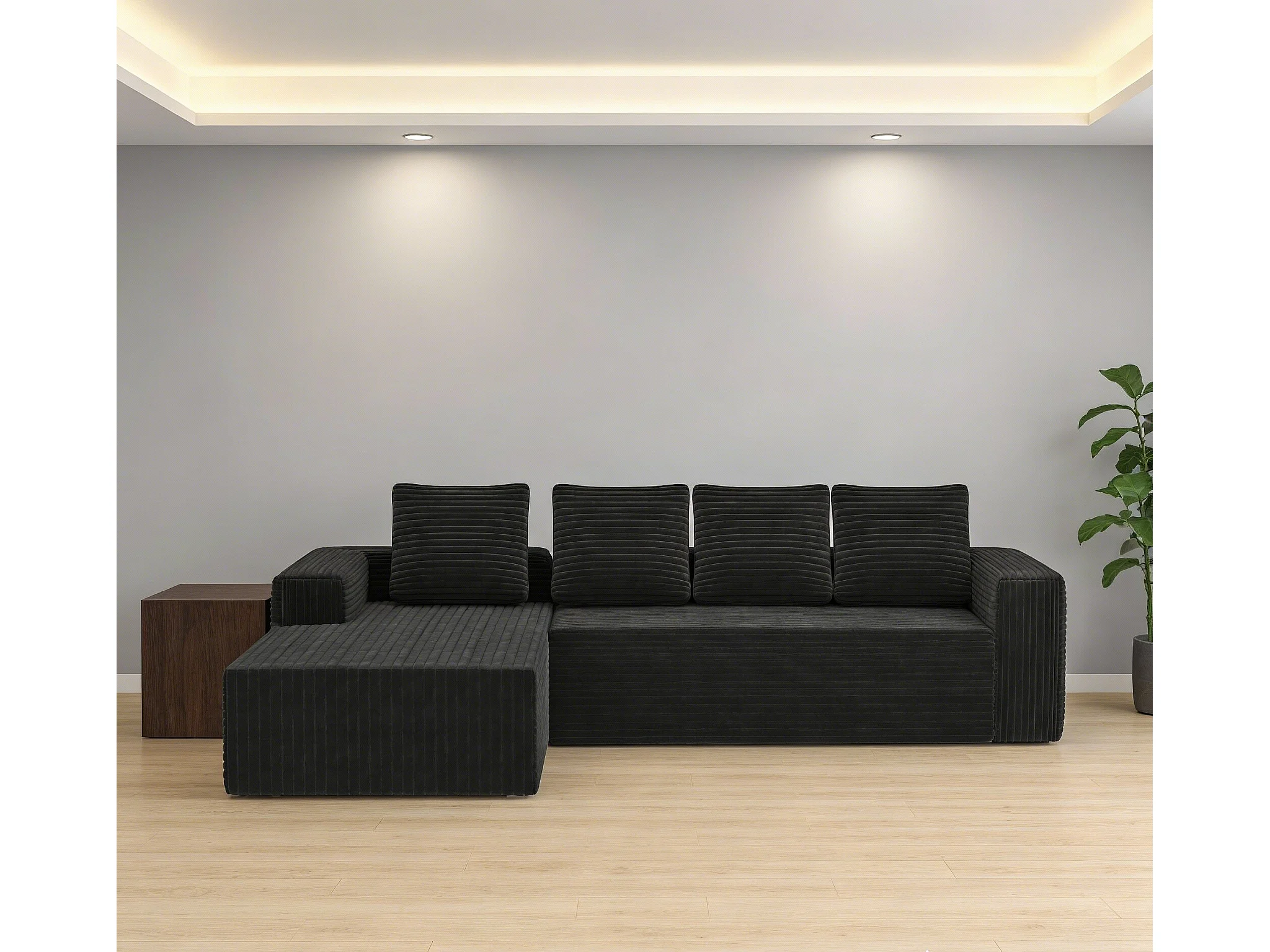 Canapé d'angle gauche modulable - en Velours côtelé Noir - 4 Places - avec 4 Coussins et 150cm méridienne - 261x171x58cm