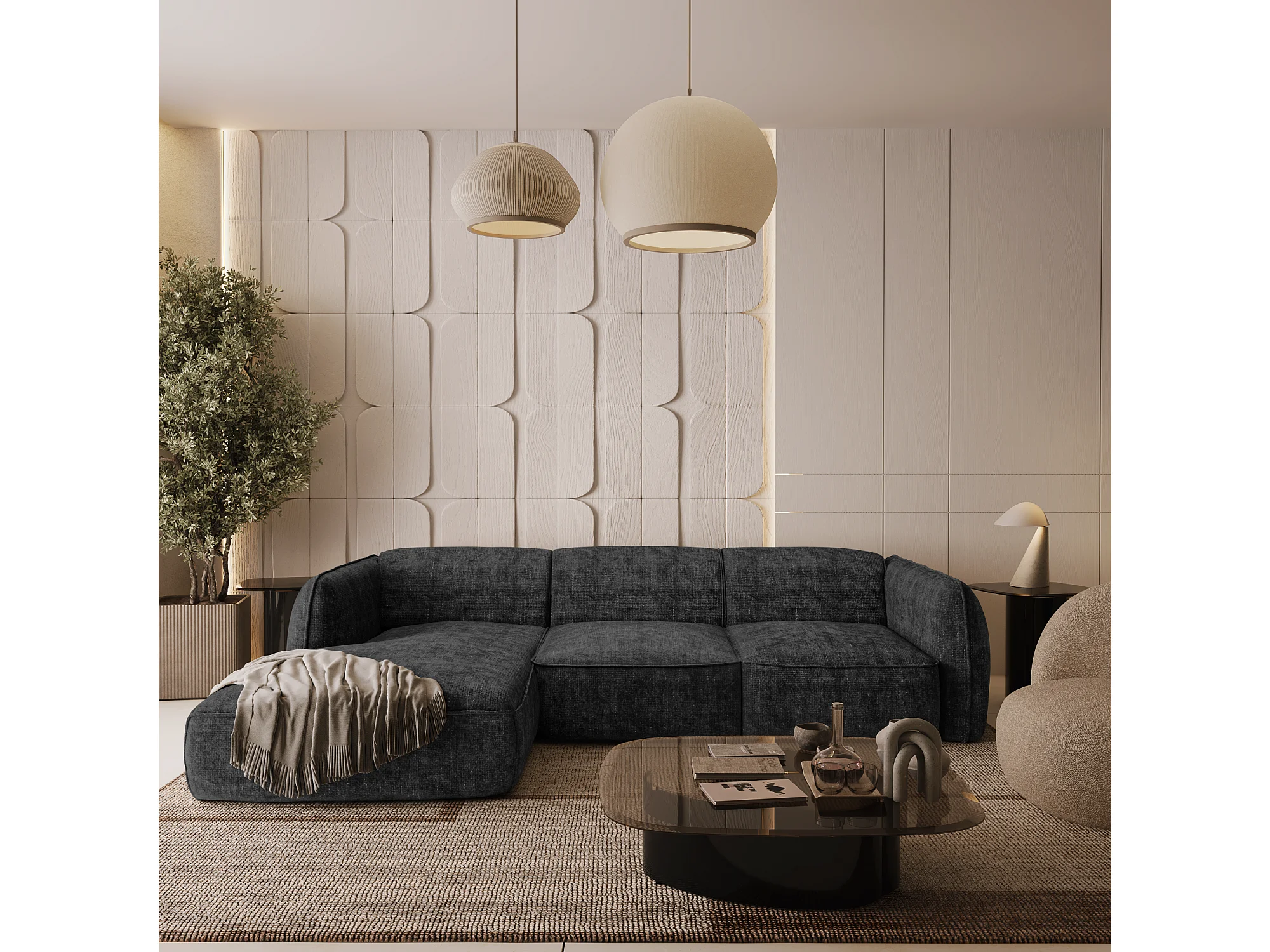 Canapé d'angle gauche velours tramé anthracite foncé LIVIA