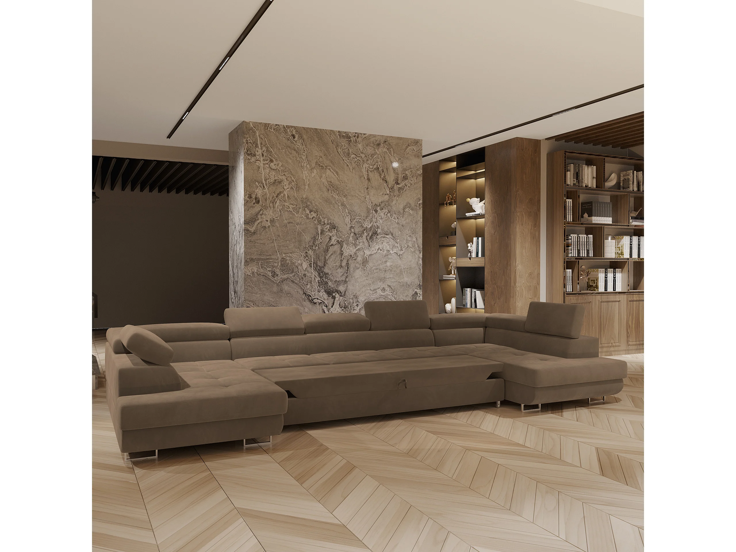 Canapé d'angle ISOLANO Beige en velours avec fonction de couchage