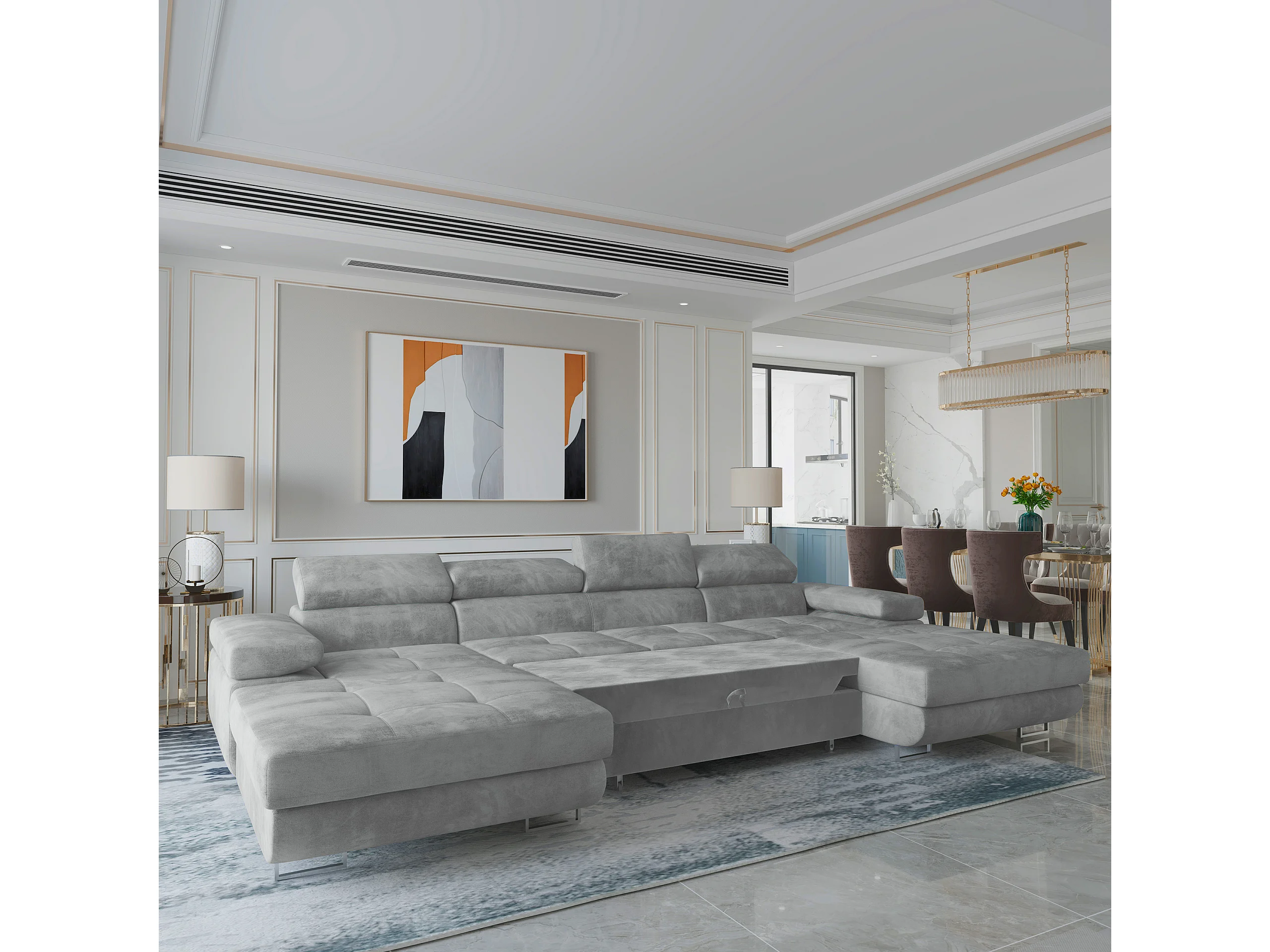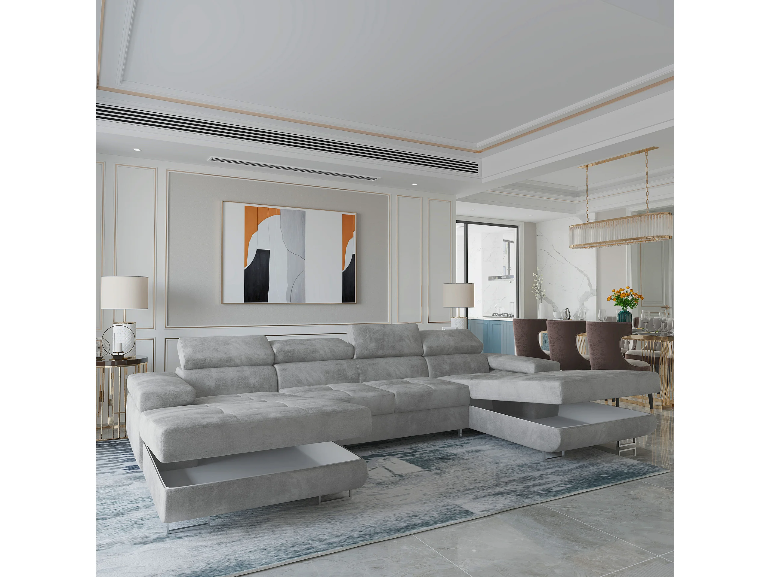 Canapé d'angle LYKKE Gris clair en velours avec fonction de couchage
