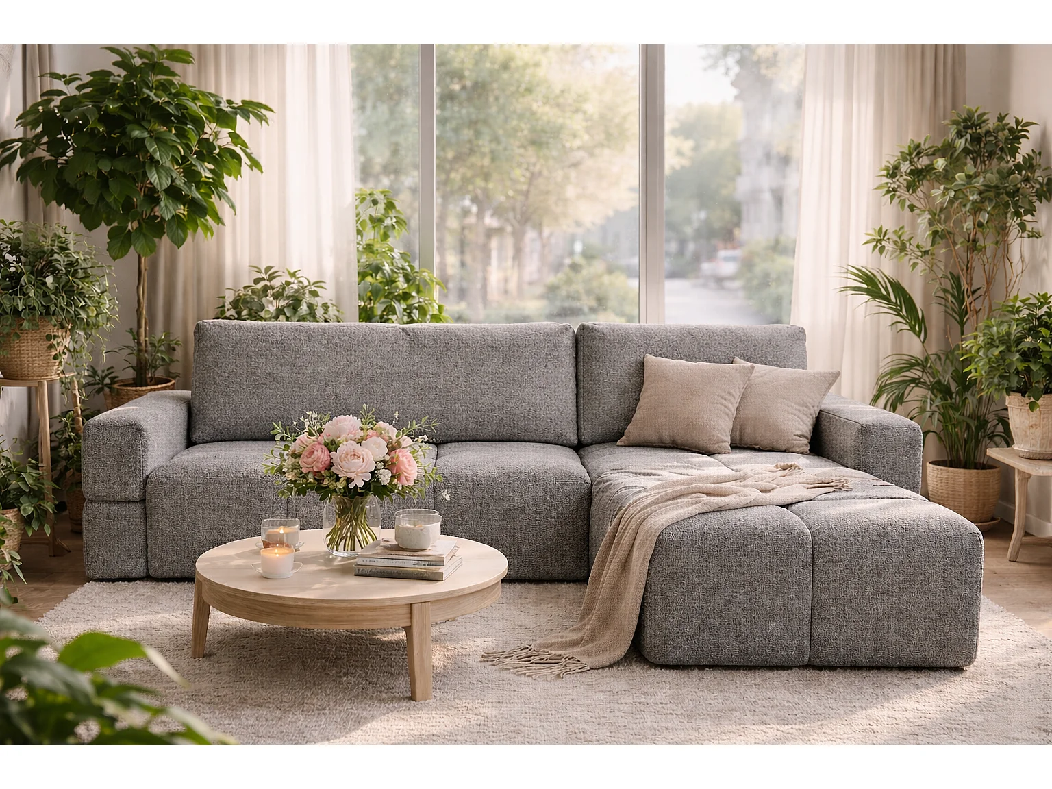 Canapé d’angle MODENA réversible convertible avec coffre – grand canapé salon, lit d’appoint, design moderne, tissu clair, confortable pour toute la famille