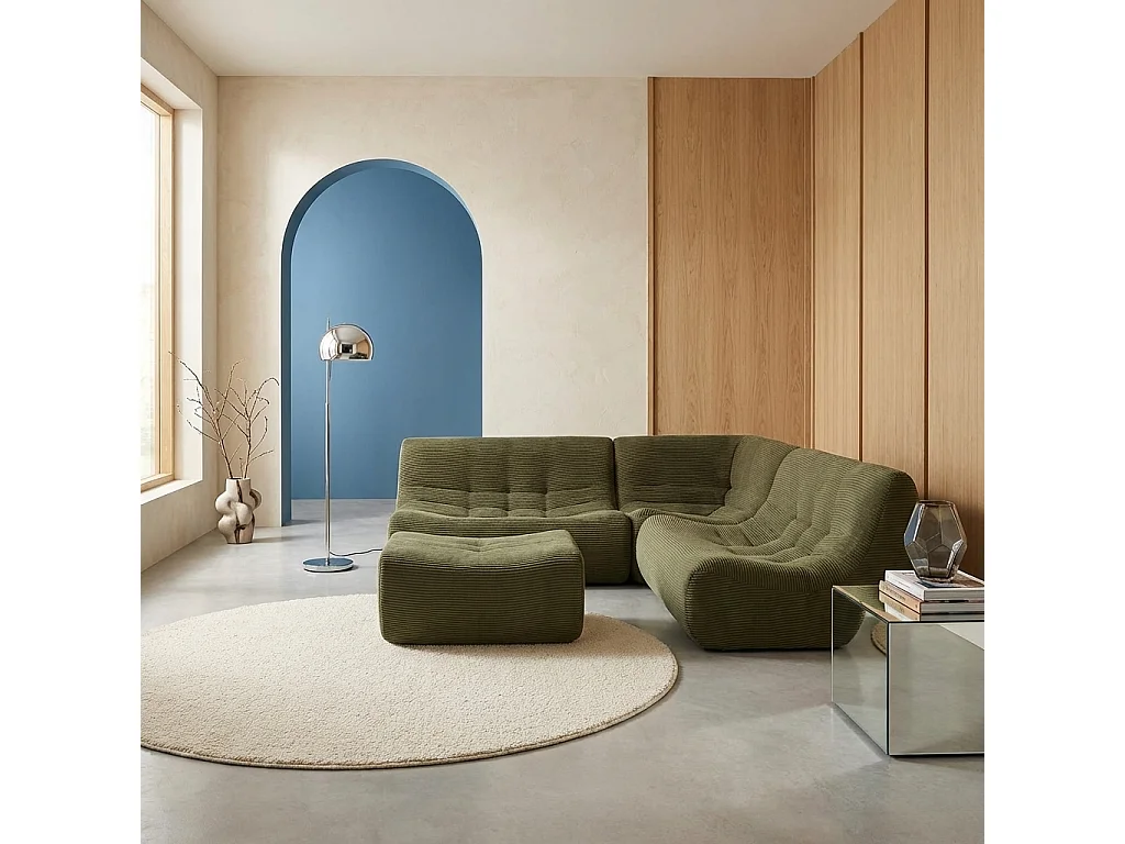 Canapé d'angle modulable 5 places avec repose pied velours côtelé kaki - Sokol