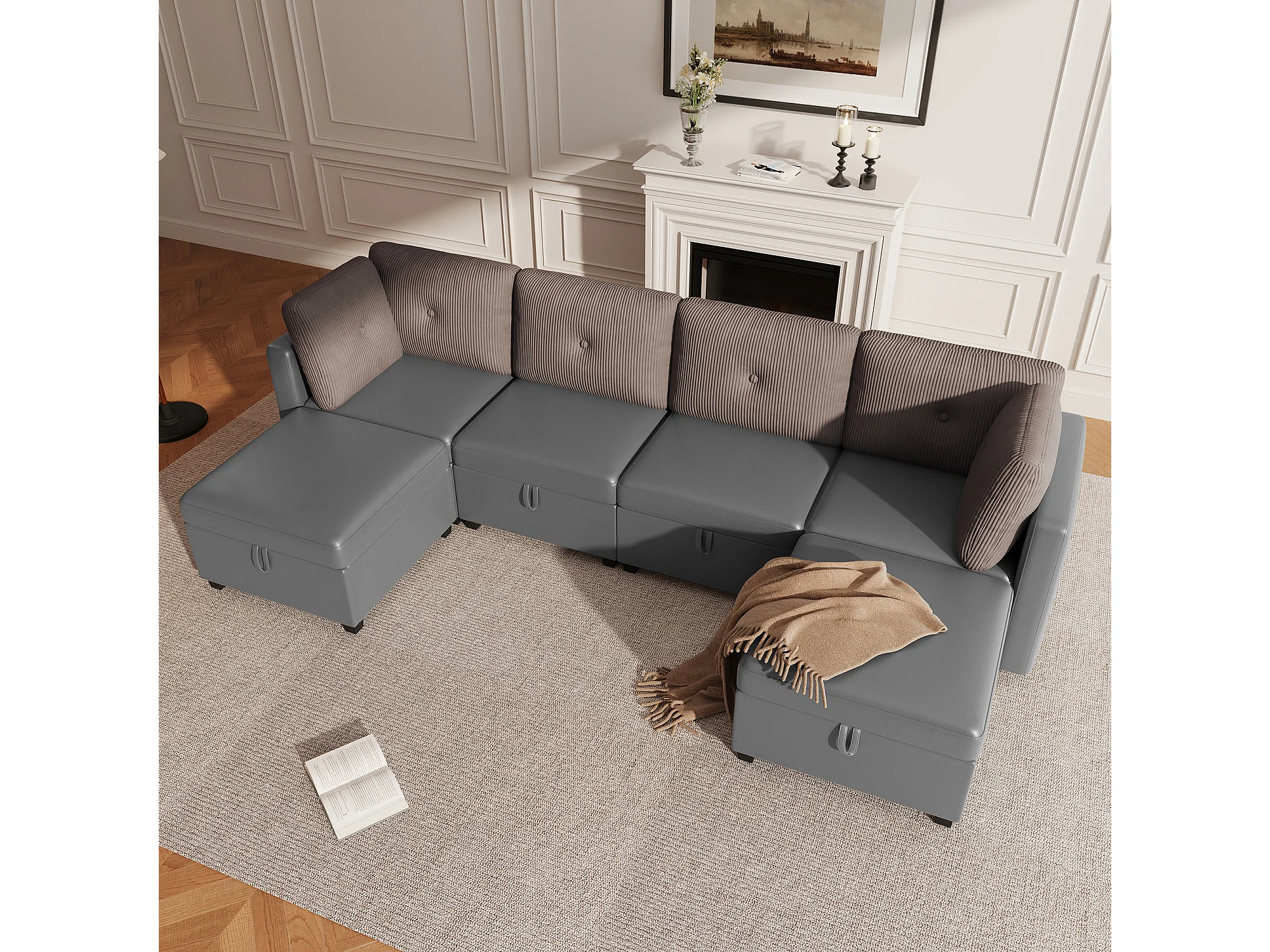 Canapé d'angle modulable 6 places - 261 x 132.5 x 85 cm - avec repose-pieds de rangement + coussins - velours - gris