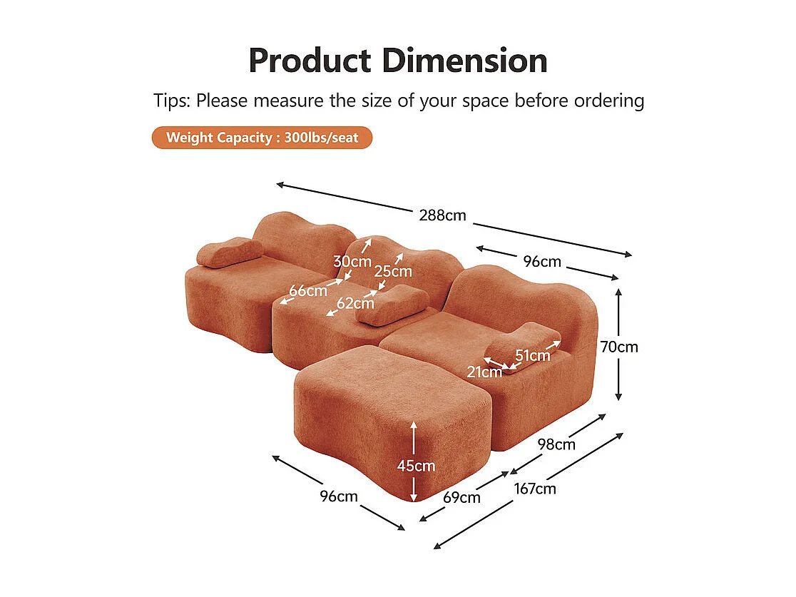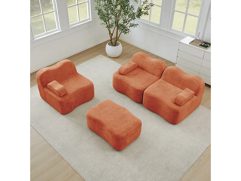 Canapé d'angle modulable en velours, avec pouf et coussin d'accoudoir, 288x167x70cm, Orange