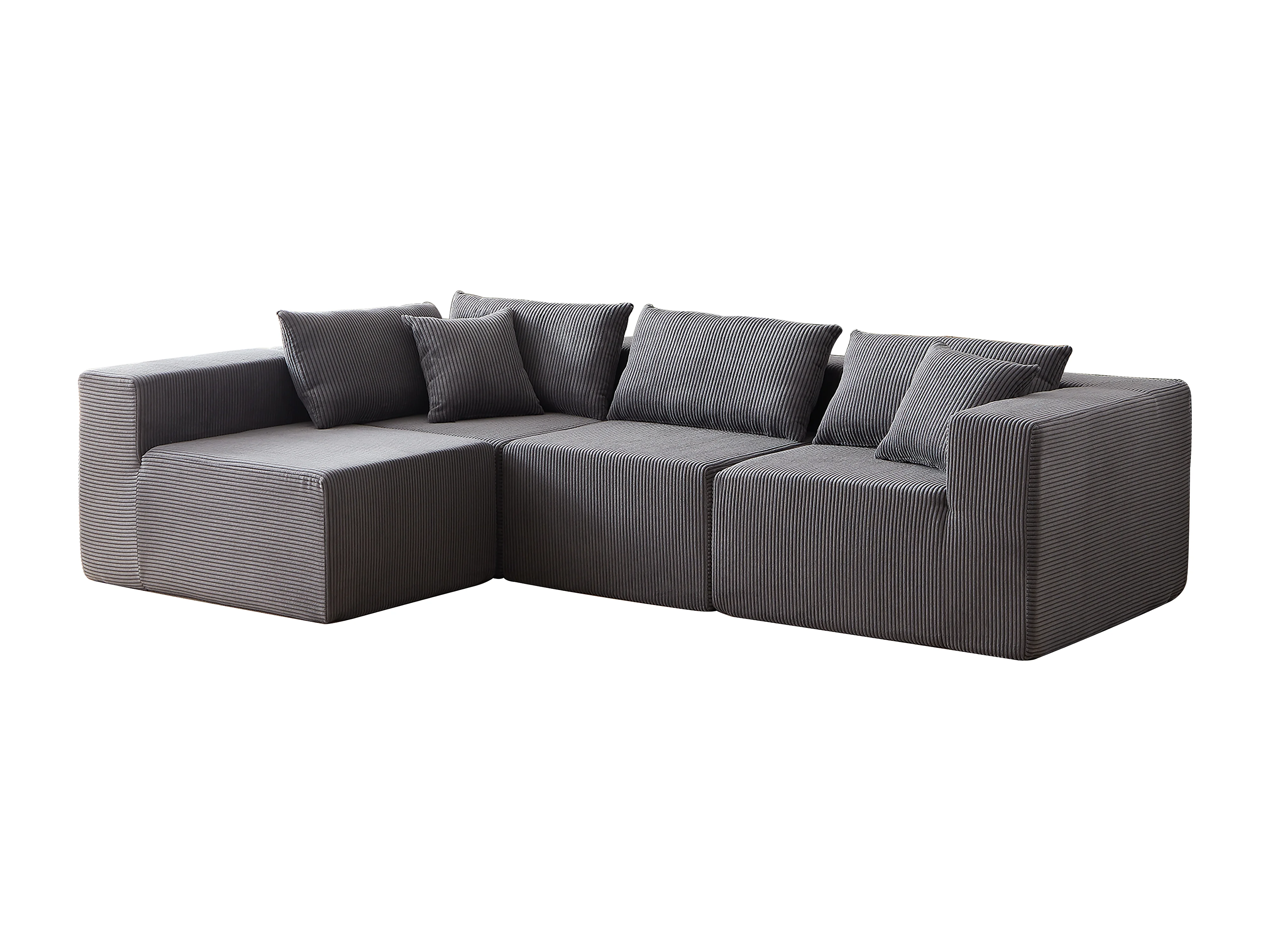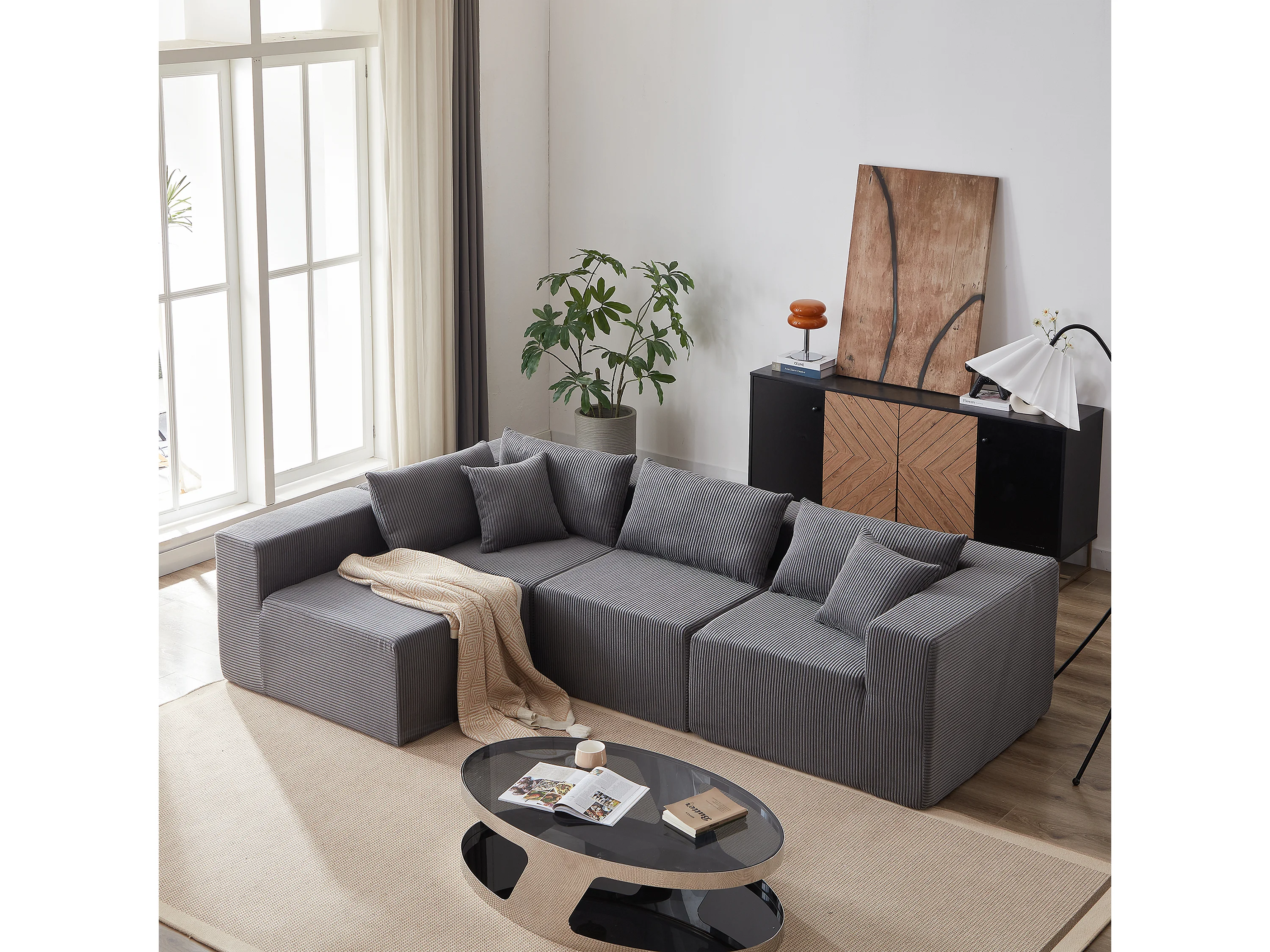 Canapé d'angle modulable - en Velours côtelé - 3/4 places - avec 3 coussins et 3 oreillers - Gris