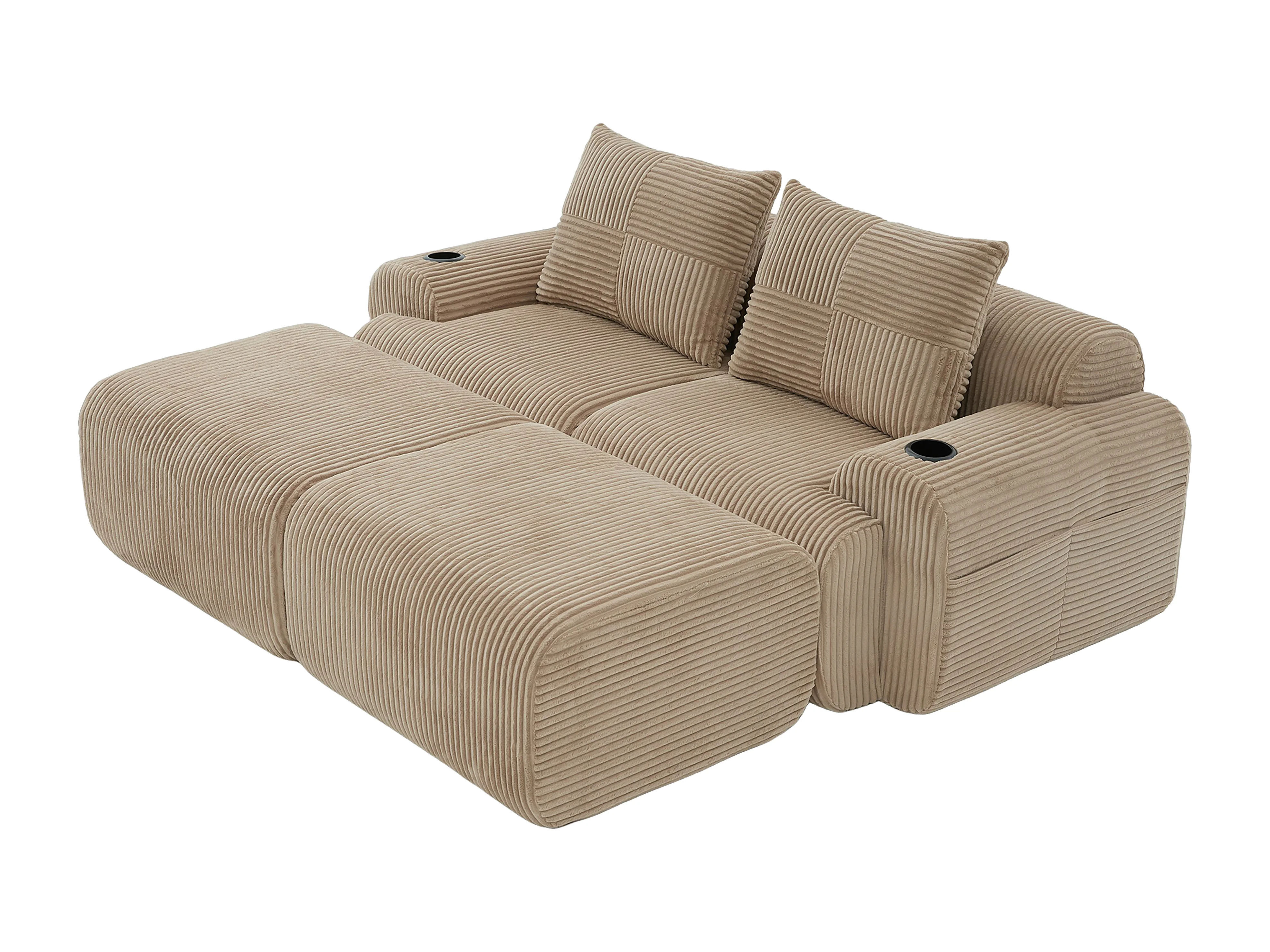 Canapé d'angle Modulable en Velours côtelé, avec porte-gobelets, 2 pouf et 2 coussins, 200x174x80cm, Kaki