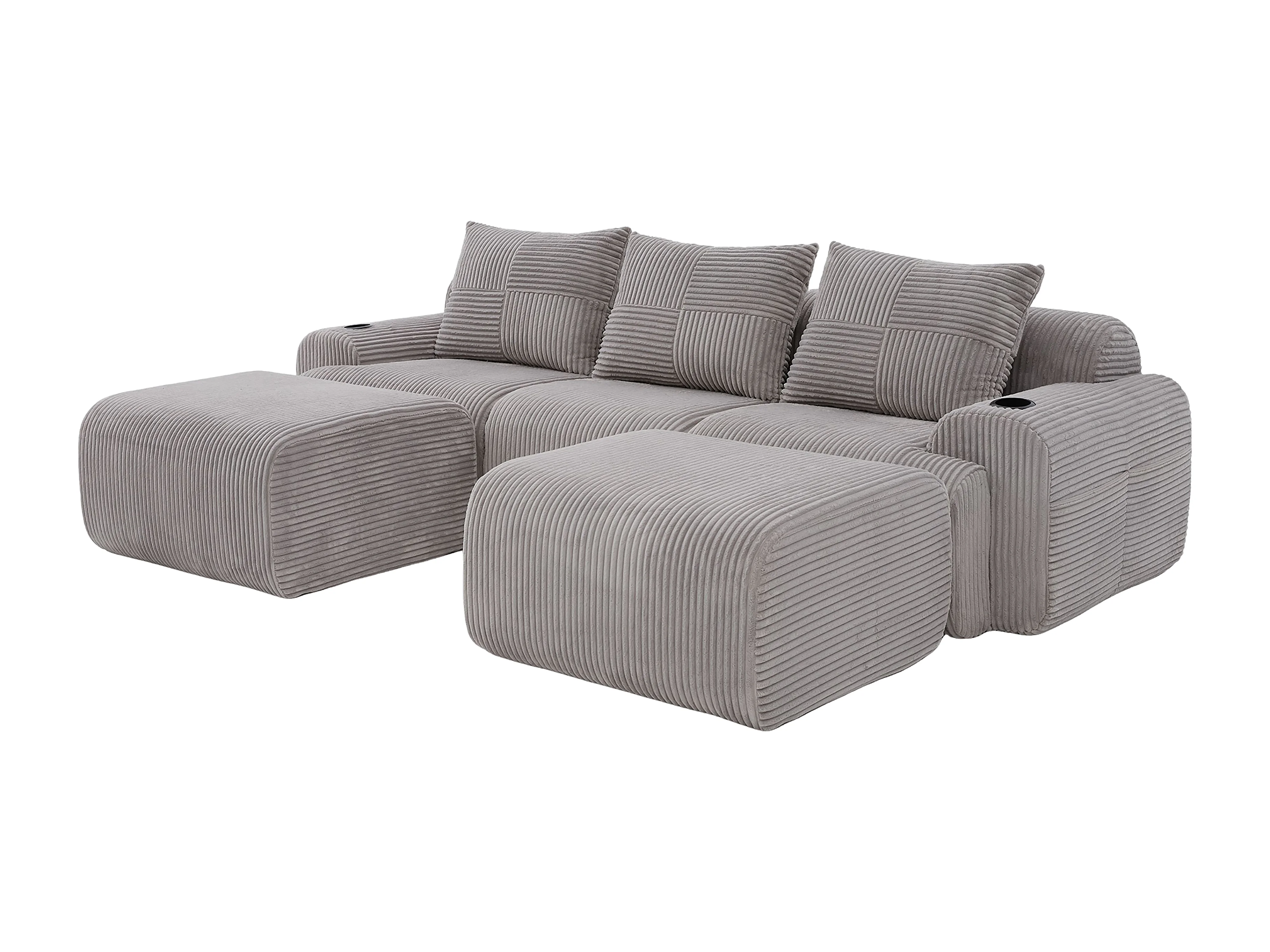 Canapé d'angle modulable en Velours côtelé, avec porte-gobelets, 2 pouf et 3 coussins, 268x174x80cm, Gris clair