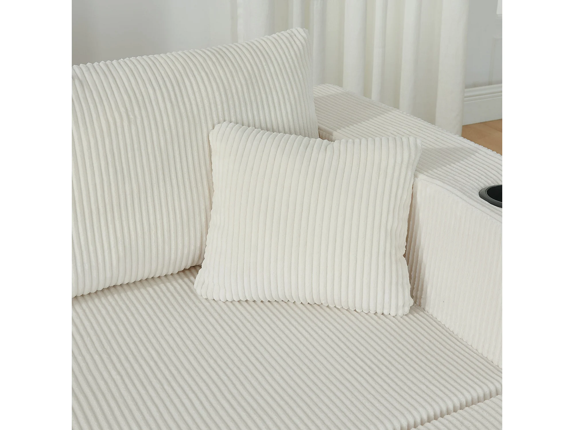 Canapé d'angle modulaire 3 places, compressé, avec ottoman, tissu velours côtelé, porte-gobelets, poche latérale et coussins, beige