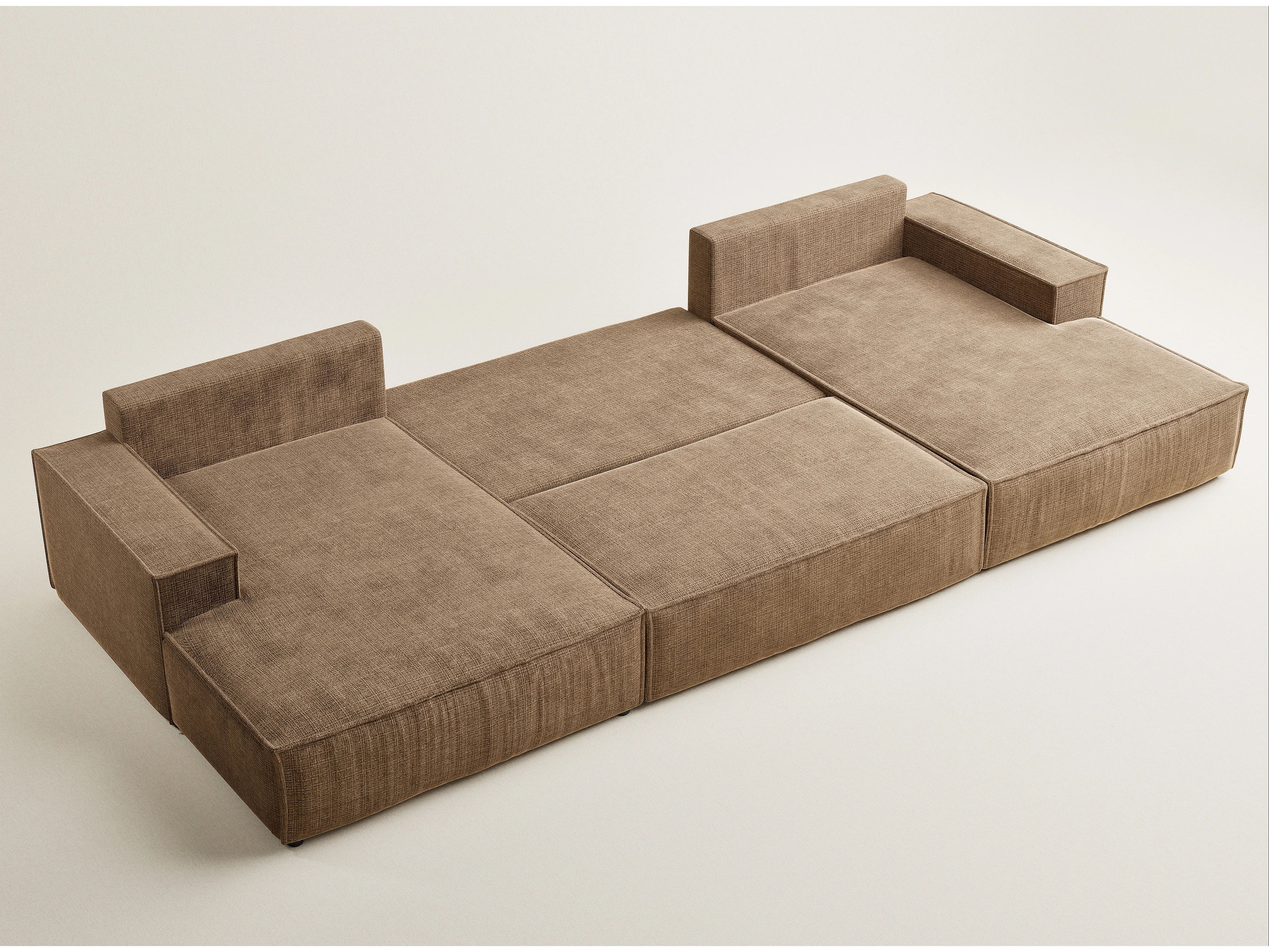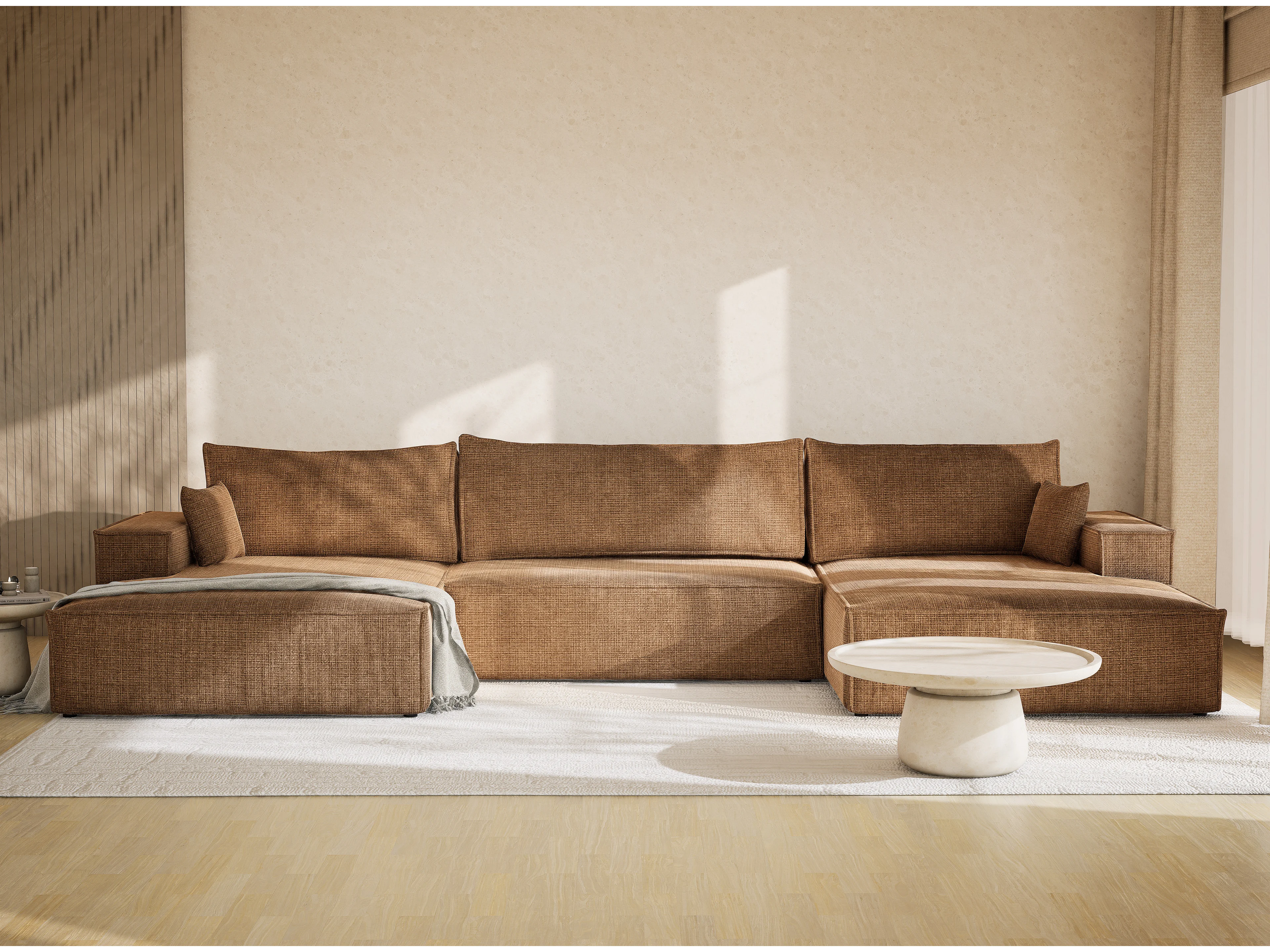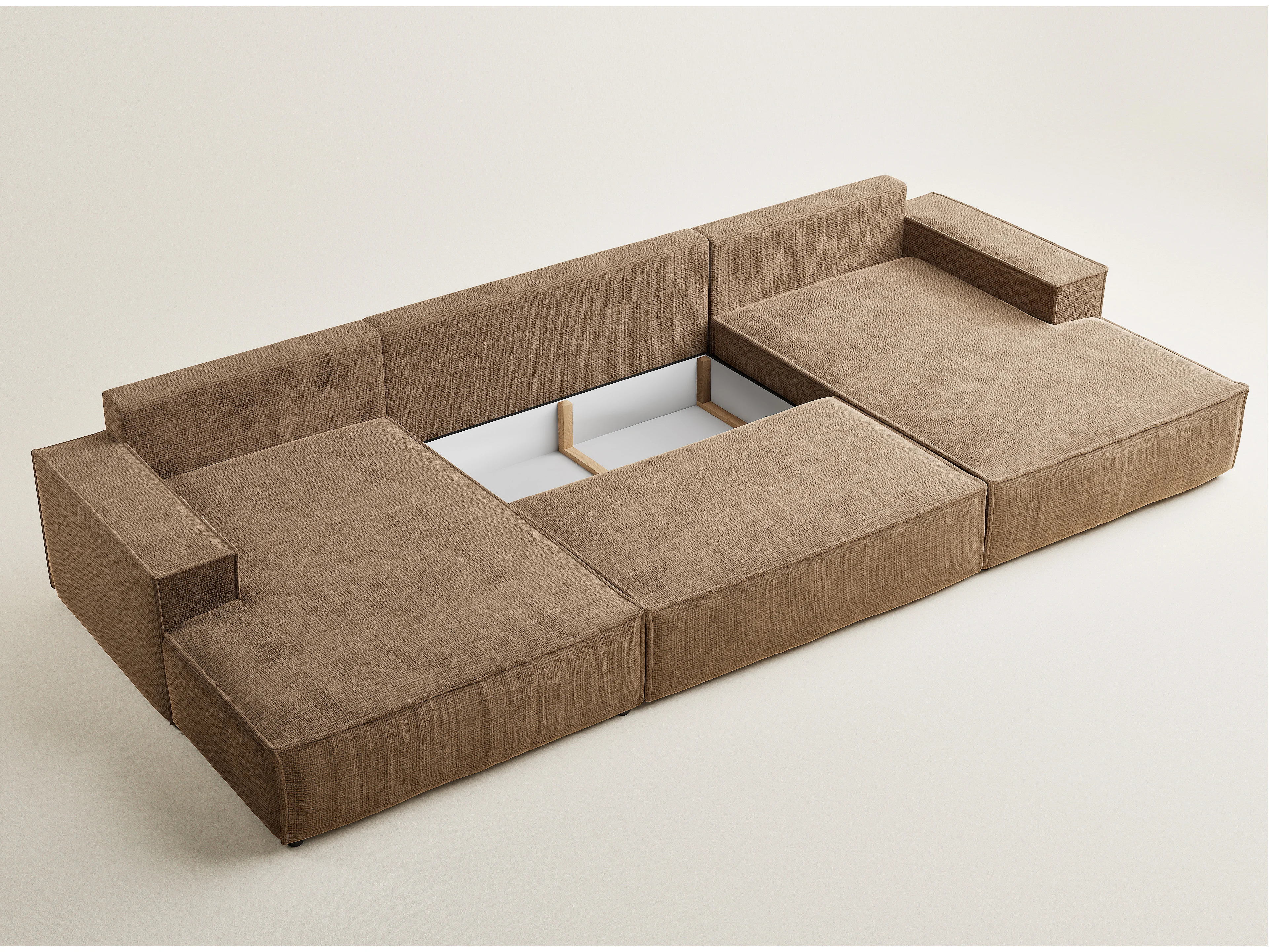 Canapé d'angle panoramique avec fonction lit en tissu chenille brun clair KYOTO
