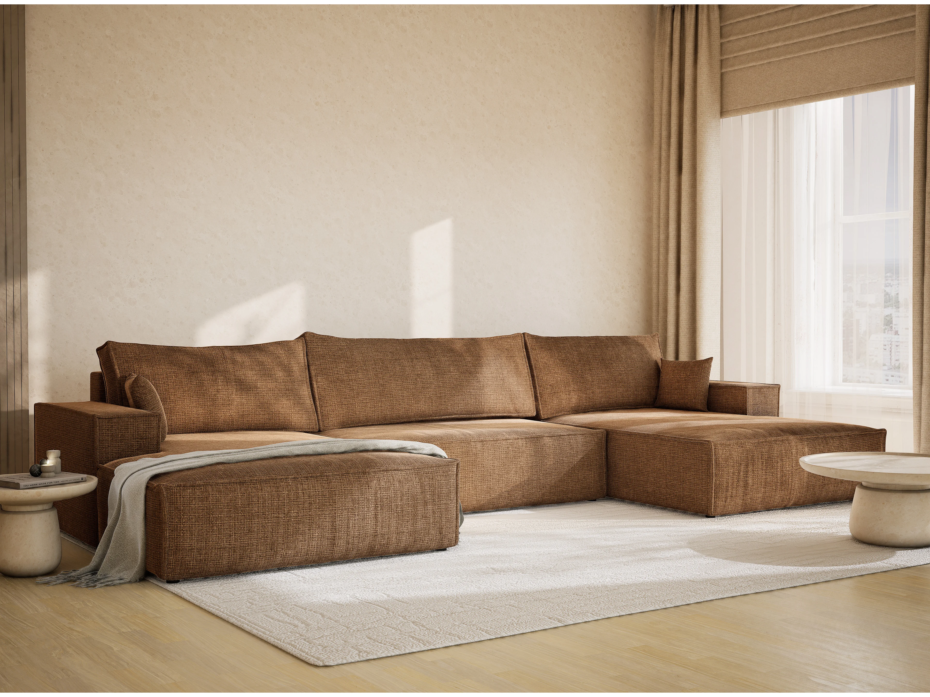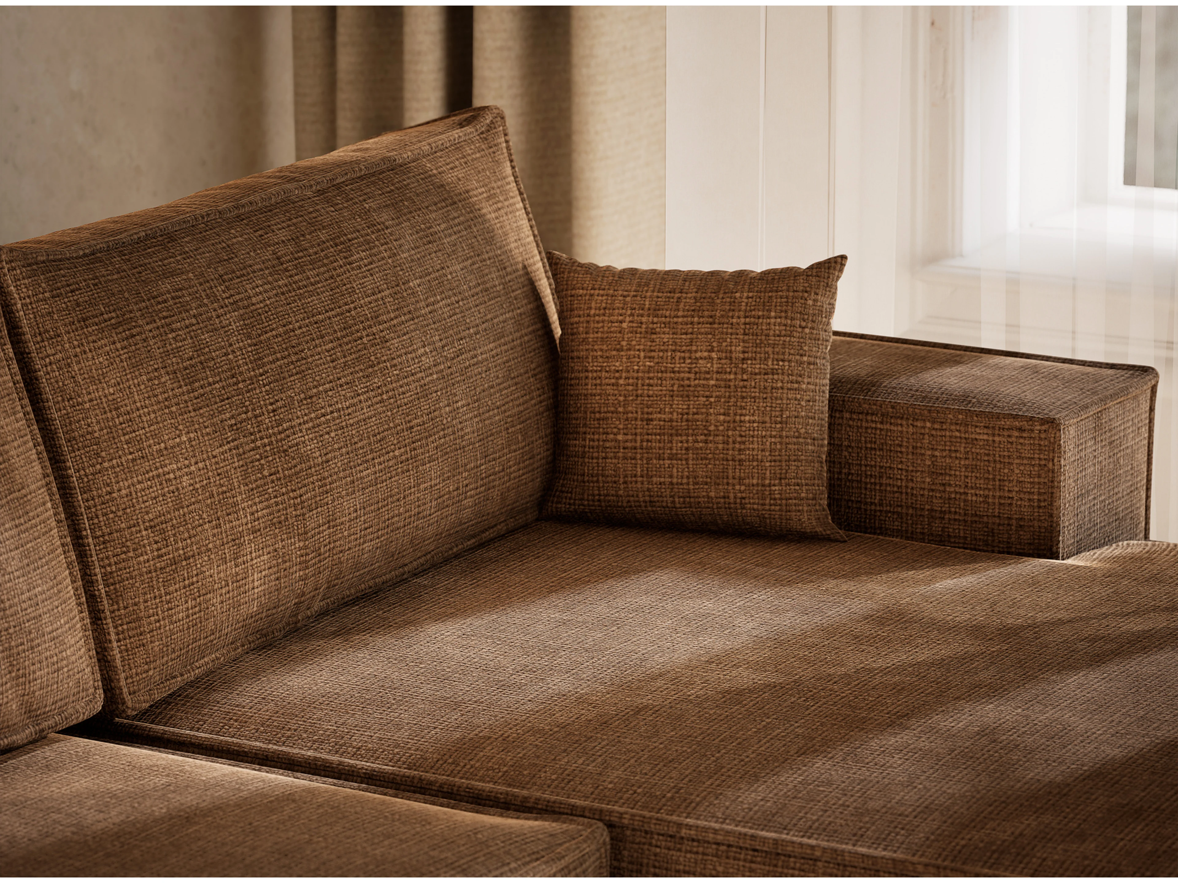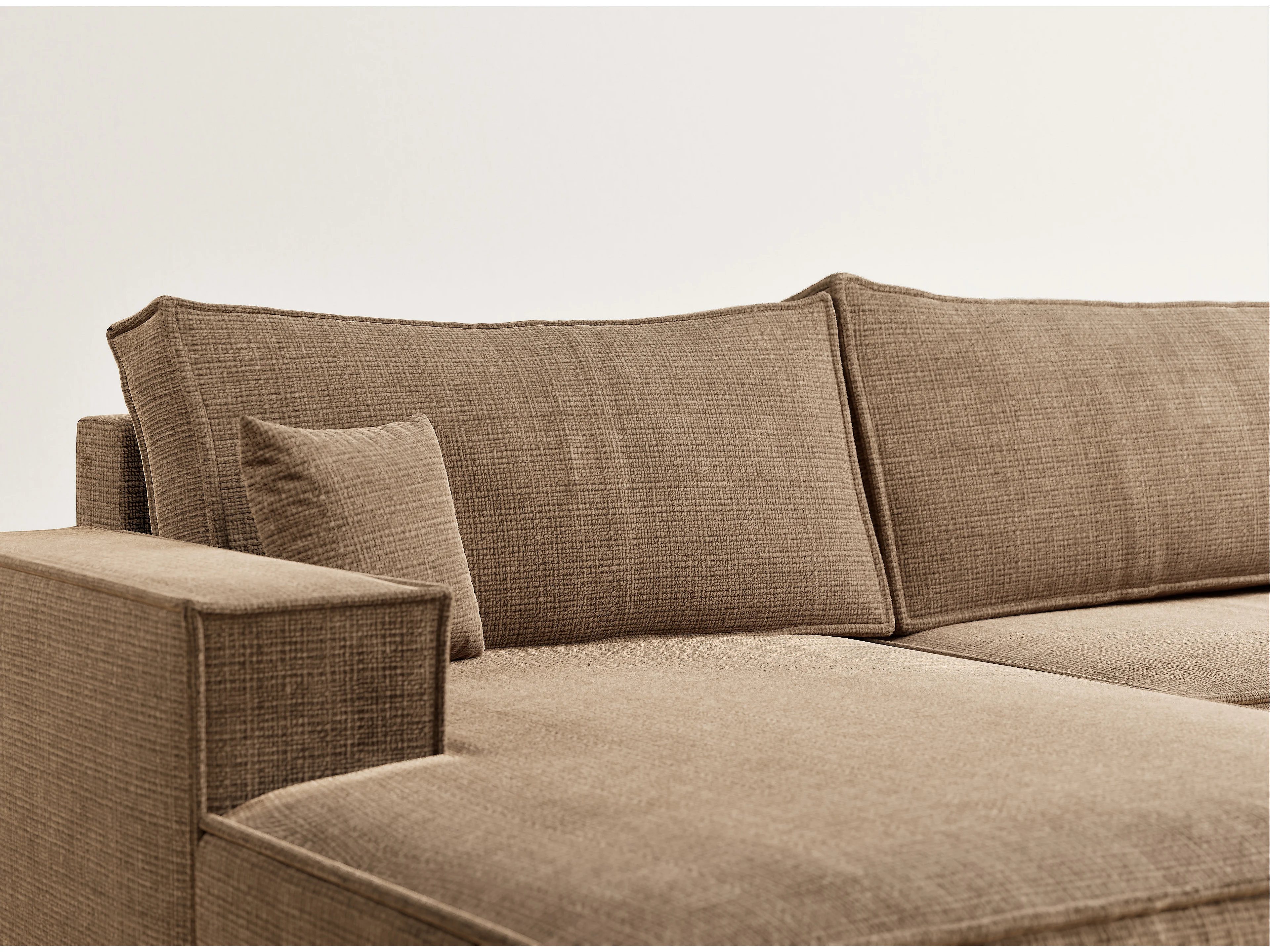 Canapé d'angle panoramique avec fonction lit en tissu chenille brun clair KYOTO